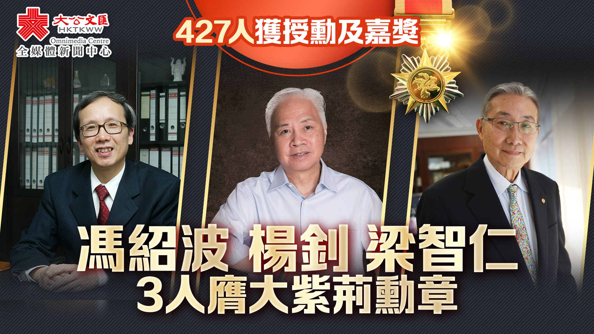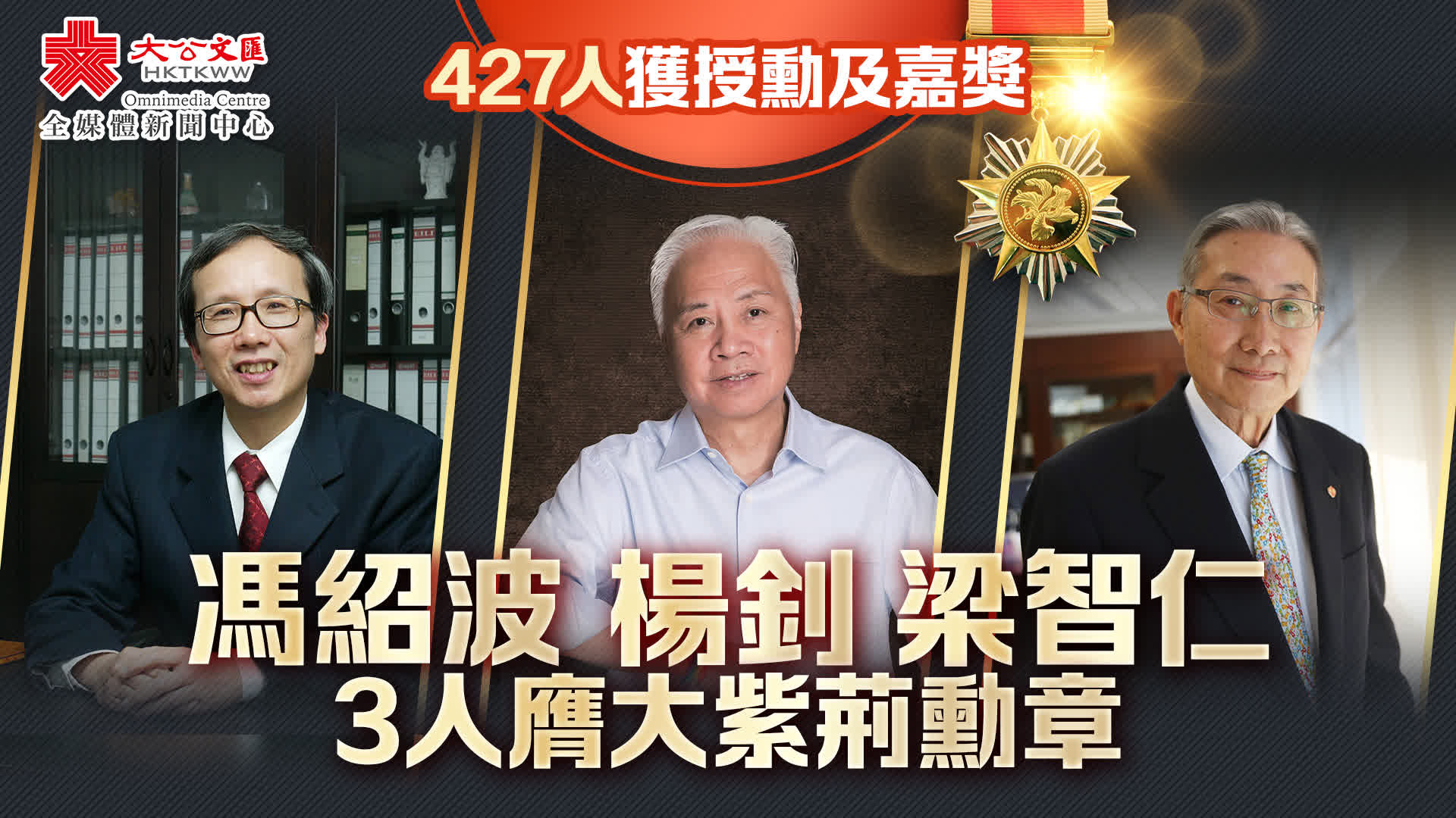 今次共3人膺大紫荊勳章,包括《香港經濟日報》集團主席兼創辦人馮紹波,香港旭日集團董事長、香港中華總商會永遠榮譽會長楊釗,前醫管局主席、香港公開大學榮休校長、香港大學榮休教授梁智仁。