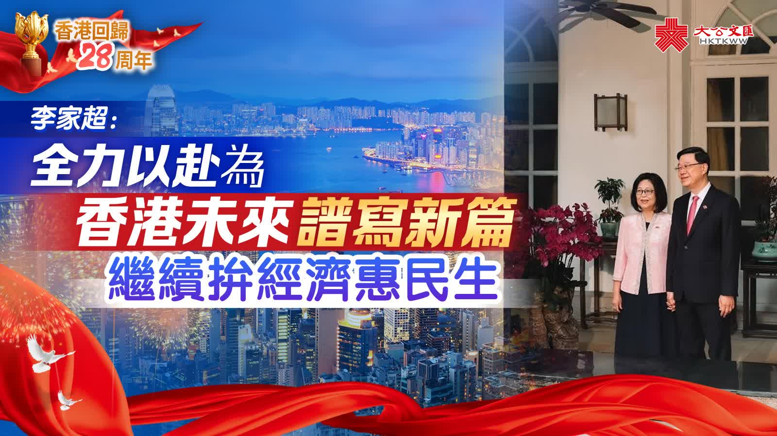 李家超及政府高層官員今早出席慶祝香港特別行政區成立28周年升旗儀式和慶祝酒會,升旗儀式上午8時在灣仔香港會議展覽中心外的金紫荊廣場舉行。升旗儀式結束後,特區政府在會展三樓大會堂舉行慶祝酒會,李家超為酒會主禮。