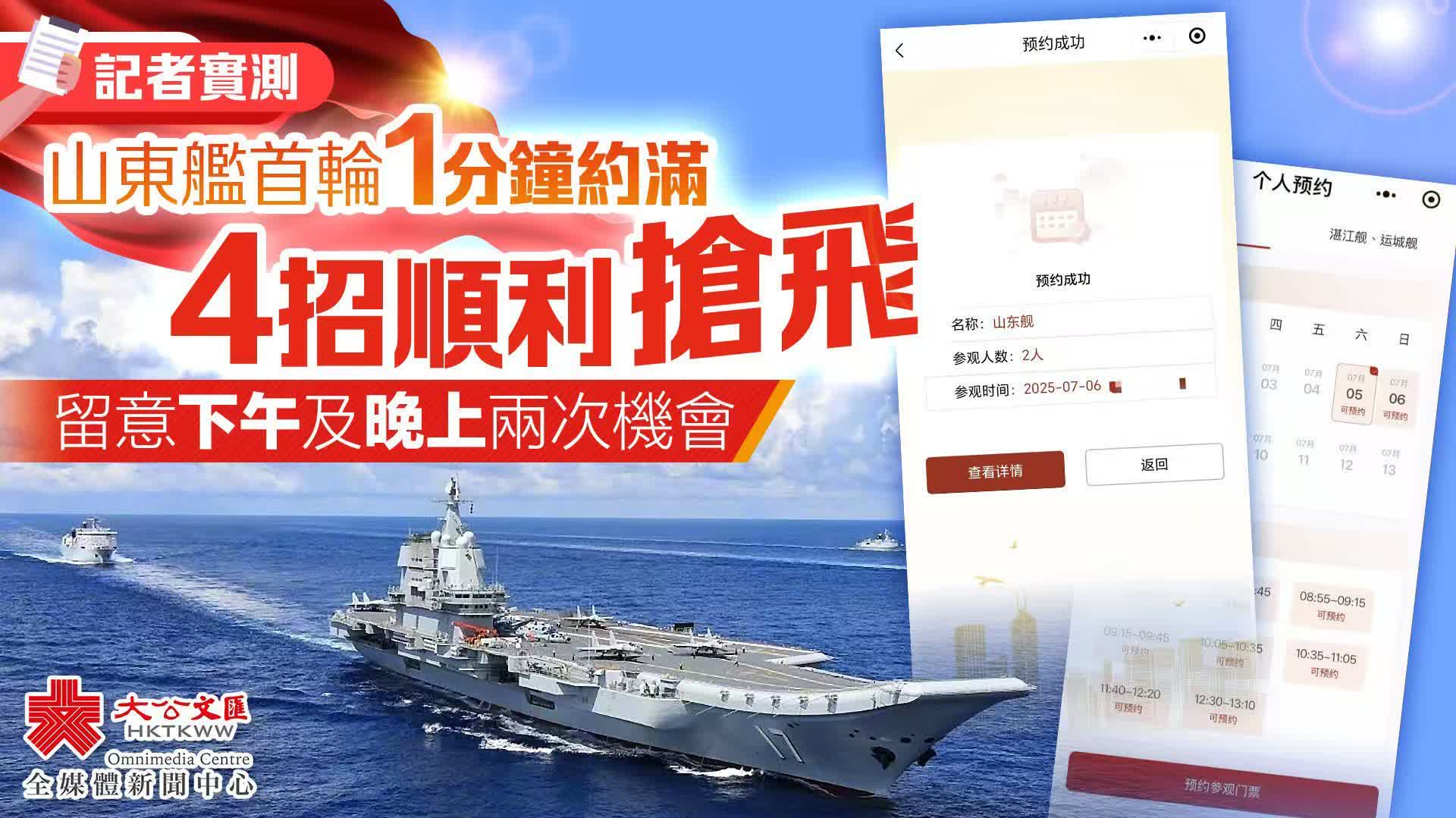 大公文匯全媒體報道,今年是香港回歸祖國28周年,為慶祝這一盛事,7月3日至7日,由航空母艦山東艦,導彈驅逐艦延安艦、湛江艦,導彈護衛艦運城艦組成的海軍艦艇編隊將訪問香港,其間組織系列開放參觀和文化交流活動。本次艦艇開放活動,通過WeChat(微信)駐香港部隊官方公眾號「香江礪劍」線上發放參觀票10000張,其中:山東艦2000張,湛江艦、運城艦8000張。