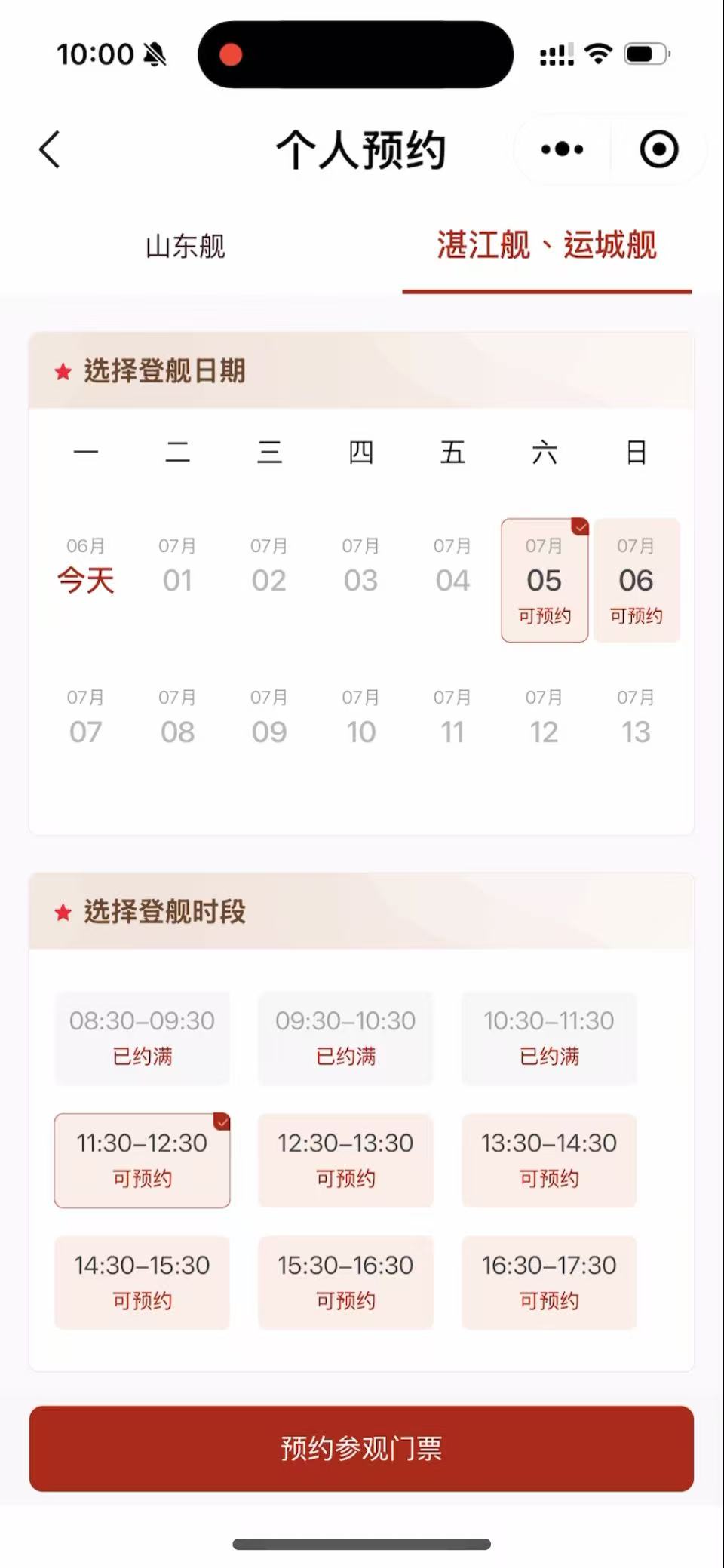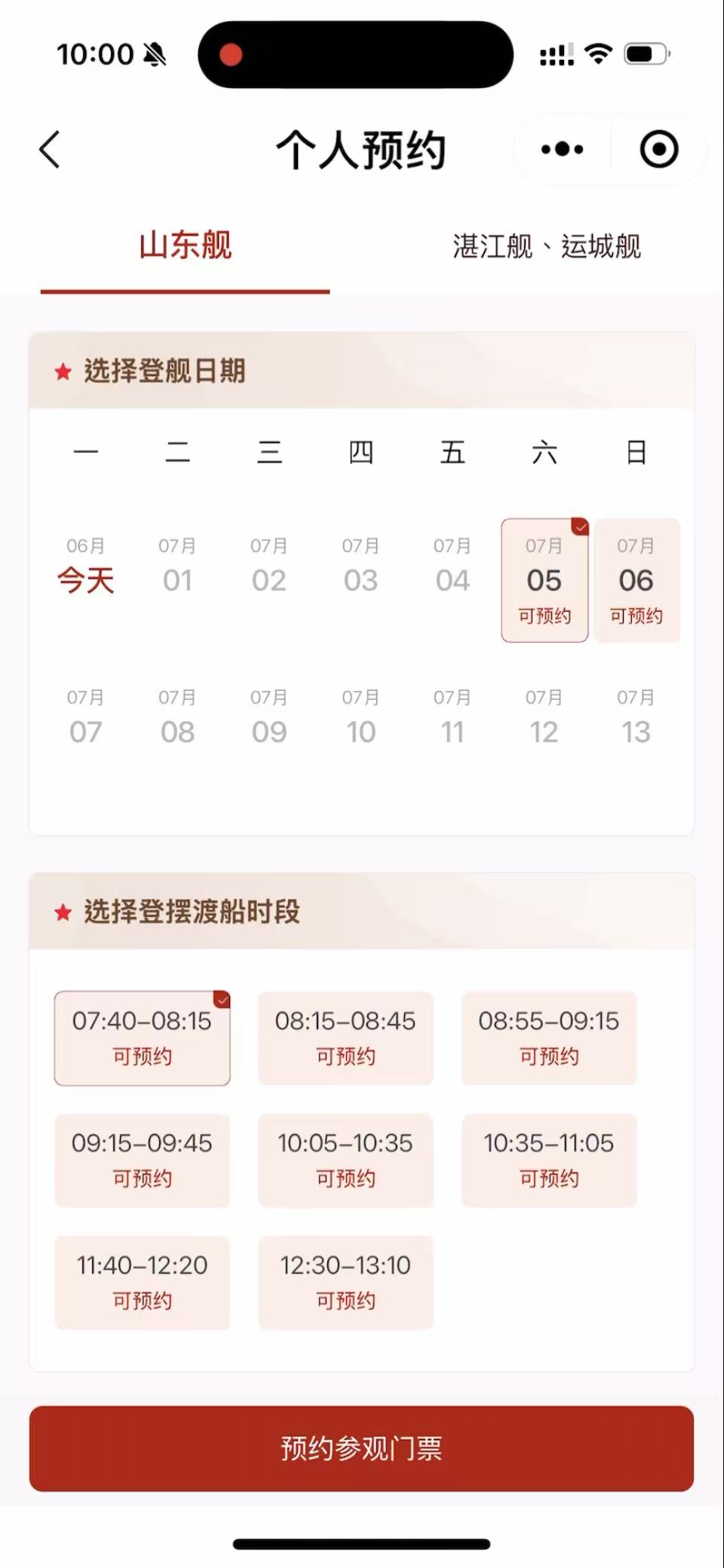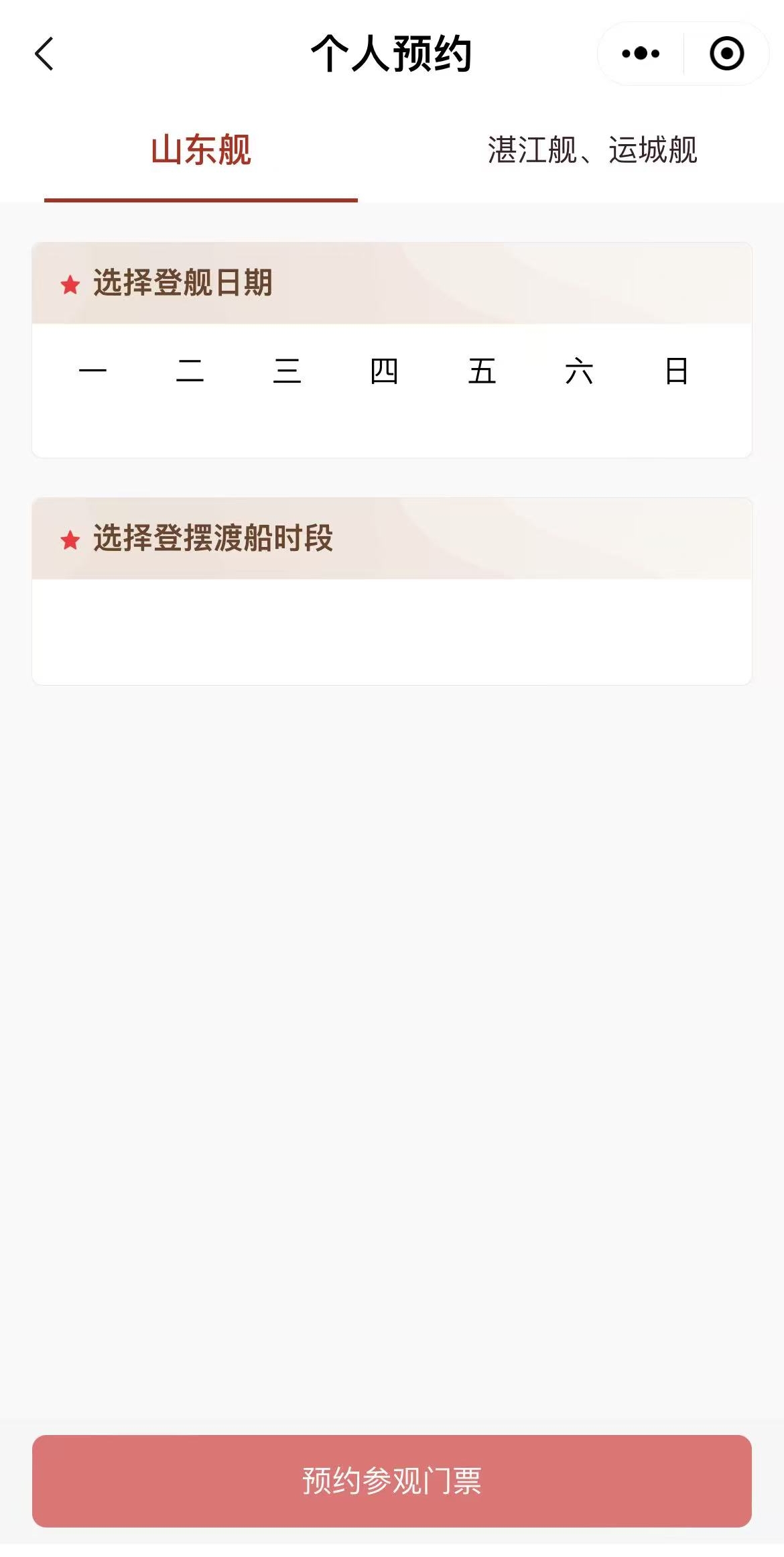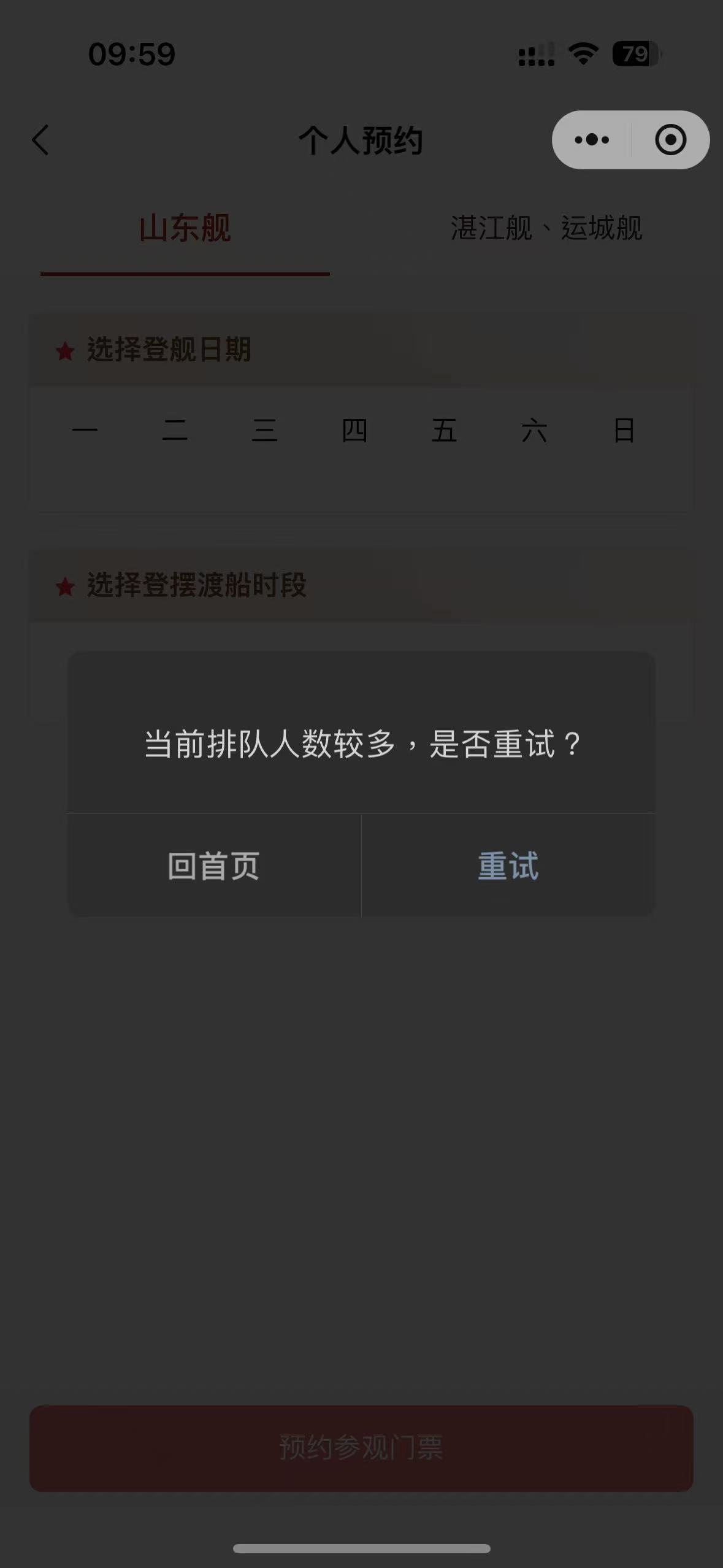 3.提前進入界面,點擊個人預約頁面的「山東艦」或「湛江艦、運城艦」即可進行刷新。臨放票時系統或會顯示「當前排隊人數較多,是否重試」,請不斷點擊「重試」直至進入頁面,並快速選取目標日期及時間。