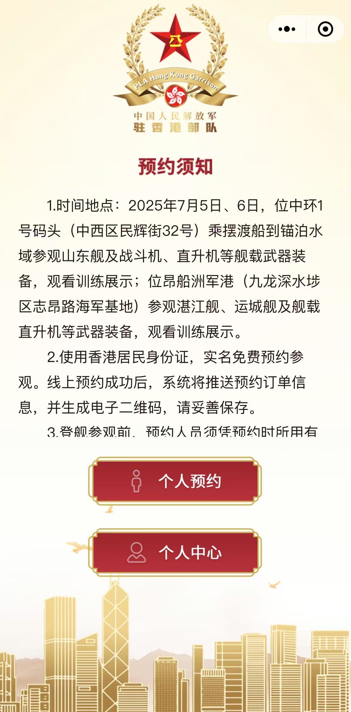 1.預約系統顯示,開放參觀的對象為香港居民,內地居民或澳門居民暫時無法預約。使用香港居民身份證或香港永久性居民身份證,即可實名免費預約參觀,一次最多預約兩張門票。線上預約成功後,系統將推送預約訂單信息,並生成電子二維碼。