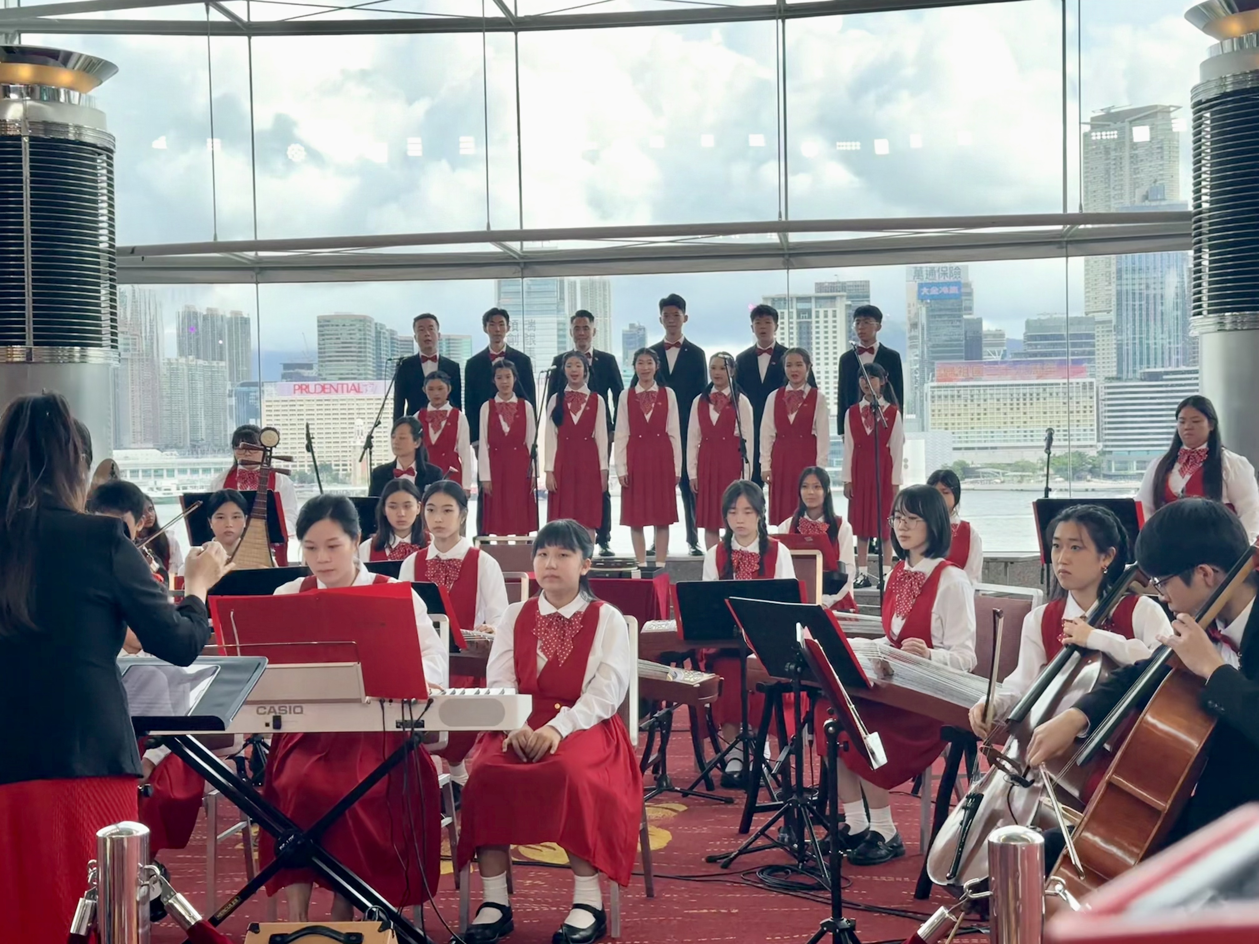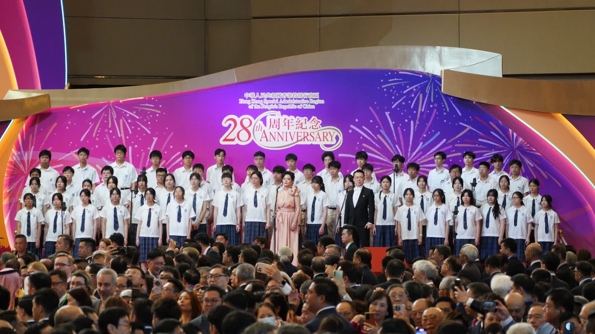 酒會伊始,香港青年弦樂團及香港青年中樂團合奏重新編排的經典金曲,《金蛇狂舞》、《萬水千山總是情》等經典旋律響起,體現年輕人的家國情懷及港人自強不息的精神,為紀念日增添喜悅氣氛。
