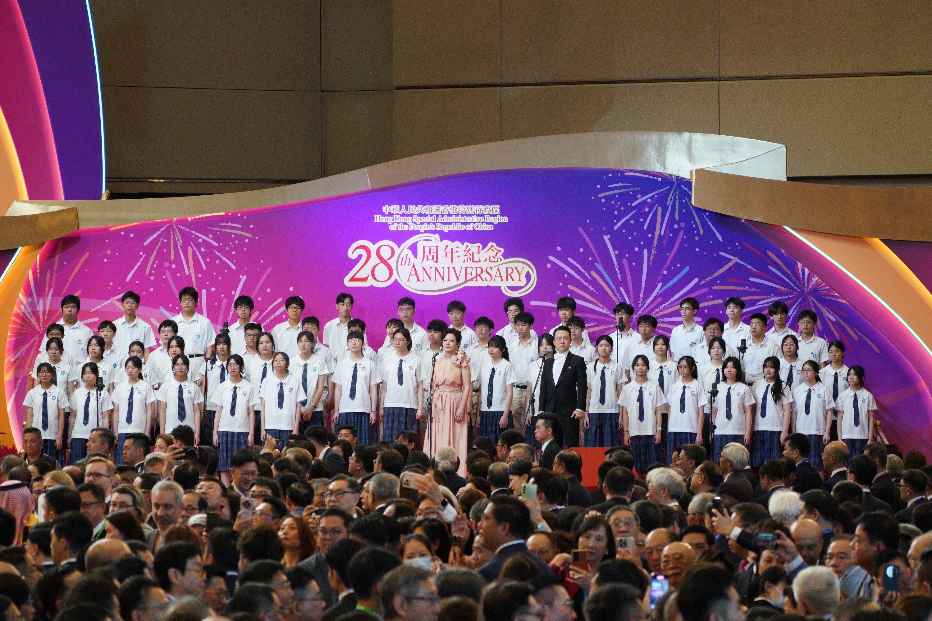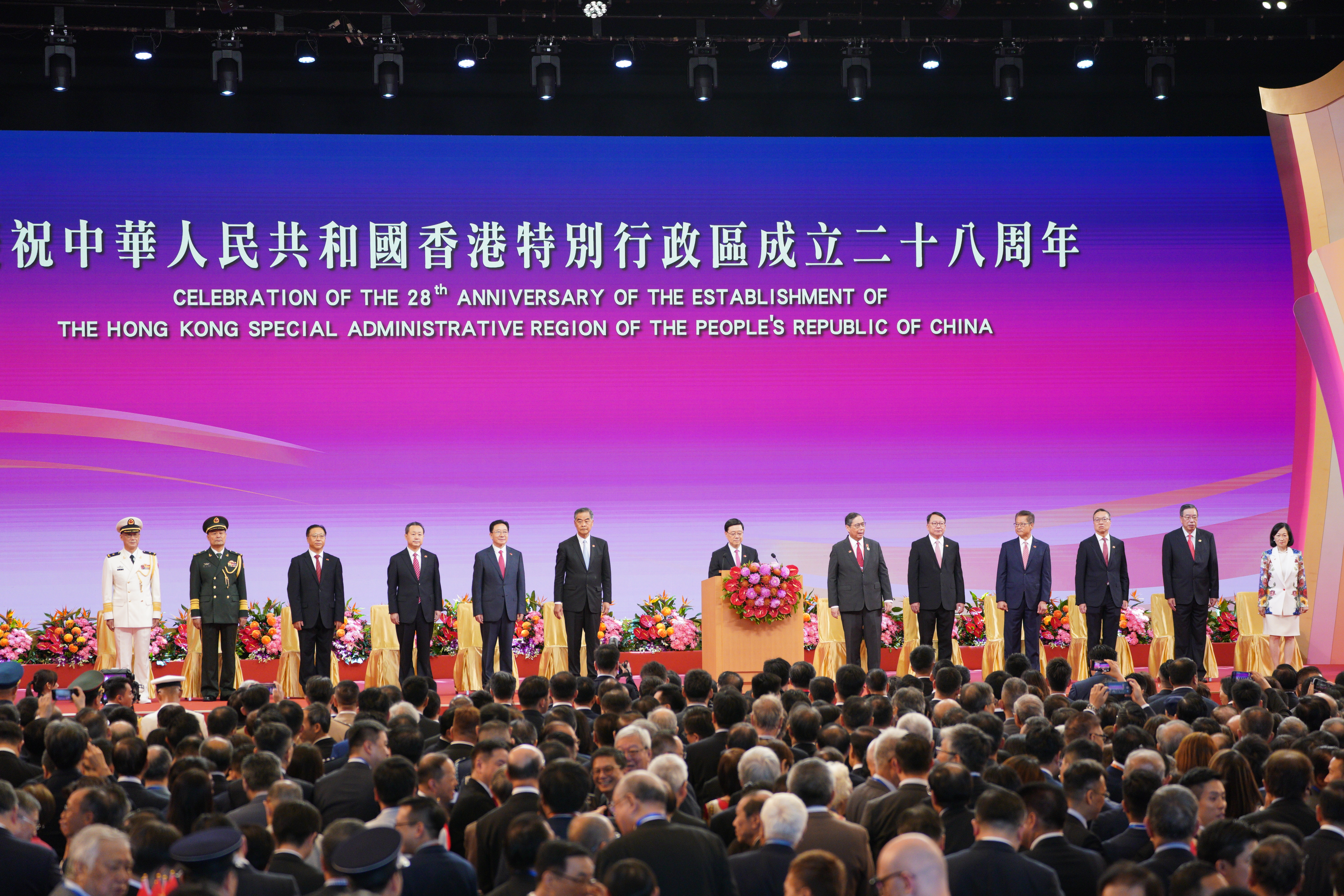 行政長官李家超、全國政協副主席梁振英、中央政府駐港聯絡辦主任周霽、駐港國家安全公署署長董經緯、外交部駐港特派員公署特派員崔建春等共同為酒會祝酒,慶祝香港回歸祖國28周年這一喜慶日子。