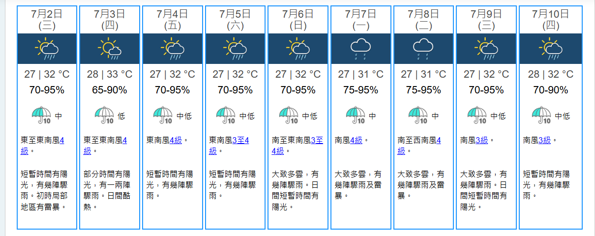 據天文台9日天氣預報,本港接連9日都有概率下雨,多為驟雨及雷暴。
