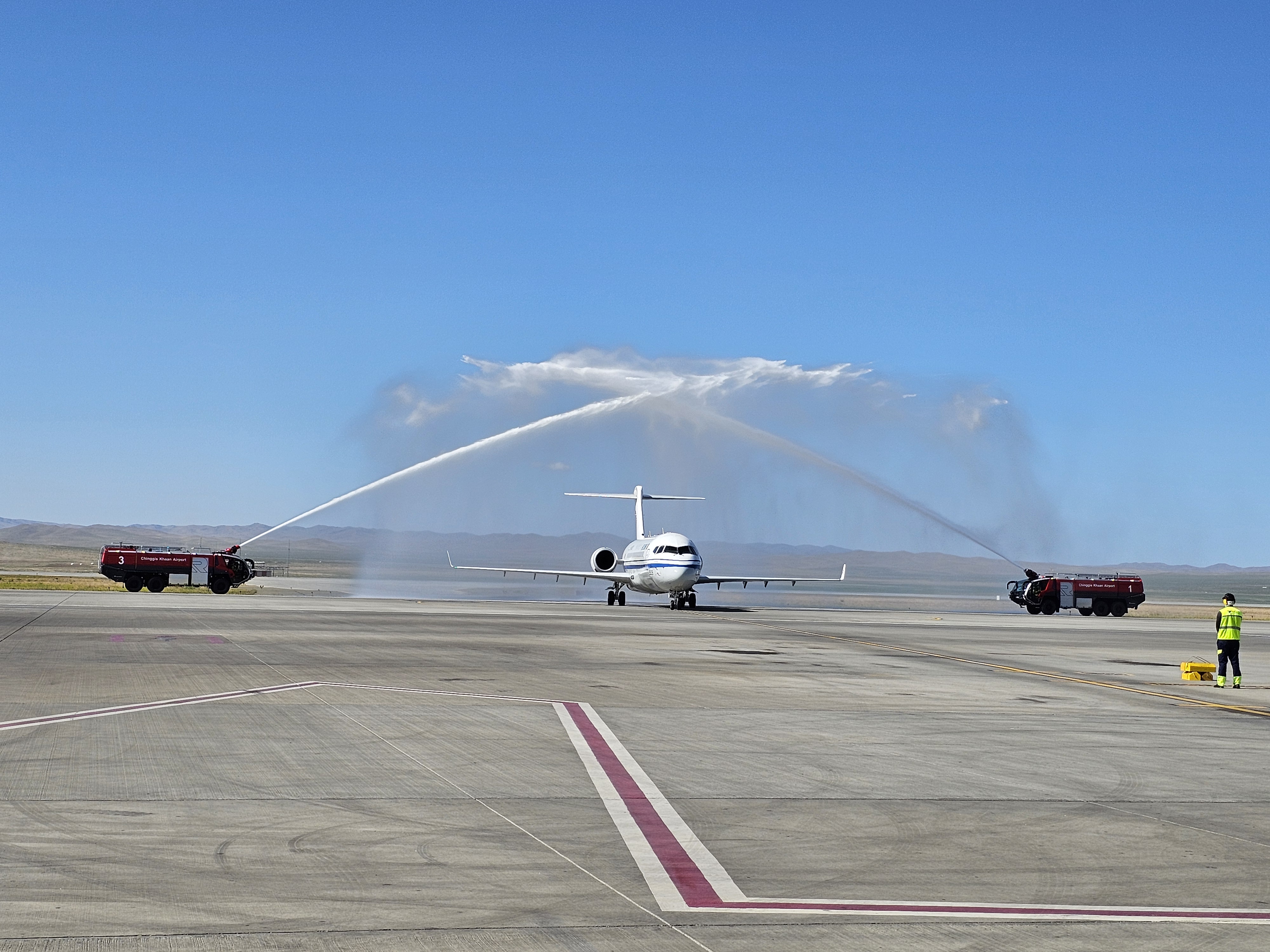 當C909客機平穩降落,烏蘭巴托機場以民航界最高禮遇「水門儀式」相迎,為國航C909「接風洗塵」,禮儀人員身着民族服飾,手持哈達和奶乾迎接旅客及機組人員。