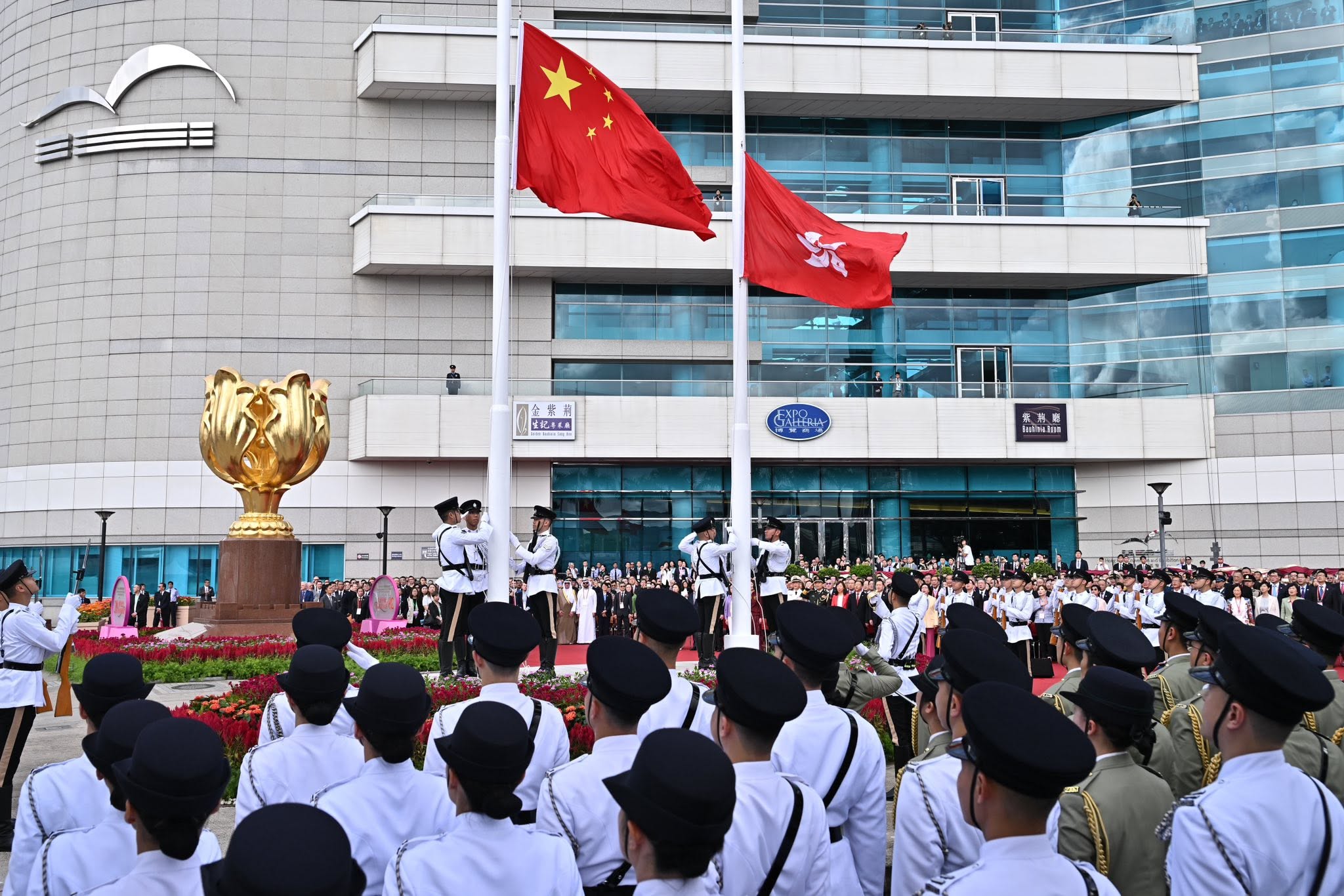 大公文匯全媒體報道,今日(7月1日)是香港回歸祖國28周年的喜慶日子。民青局今日在社媒發文分享,民政及青年事務局局長麥美娟聯同民青團隊一早去到金紫荊廣場,參與七一回歸升旗儀式。儀式期間,全體觀禮嘉賓面向國旗肅立,高唱國歌。在激昂的國歌聲中,中華人民共和國國旗與香港特別行政區區旗冉冉升起,迎風飄揚。