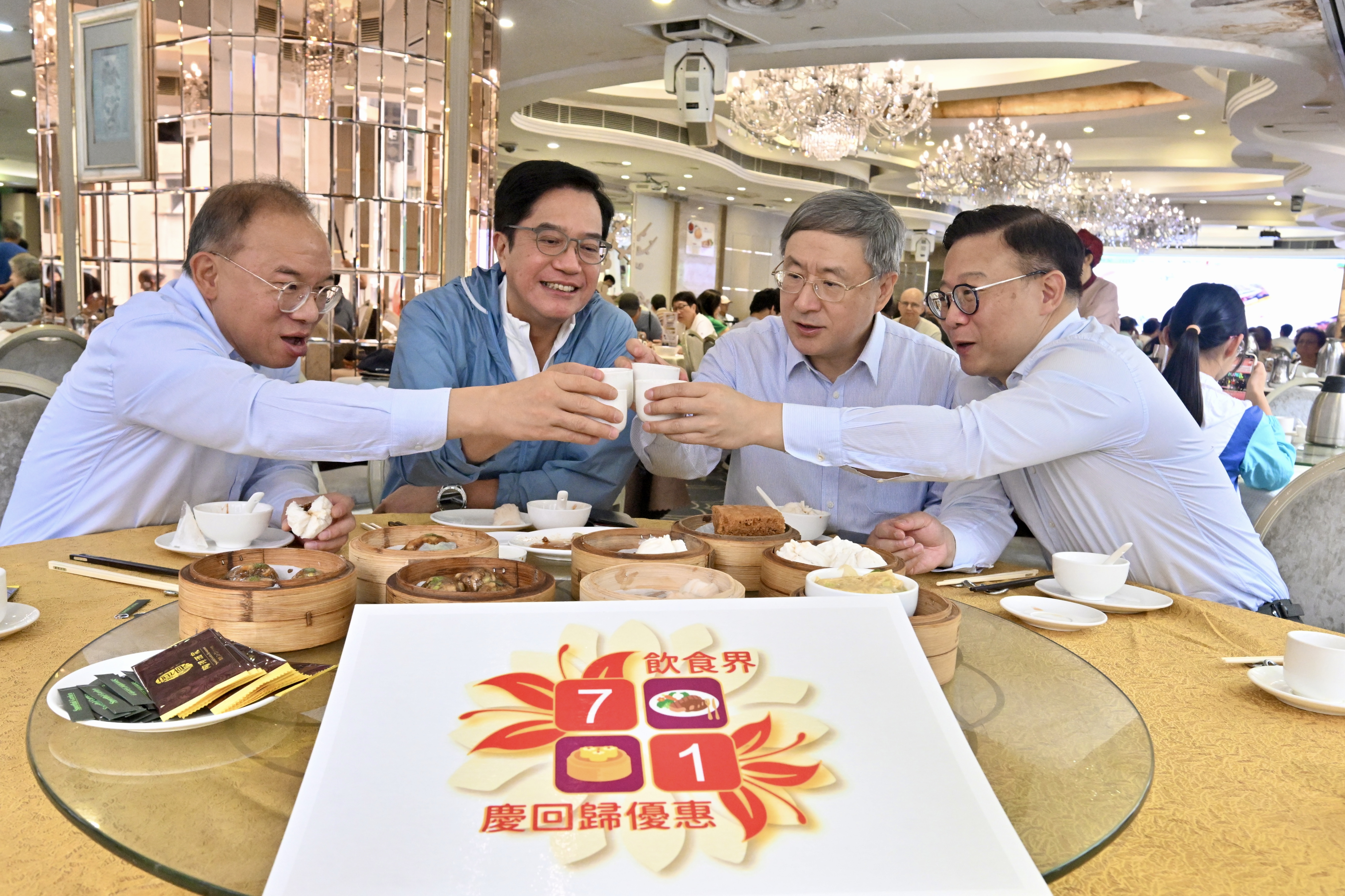 政務司副司長卓永興、財政司副司長黃偉綸、律政司副司長張國鈞和政制及內地事務局局長曾國衞今日出席香港特別行政區成立28周年升旗儀式和酒會後,一齊到灣仔一家酒樓飲茶,享用慶祝特區成立誌慶的飲食優惠,共慶回歸。