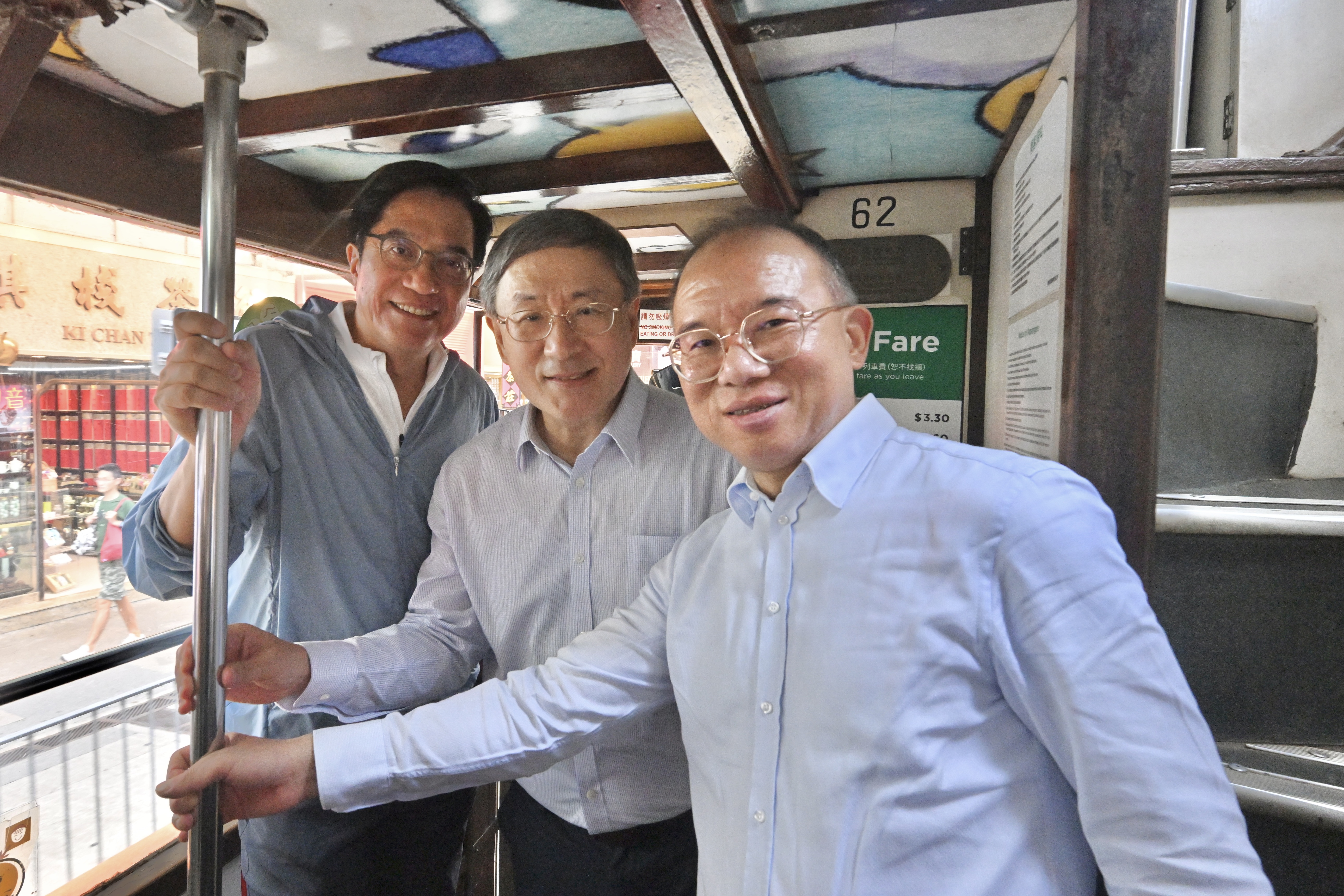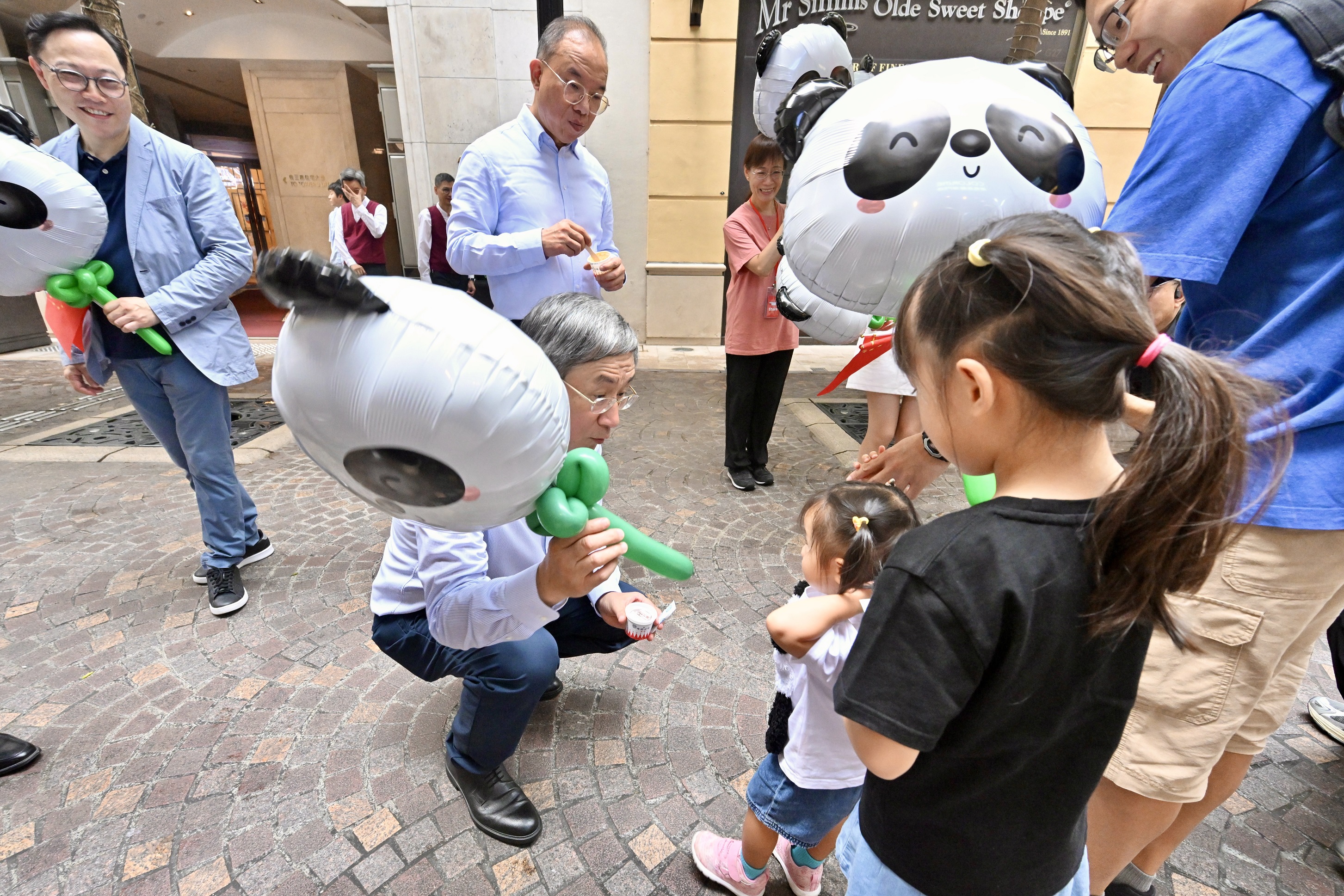 飲茶後,卓永興、黃偉綸和曾國衞享用免費乘搭電車日優惠到利東街,感受商場免費派發雪糕、爆谷及熊貓造型氣球所增添的節日歡欣。