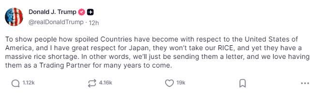 據報道,特朗普當天在社交媒體上發文說,「我對日本懷有極大的敬意,他們卻不願進口我們的大米,而他們自己正面臨嚴重的米荒。換句話說,我們只需要發一封信(就能解決)。我們願在未來多年裏讓他們繼續做貿易夥伴。」