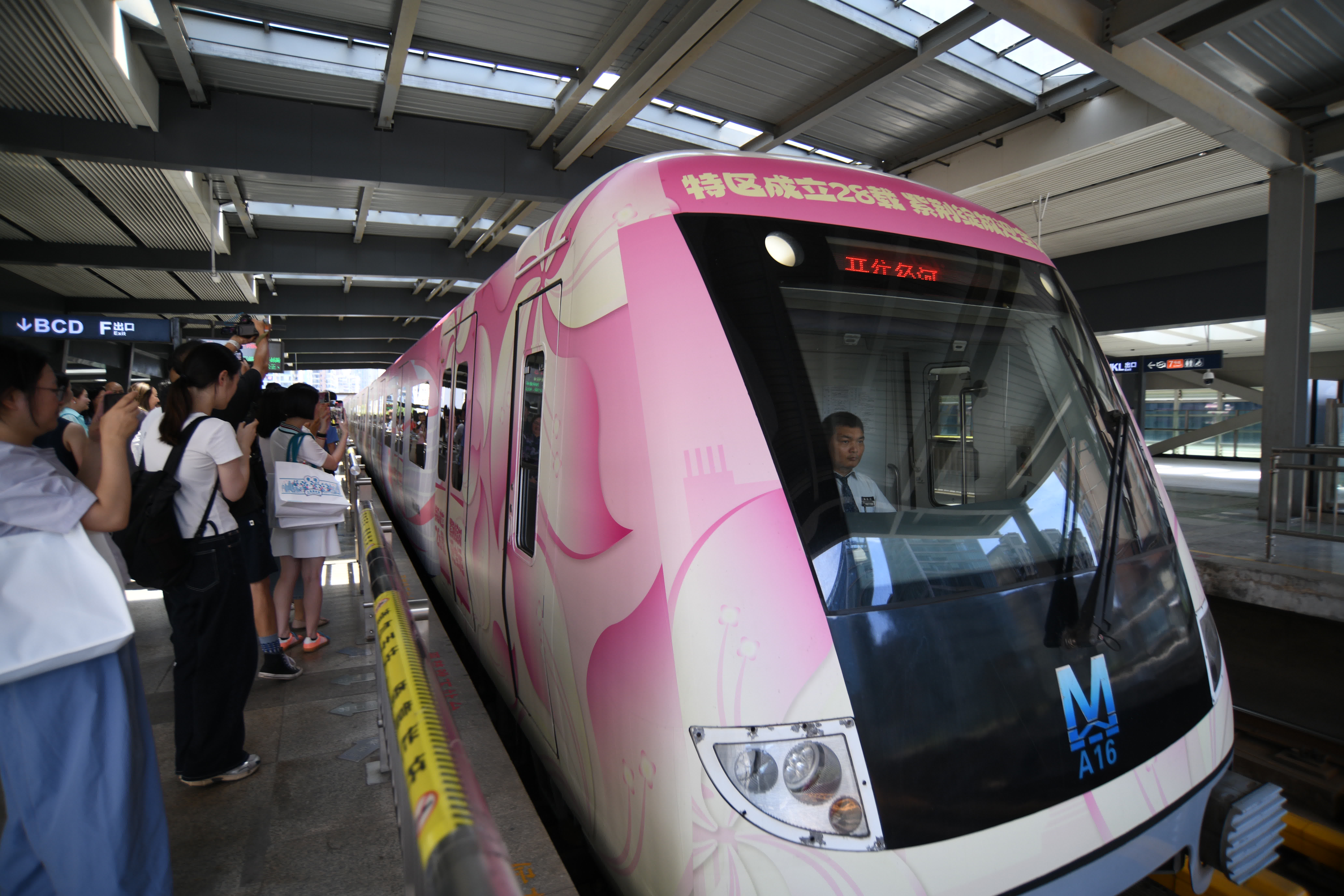 記者看到,「紫荊專列」地鐵車身呈粉紅色,這是香港特別行政區區花紫荊花的顏色,車身之外,武漢地鐵多座核心站點同步上線電子屏聯動及主題燈箱,慶祝香港回歸28周年的城市畫面與香港全運賽區風貌遙相呼應。