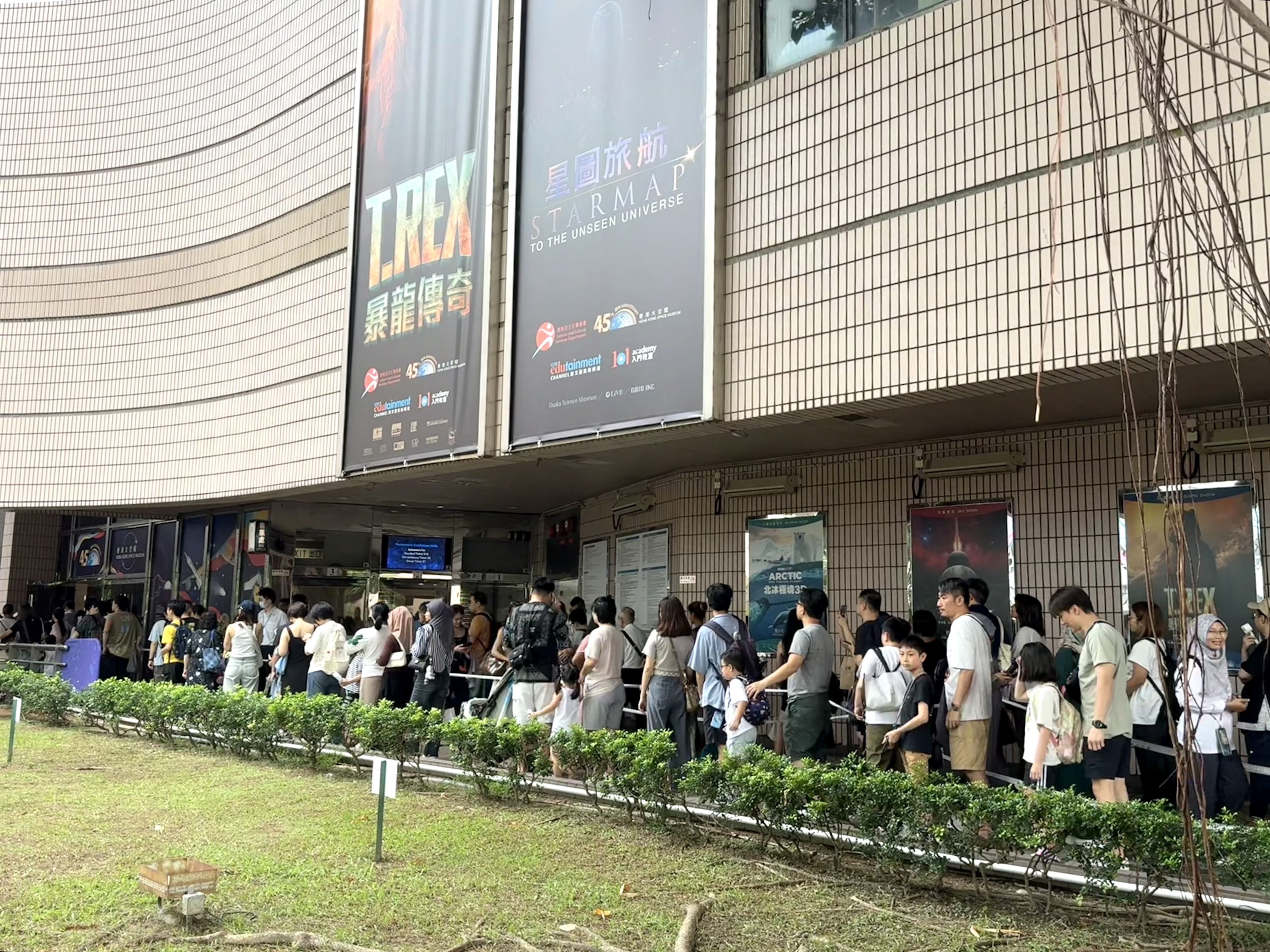 香港太空館的常設展覽(天象廳節目除外),今日同香港故宮文化博物館、M+博物館等文化地標一齊免費對外開放,成為親子打卡的大熱目的地。記者在香港太空館外見到大批市民、遊客帶子女一起排隊等候入場,儘管門口設立「在此排隊進入太空館需時30分鐘」的公告牌,大家依然熱情不減,不斷有人加入隊伍,希望能夠帶小朋友參觀展覽。