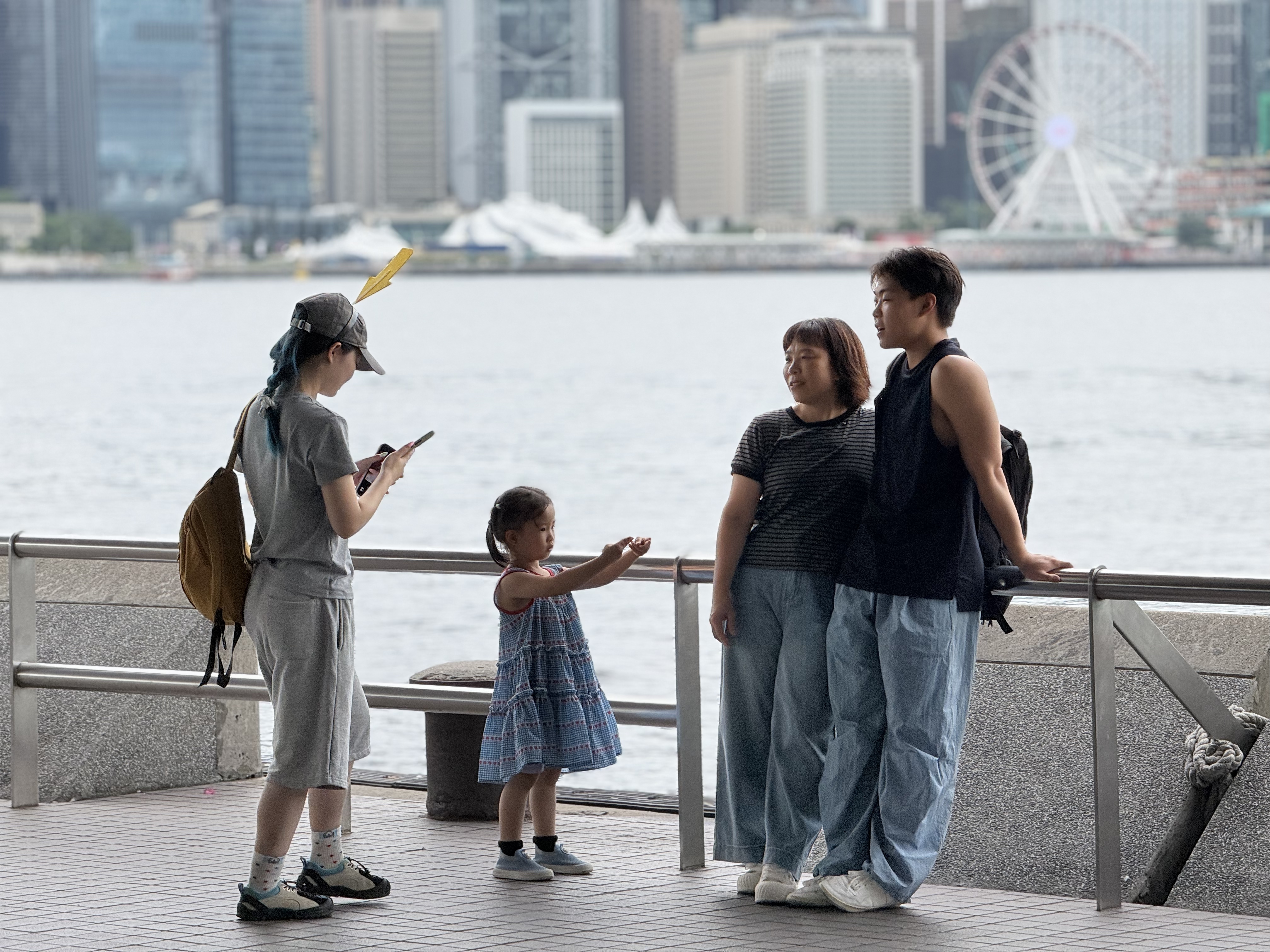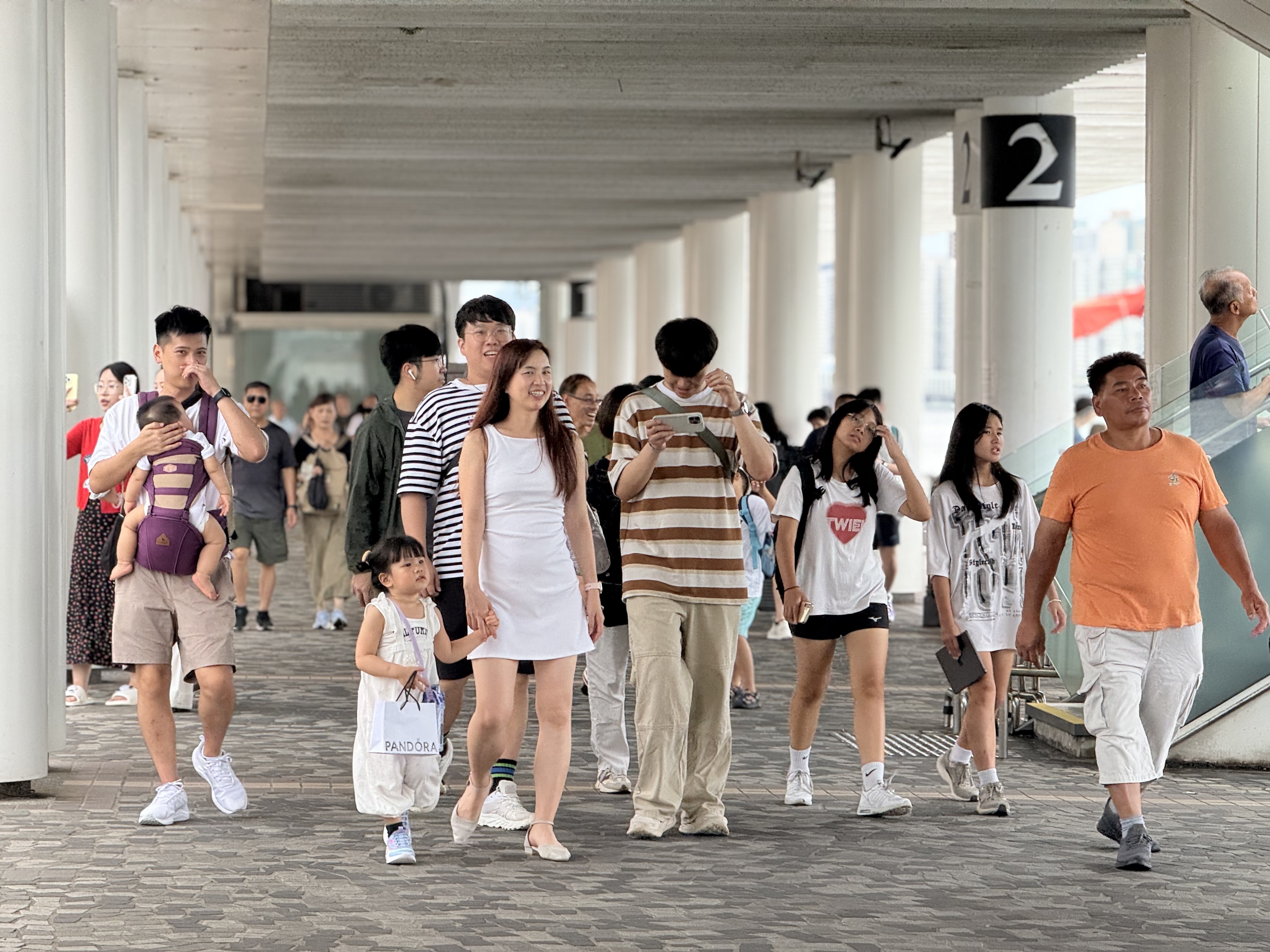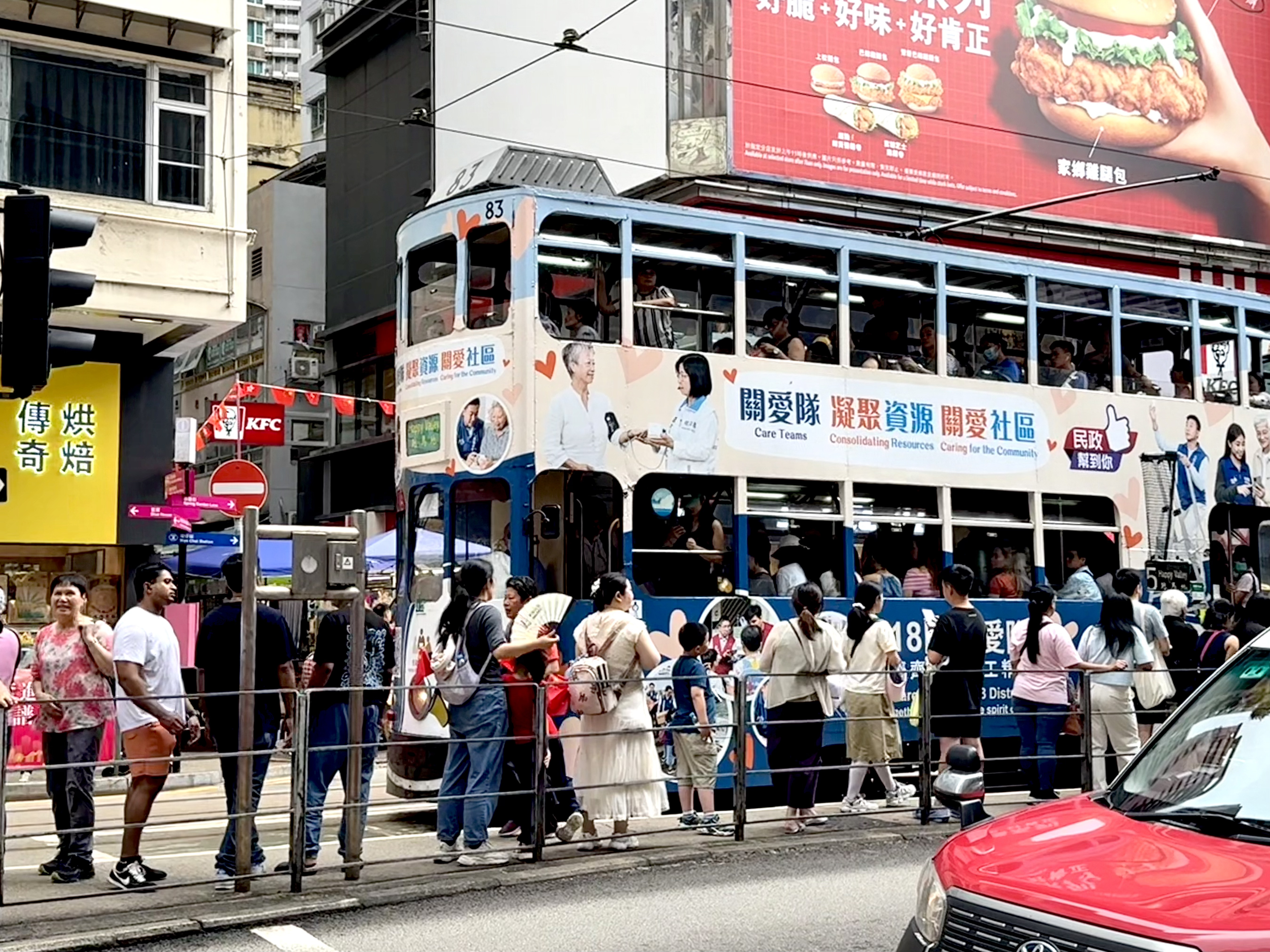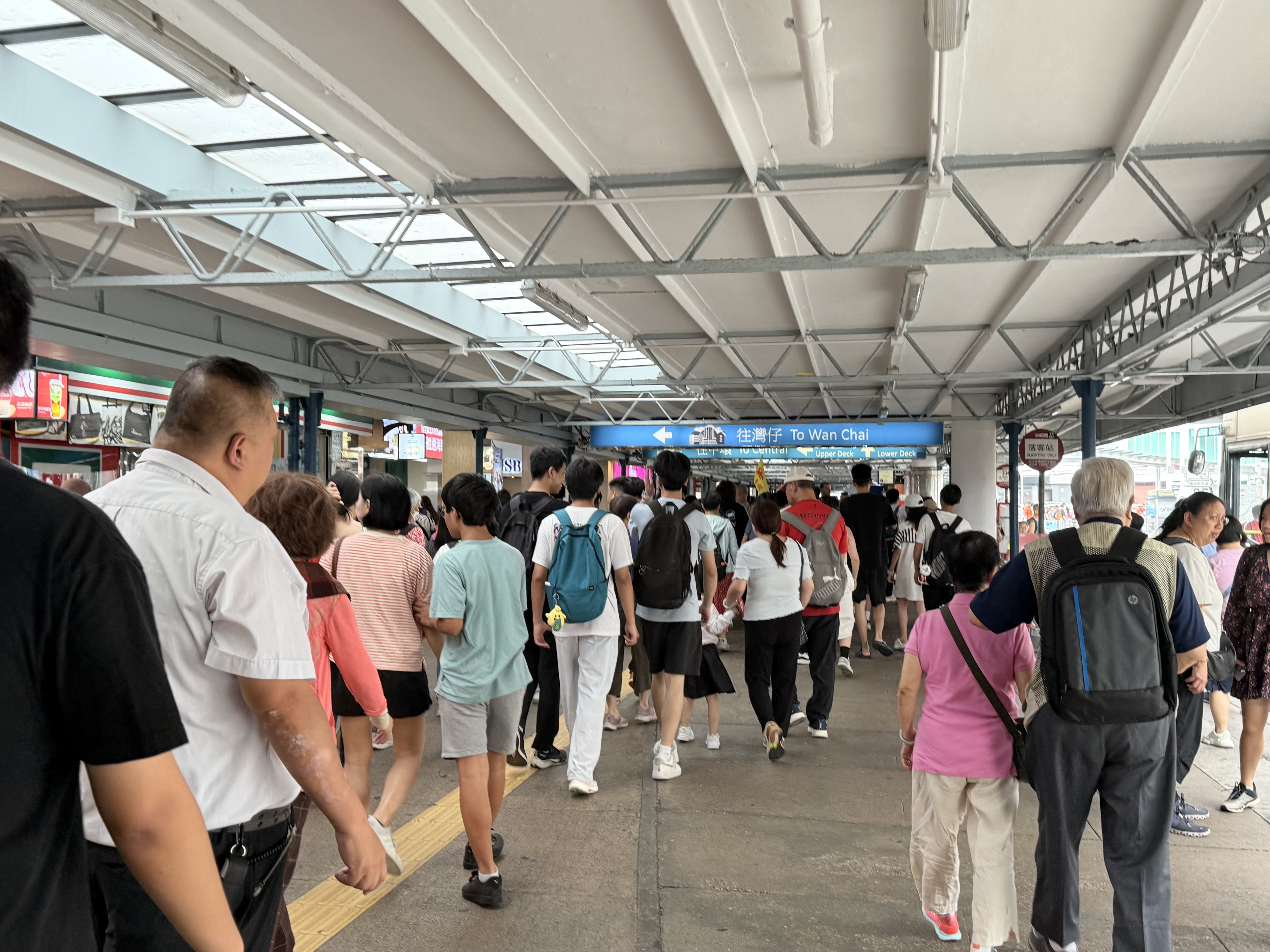 今日下午,灣仔一帶人頭湧湧,因全線載客電車於7月1日至3日供市民免費乘搭,電車上車點人流不斷,眾多市民排隊等候上車。尖沙咀海濱下午同樣熱鬧非凡,記者見許多人在維港邊散步、拍照,尖沙咀碼頭擠滿市民和遊客,當中不乏旅行團隊伍,等候免費乘搭天星小輪「尖沙咀—灣仔」航線。