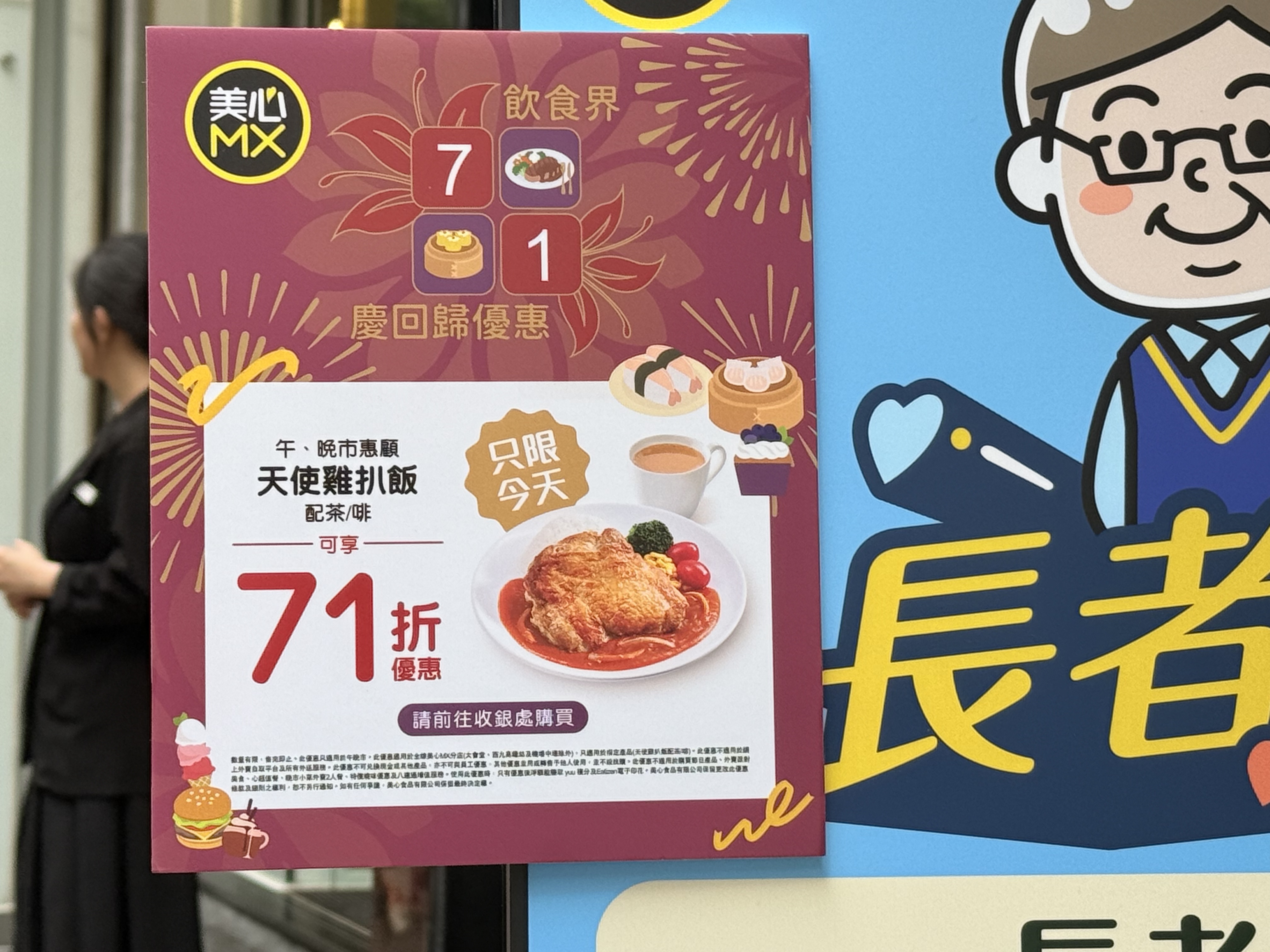 飲食方面,業界今年已是連續第三年推出「七一優惠」,參與食肆數量飆升至3800間,涵蓋連鎖速食、酒店餐廳、麵包店及日式料理等。記者今日在多家食肆見到「七一」限定優惠的宣傳,如大家樂全線商舖推出冬瓜盅二人晚餐71折優惠,美心部分分店推出天使雞扒飯配茶/啡71折優惠等。在非就餐高峰時間的下午,亦有食客前來詢問,希望與家人朋友體驗「七一」專屬優惠,一齊分享節日的喜悅。