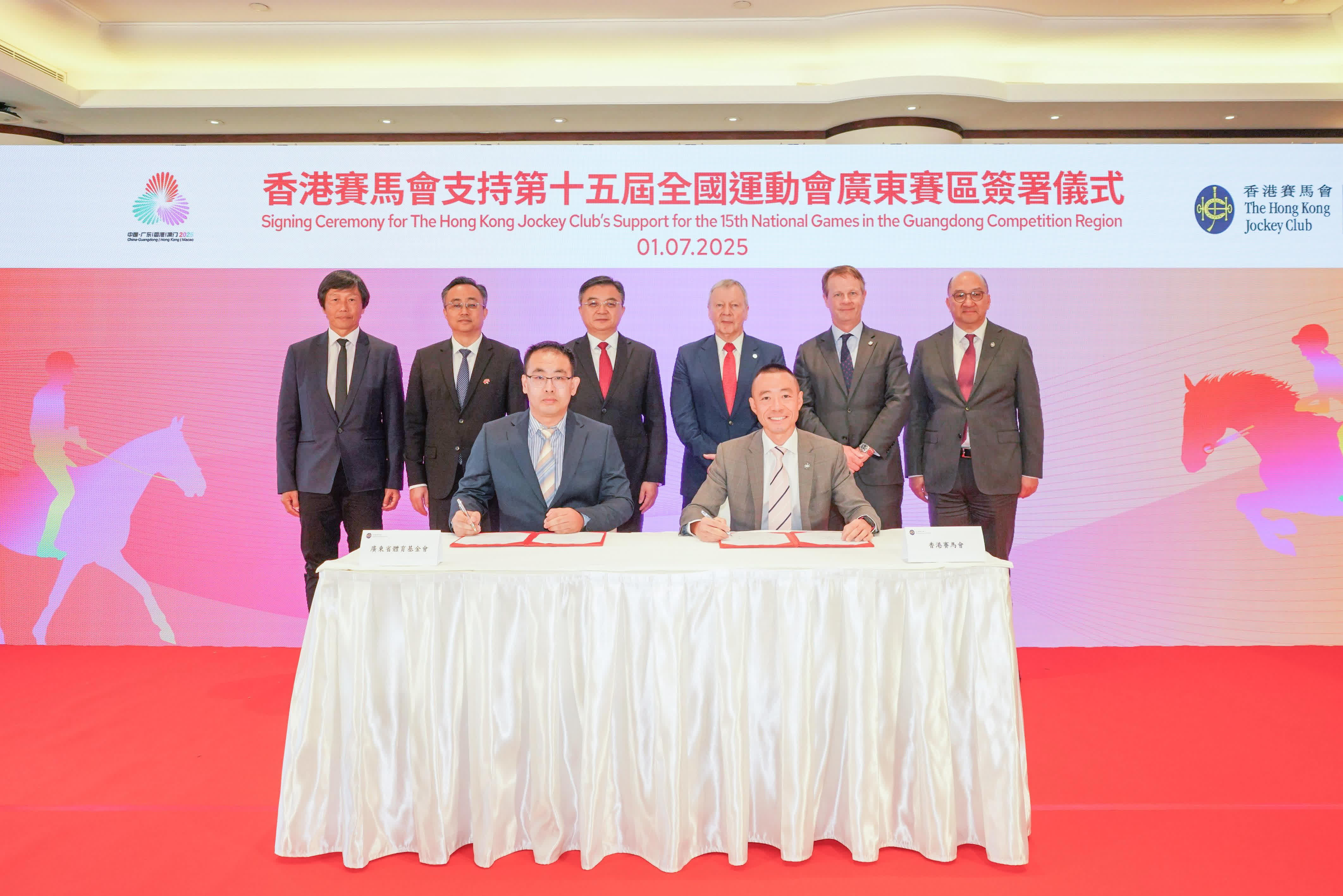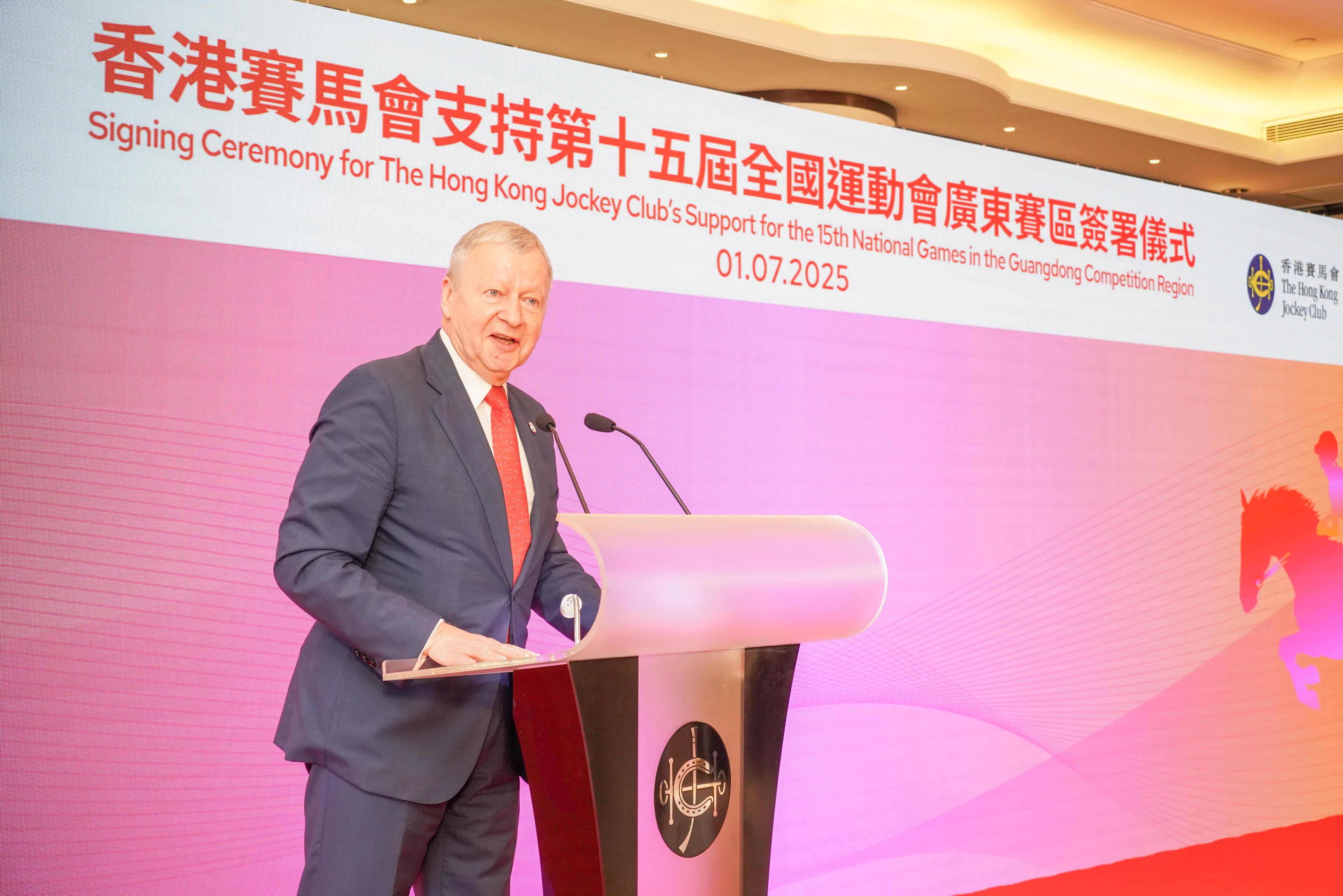 廣東省體育局局長崔劍表示,透過簽署《香港賽馬會支持十五運會廣東賽區合作備忘錄》,定向支持十五運會馬術賽事及廣東賽區官方活動、義工服務及賽事宣傳推廣等,助力打造「綠色、共享、開放、廉潔」的全運盛會,體現粵港服務國家戰略的擔當。粵港秉持「同心同行」的信念,將繼續以友好協商、互利共贏的精神,攜手書寫大灣區體育事業更璀璨的篇章。