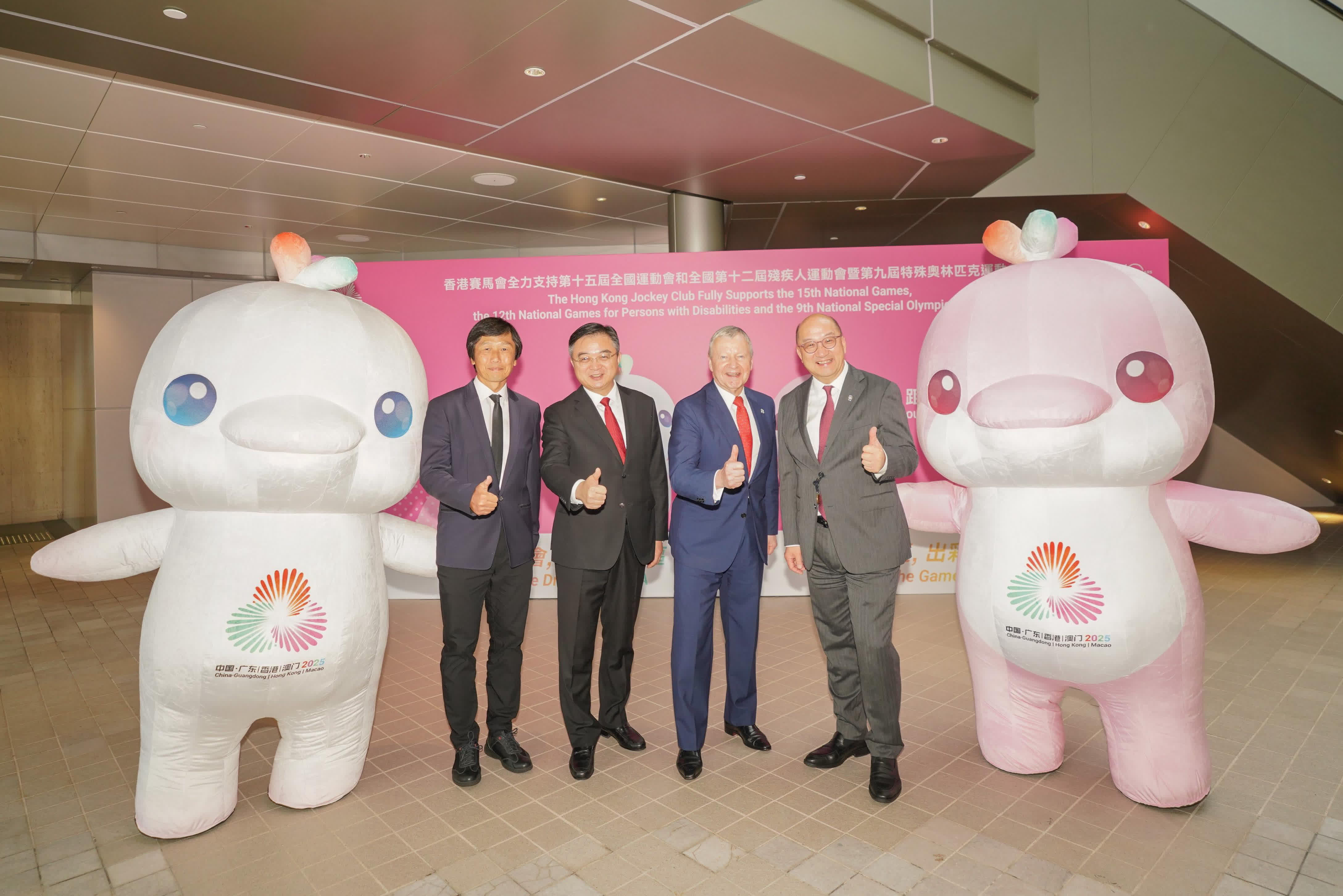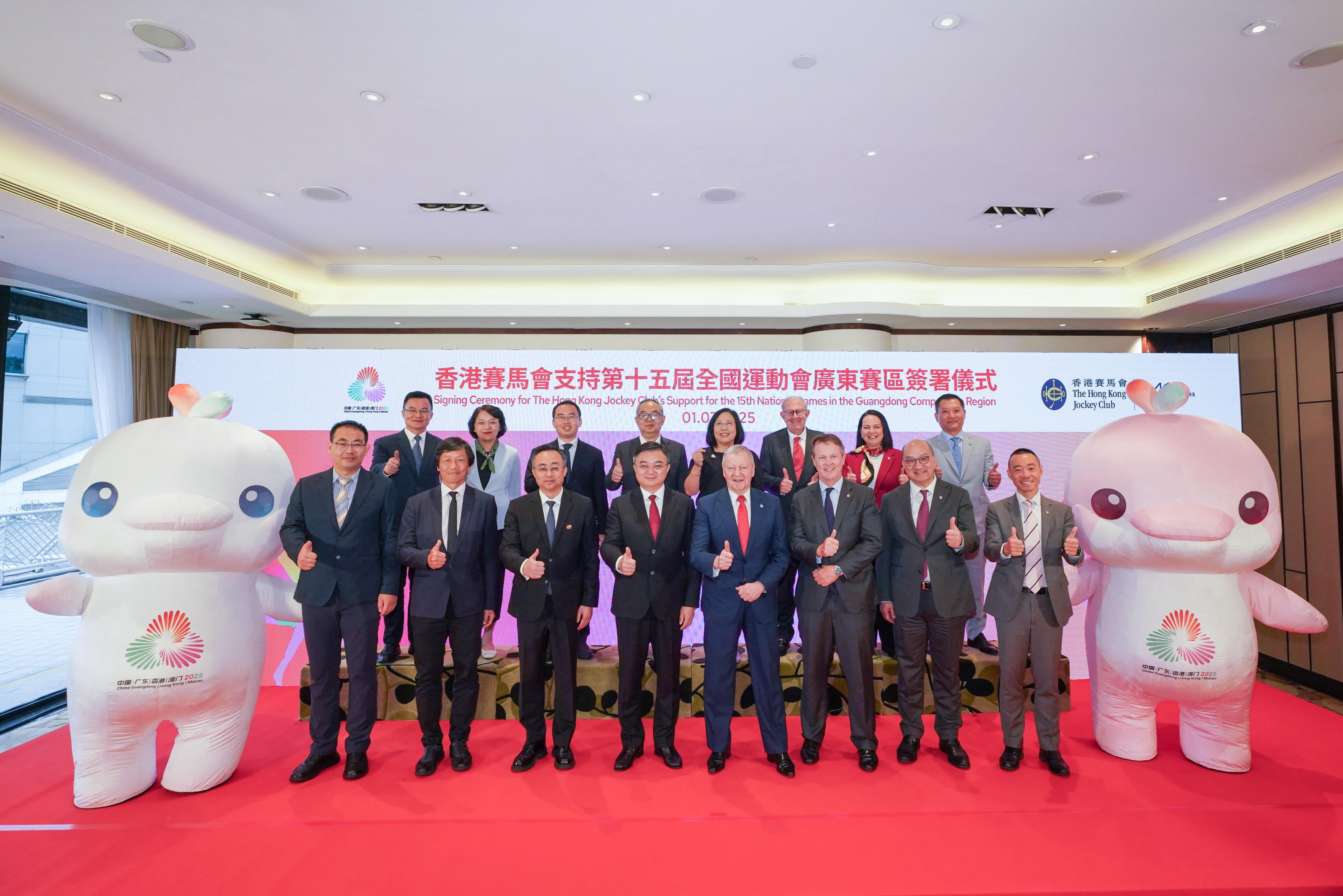 馬會支持十五運會和殘特奧會廣東賽區簽署儀式今日在馬會沙田會所舉行。廣東省體育局局長崔劍、中央人民政府駐香港特別行政區聯絡辦公室宣傳文體部副部長李曙光、全國運動會香港賽區統籌辦公室主任楊德強、馬會行政總裁應家柏、馬會賽馬事務執行總監夏定安、馬會公司事務執行總監譚志源出席簽署儀式。