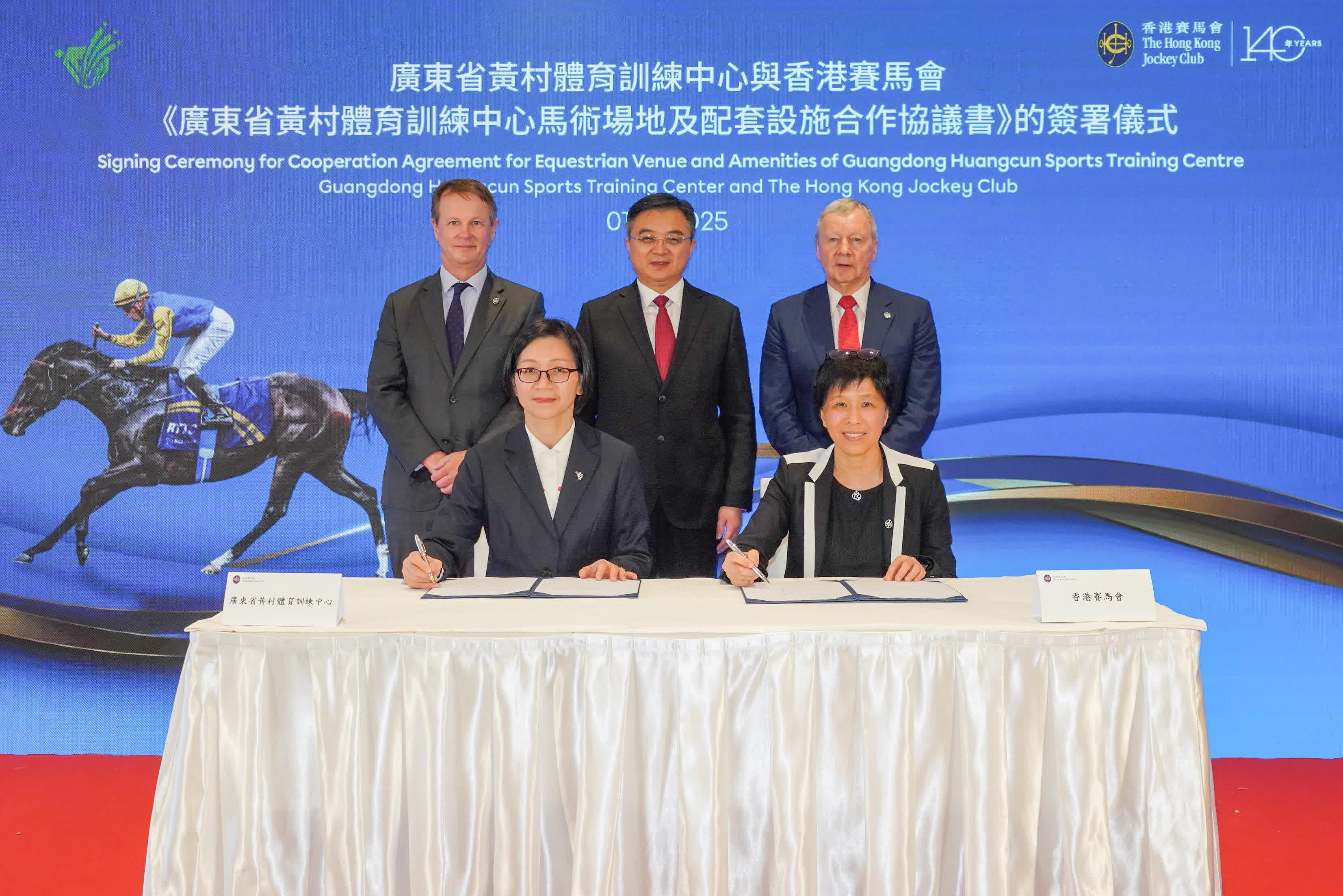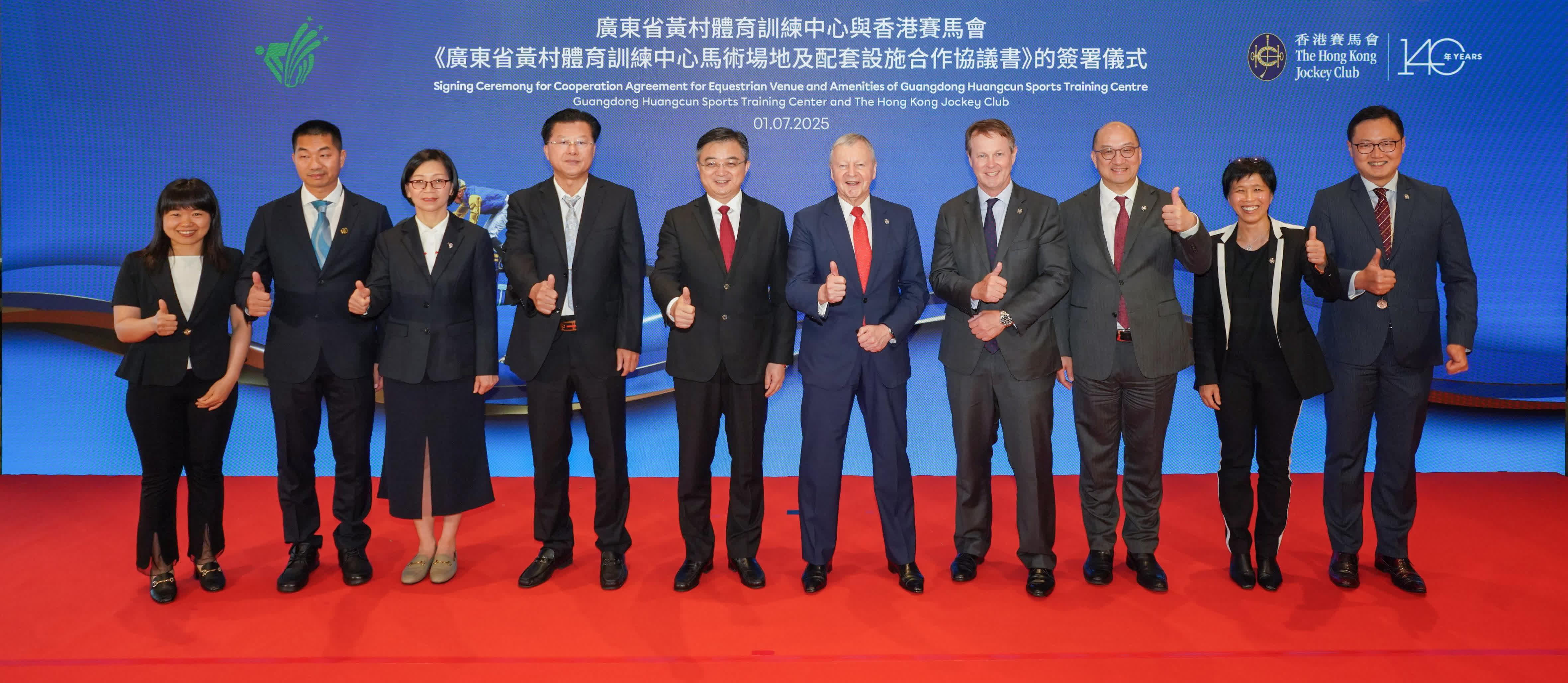 同日,馬會與廣東省黃村體育訓練中心(黃村訓練中心)簽署合作協議。馬會將投入資金、技術和管理經驗,與黃村訓練中心共同使用馬術場地設施和設備。廣東省體育局局長崔劍表示,透過共用馬術場地和共同培育人才,有助於推動粵港馬術競技水準提升,為大灣區培育更多征戰國際賽場的頂尖騎手,為體育高質量發展注入可持續的新動能。