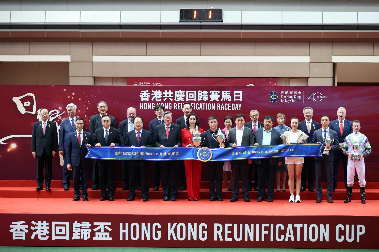 香港特別行政區立法會主席梁君彥、中華人民共和國外交部駐香港特別行政區特派員公署副特派員潘雲東、中央人民政府駐香港特別行政區聯絡辦公室宣傳文體部副部長李曙光,賽馬會主席利子厚、一眾董事及行政總裁應家柏於「香港回歸盃」頒獎儀式後合照。