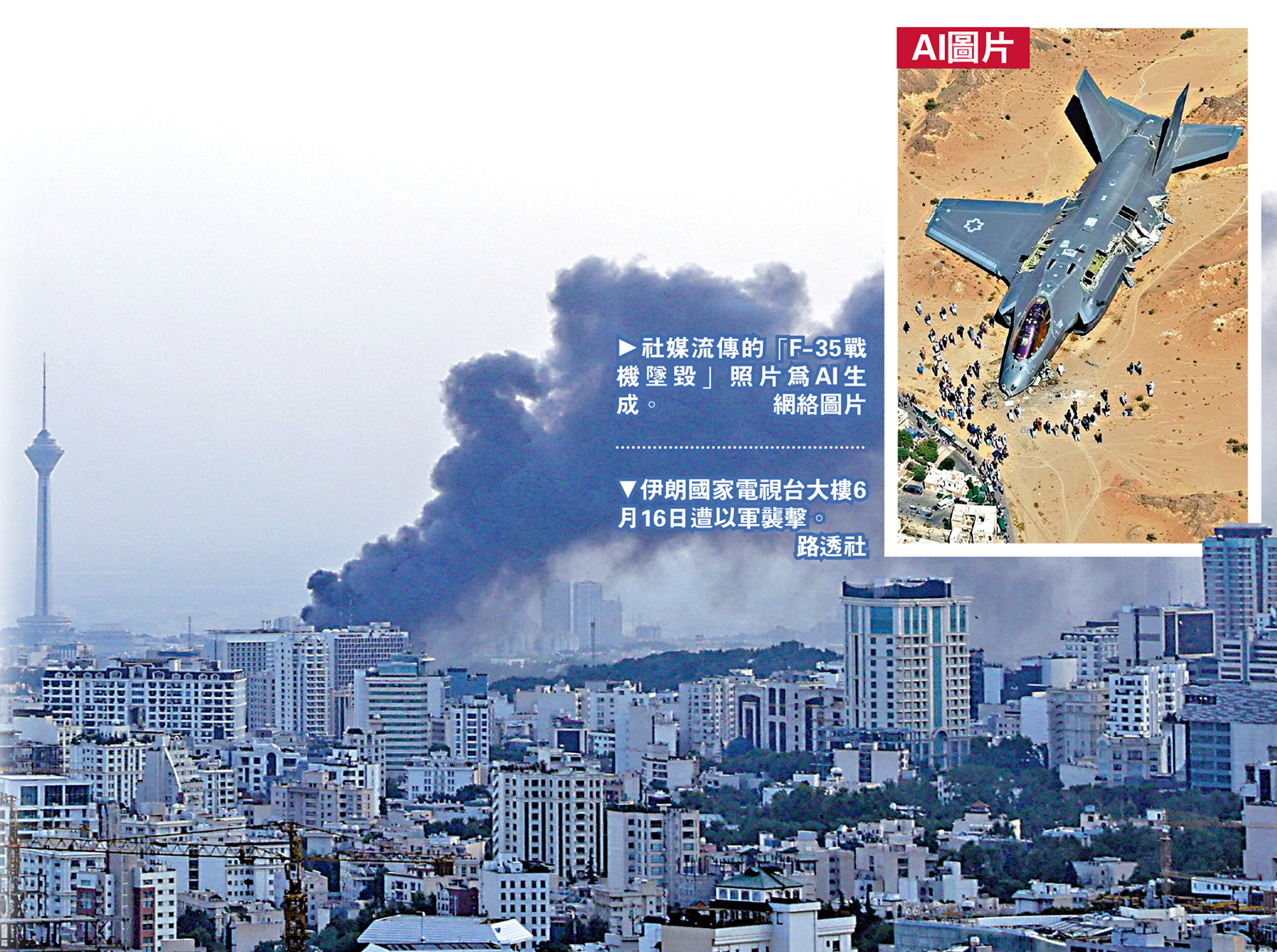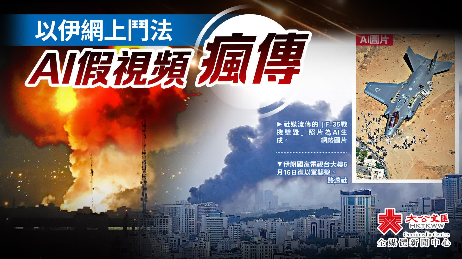 大公報綜合BBC、CBS報道:以伊衝突爆發後,雙方在網絡空間同步展開信息戰,大量人工智能(AI)生成的照片和視頻瘋傳。伊朗當局聲稱擊落以軍F-35戰機後,社交平台便流出一張疑似戰機墜毀殘骸照片,但圖中人物和戰機尺寸明顯不符實際。親以色列賬號則發布伊朗民眾在德黑蘭高呼「我愛以色列」的假視頻。