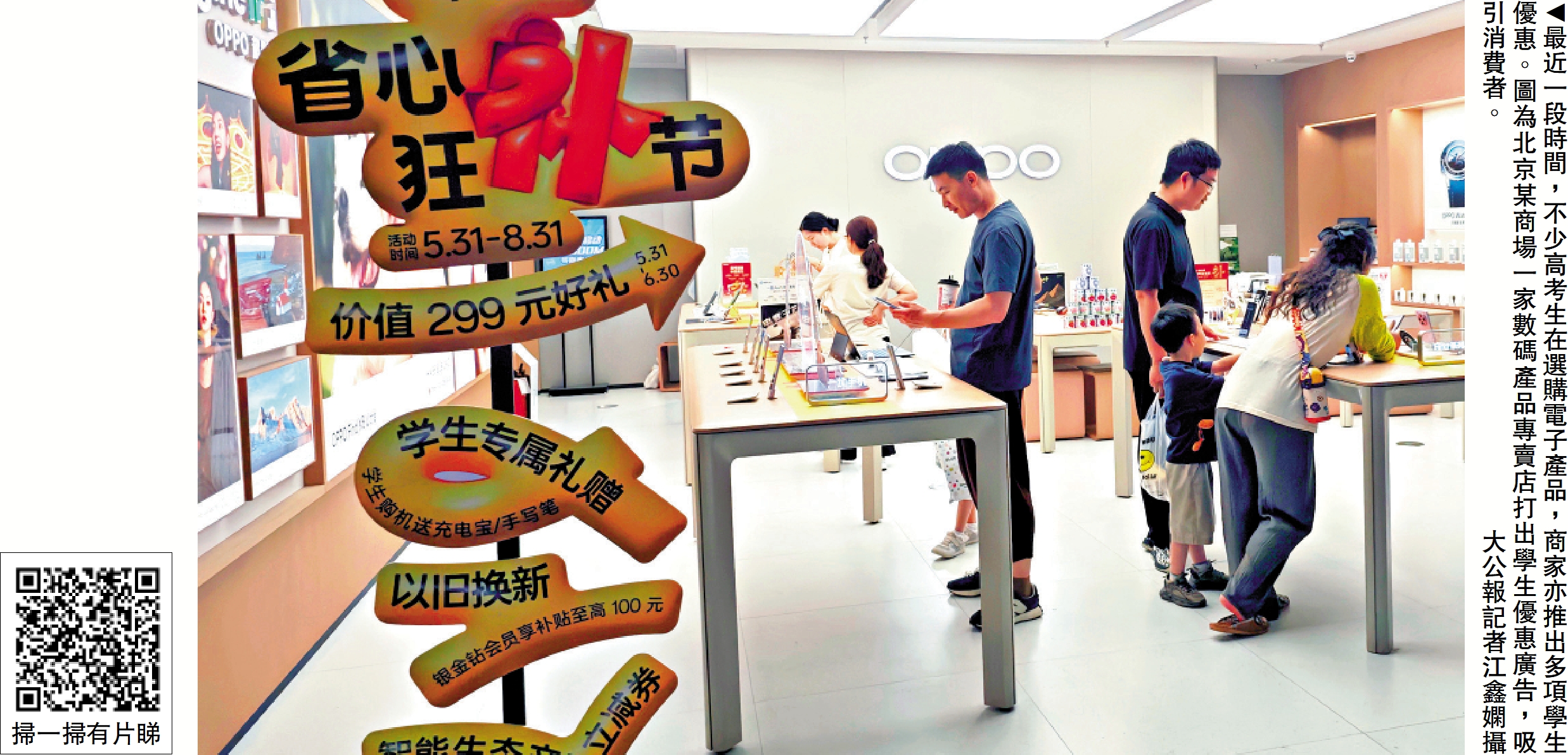 高考後的暑期換機潮已在近些年成為了約定俗成的習慣。大公報記者走訪發現,最近一段時間,不少高考生在選購筆記本電腦、手機、平板等全套電子產品,商家亦紛紛推出多項針對學生的優惠活動。在電商平台,「考後經濟」同樣火爆。多家電商平台有專門的「學生專區」「學生專屬」,甚至打出「國家補貼×教育優惠,享八折,至高省2000元(人民幣,下同)」的宣傳語,通過「高考生認證」,就能體驗「學生專享價」。