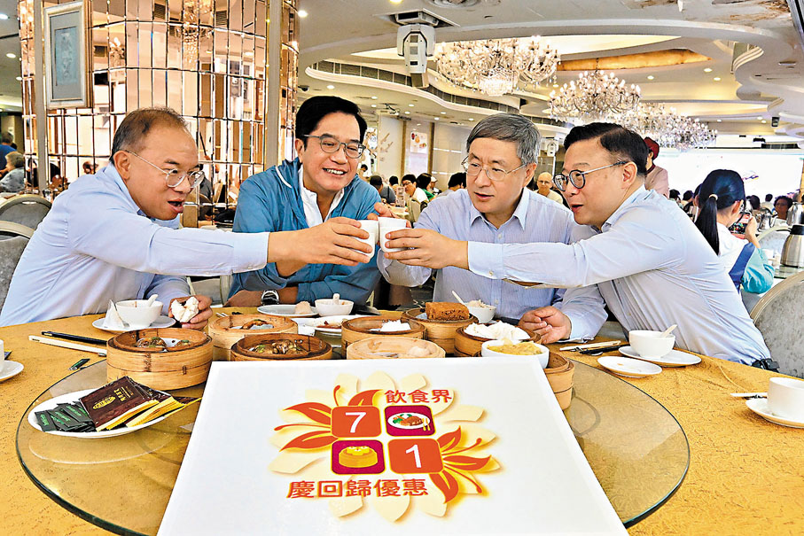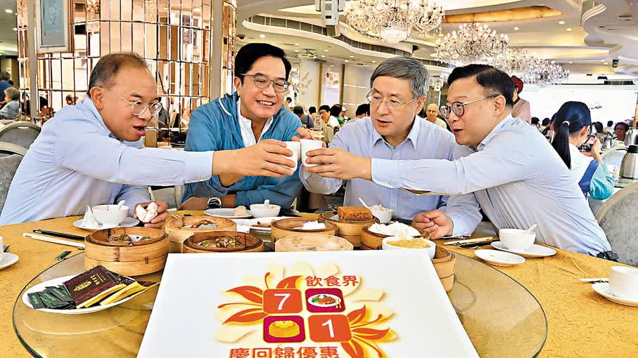 保安局局長鄧炳強則到佐敦享用同事推介的開心果套餐,也感受到近年開心果熱潮席捲全城的理由。公務員事務局局長楊何蓓茵亦與局內三位年輕政務主任結伴到灣仔「奇華茶室」,享用七一餐飲優惠,以實際行動支持本地消費。民政及青年事務局局長麥美娟昨日中午相約一班地區團隊好夥伴、地區治理「三駕馬車」以及連青人網絡的青年,到灣仔一間酒樓飲茶,共同享受一盅兩件,與茶客共慶回歸紀念日。