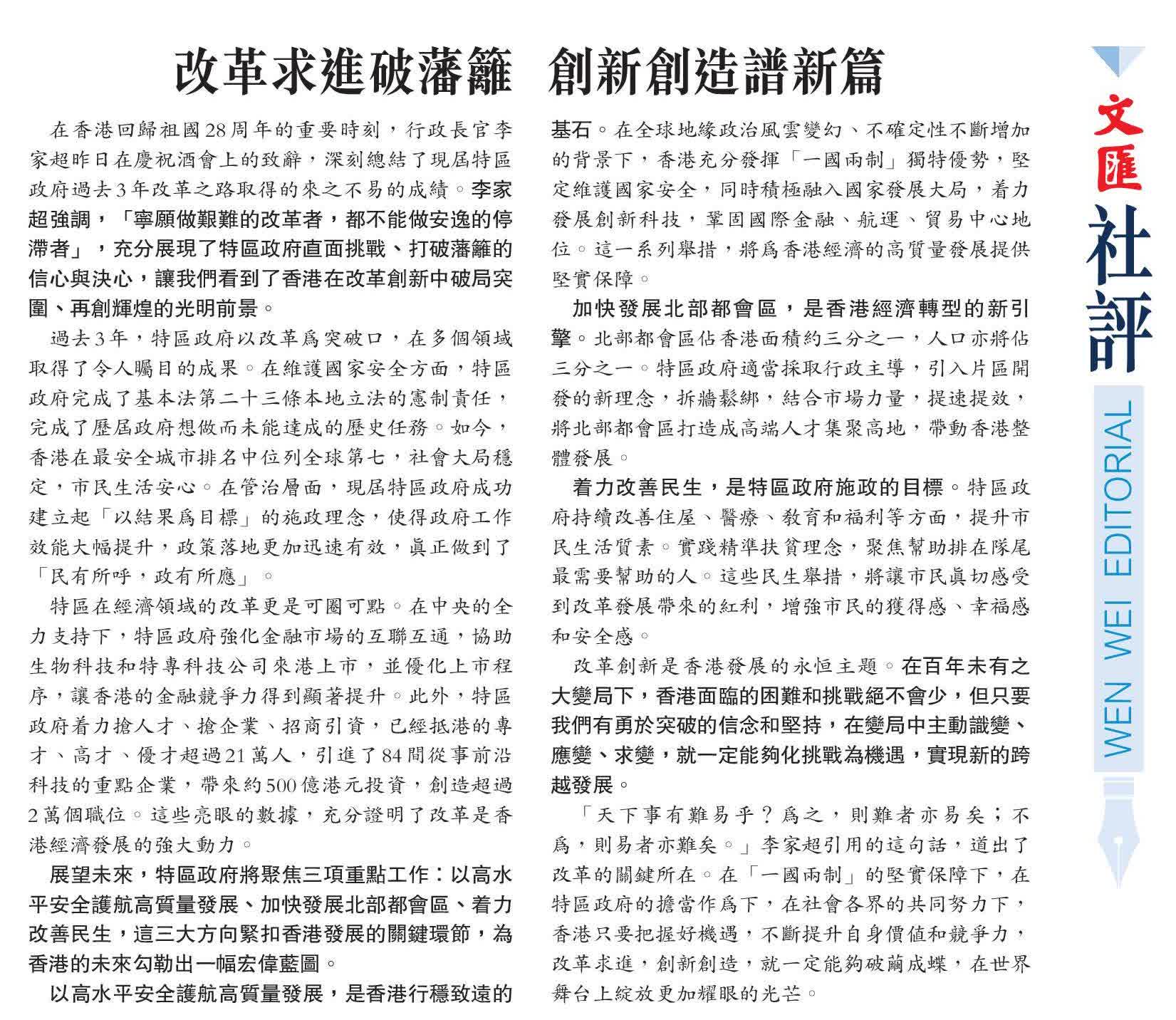 在香港回歸祖國28周年的重要時刻,行政長官李家超昨日在慶祝酒會上的致辭,深刻總結了現屆特區政府過去3年改革之路取得的來之不易的成績。李家超強調,「寧願做艱難的改革者,都不能做安逸的停滯者」,充分展現了特區政府直面挑戰、打破藩籬的信心與決心,讓我們看到了香港在改革創新中破局突圍、再創輝煌的光明前景。