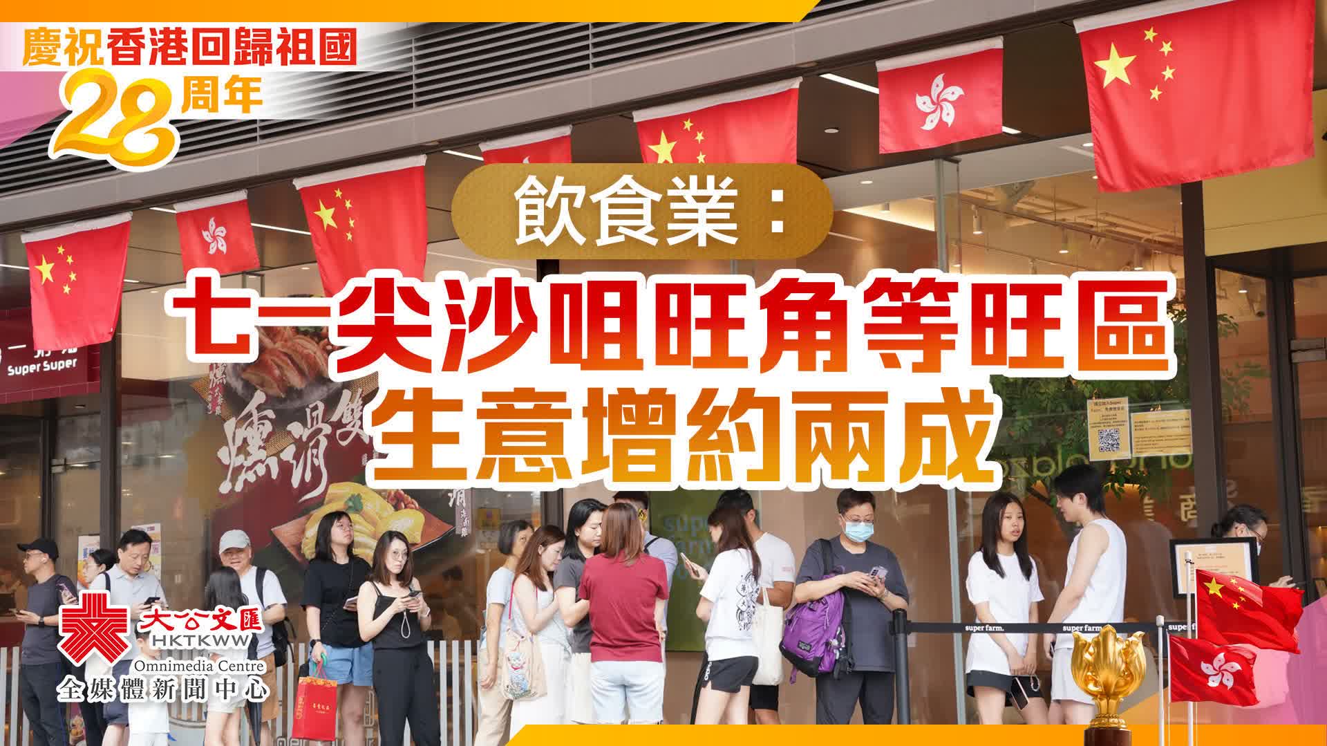 大公文匯全媒體報道,為慶祝香港回歸祖國28周年,本港數千間食肆在7月1日前後推出不同折扣的七一優惠。稻苗飲食專業學會榮譽會長邱金榮出席電台節目表示,今年七一人流比去年多了很多,原因是今年七一是星期二,不是連續假期,外傭亦放假,市民更願意留港消費。