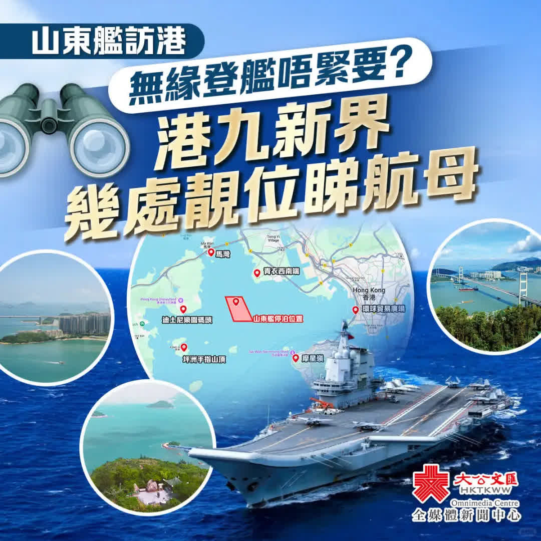 此前,大公文匯已發布青衣西南端、馬灣大排咀碼頭、摩星嶺等可遠眺山東艦的六處建議打卡地。這些地點視野相對最佳,且對公眾開放,可謂各有優勢。