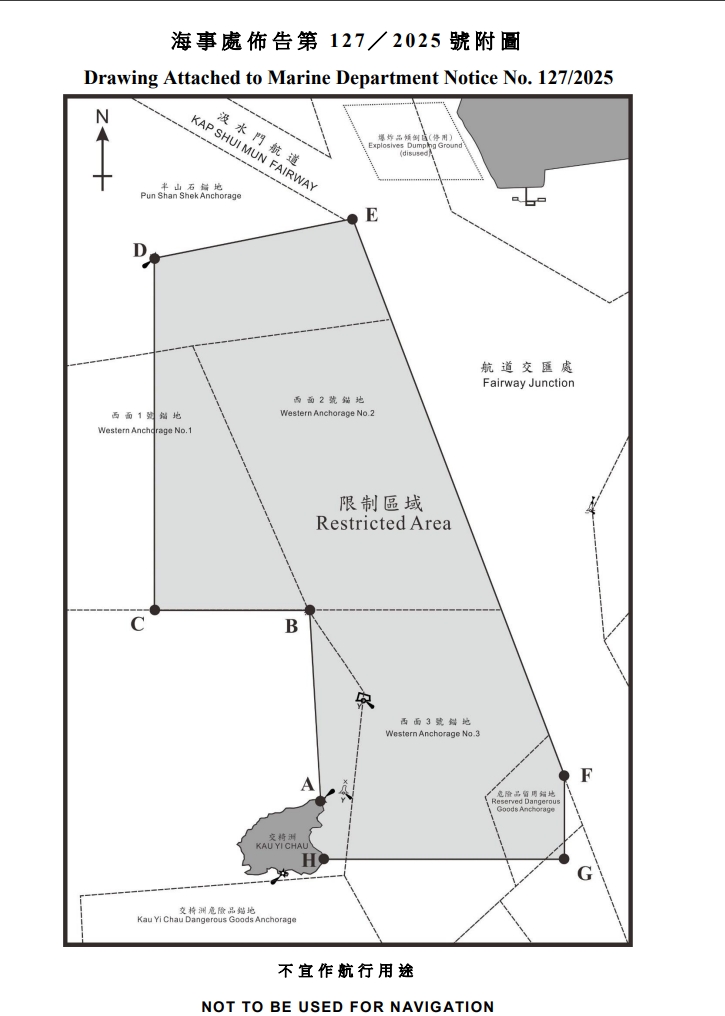 根據海事處布告第127/2025號,由2025年7月2日1800時至2025年7月7日1200時,在西航道對開海面將設立限制區,作為特別活動的部分保安安排。在上述期間,除政府小輪和參與上述活動的船隻外,任何船隻不得進入或留在限制區內。船長和船隻負責人在附近水域駕駛船隻時,應遠離限制區。