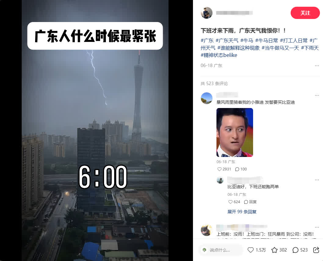 大灣區打工人深有體會,常有通勤路上降雨、到了工位放晴的天氣,讓人哭笑不得,且成為網絡熱梗。