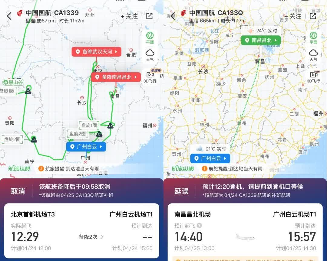 後因機組執勤超時,此次航班最終在南昌宣布取消,由CA133Q航班補班,乘客歷時近28小時抵達廣州。