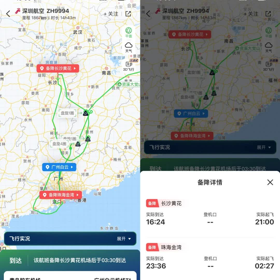 亦有青島膠東機場飛往廣州白雲機場的ZH9994航班,備降長沙黃花機場、珠海金灣機場後,歷時15小時終於抵達。