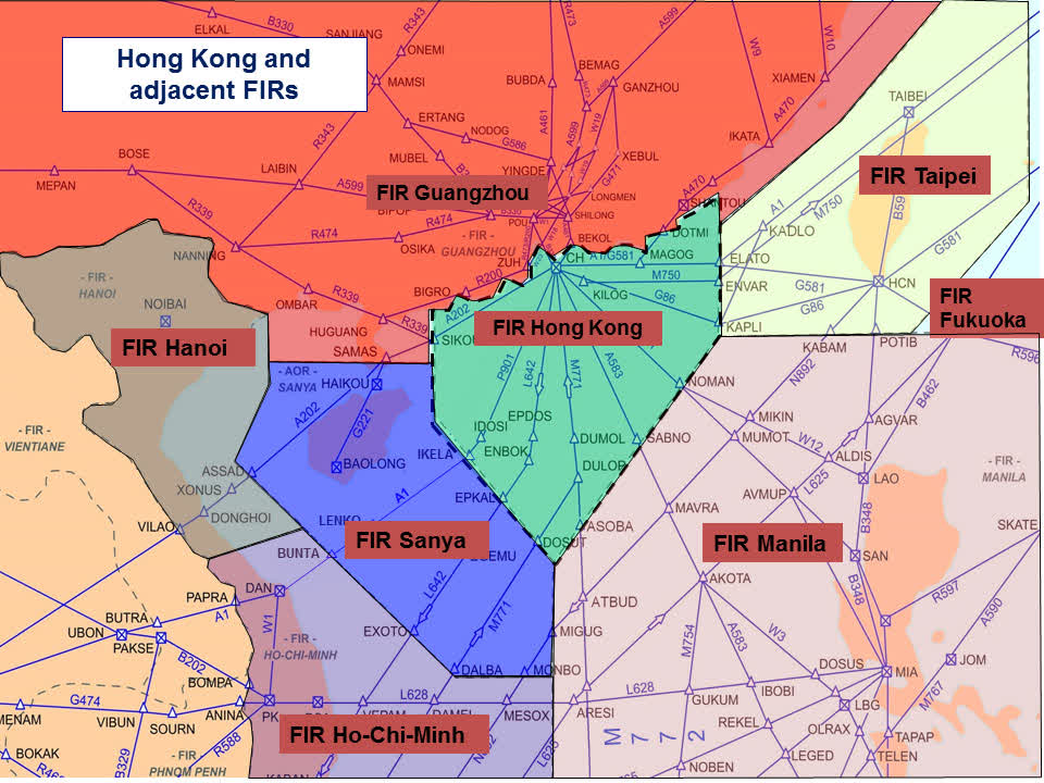 和大灣區其他機場空域不同,香港國際機場(代碼HKG,以下簡稱香港機場)位於新界赤臘角,屬於香港飛行情報區,範圍包括香港及以南海域,覆蓋南中國海面積達276,000平方公里,亦覆蓋東沙群島(由中國台灣管轄),飛機走海上航線,香港民航處負責在香港飛行情報區內提供空管服務。