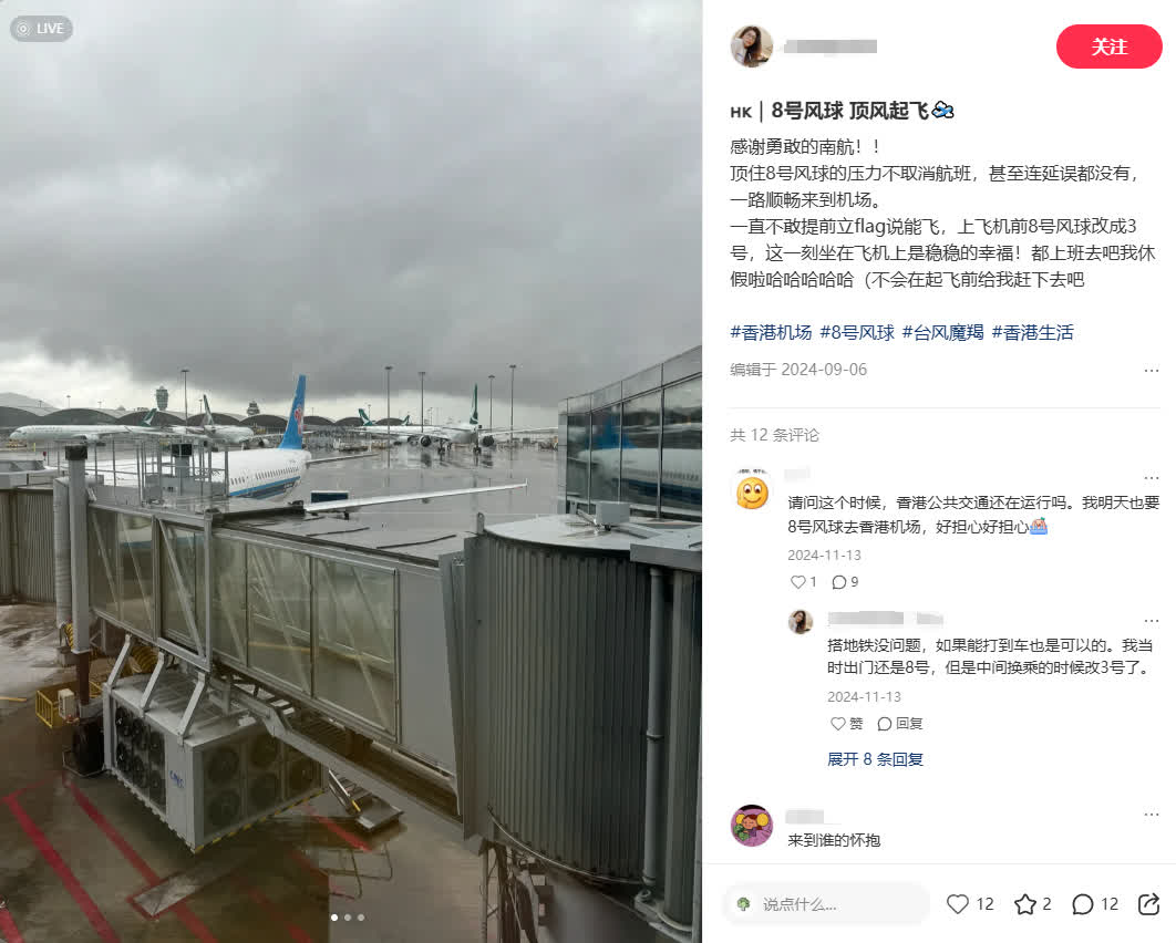 並且,內地對於低能見度和雨天的放行標準更高,對於側風(指當飛機升降時,與機場跑道方向垂直的風)的規定也和香港不一樣,有乘客表示,曾在掛八號風球時依然準時起飛。