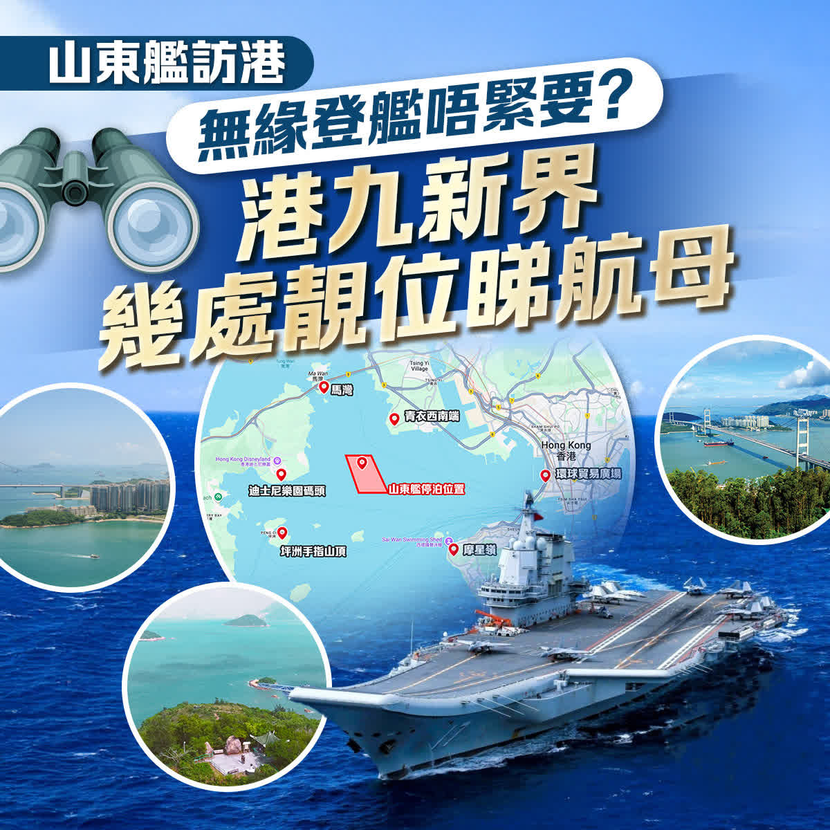 山東艦將會停泊在香港海域西面2號錨地,其地點與2017年遼寧艦訪港時停泊位置相近,位於青衣對開的交椅洲水域。因此,青衣西南端青衣路一帶可謂是最靠近山東艦的地點。香港哪些地方可以一睹山東艦的雄姿?快來睇!