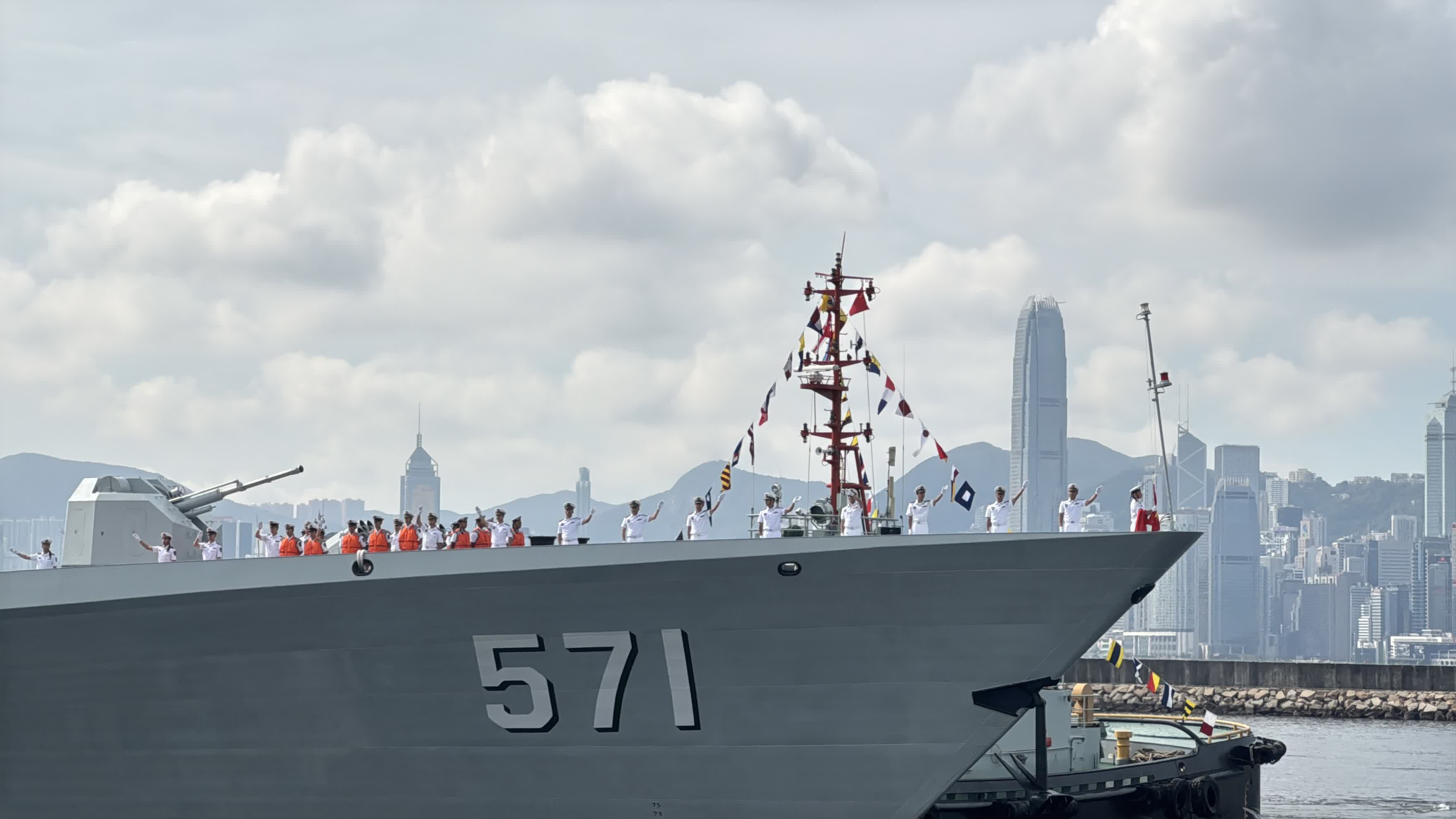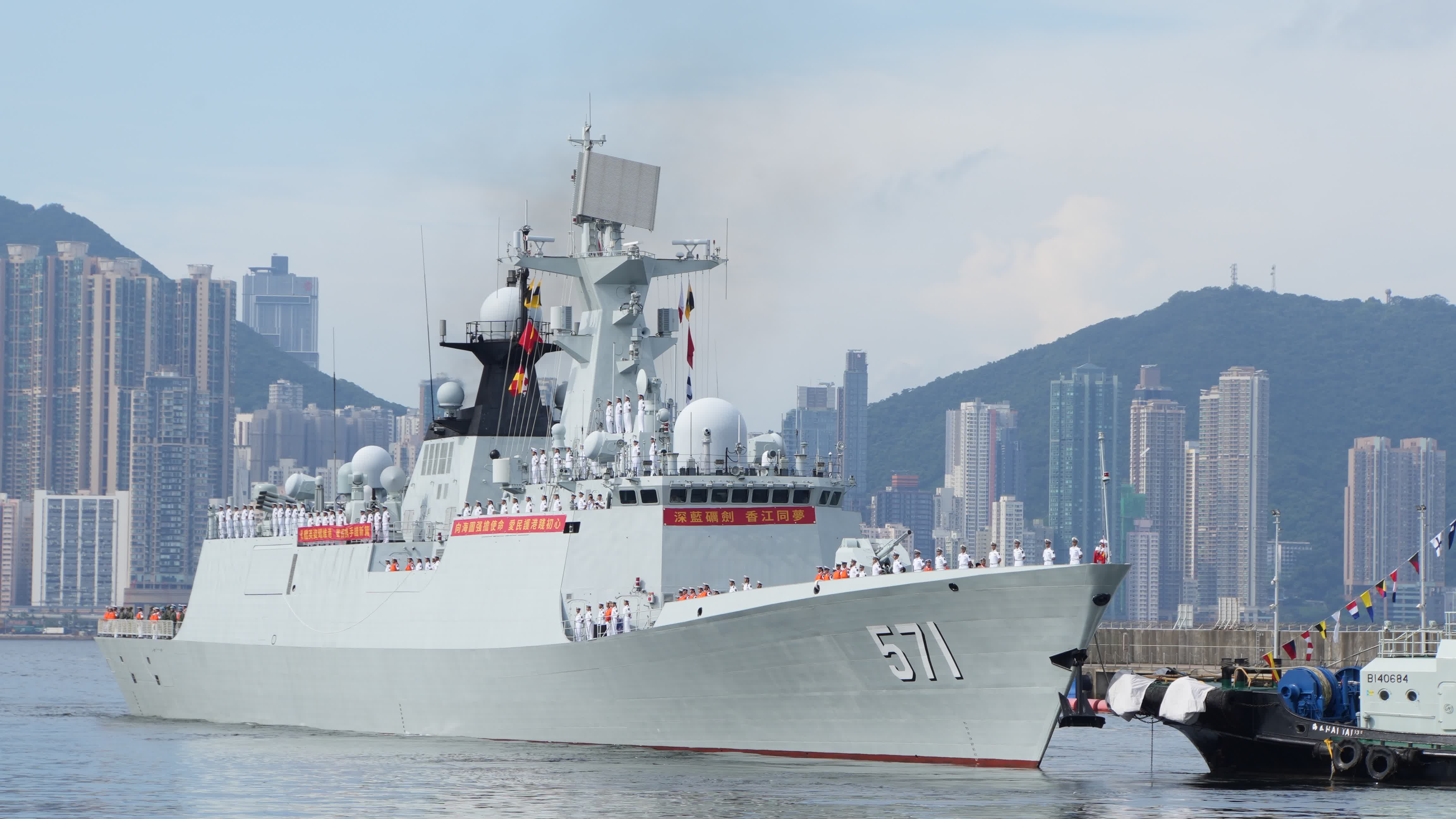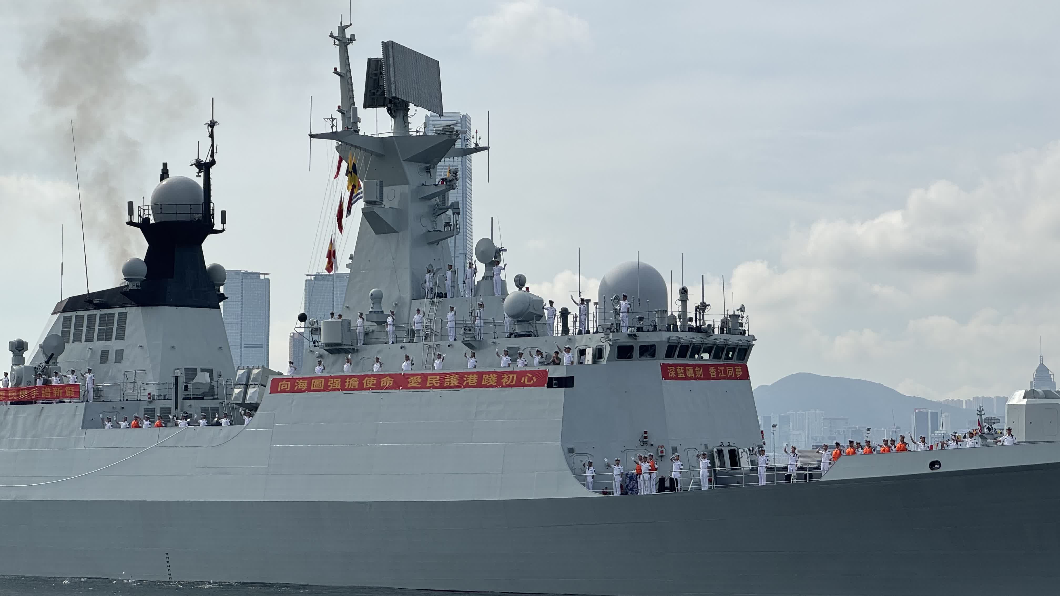 【07:45】導彈護衛艦運城艦掛有繁體字橫幅,上面寫有「深藍礪劍,香江同夢」;「向海圖強擔使命,愛民護港踐初心」;「戰艦英姿耀維港,軍民攜手譜新篇」。