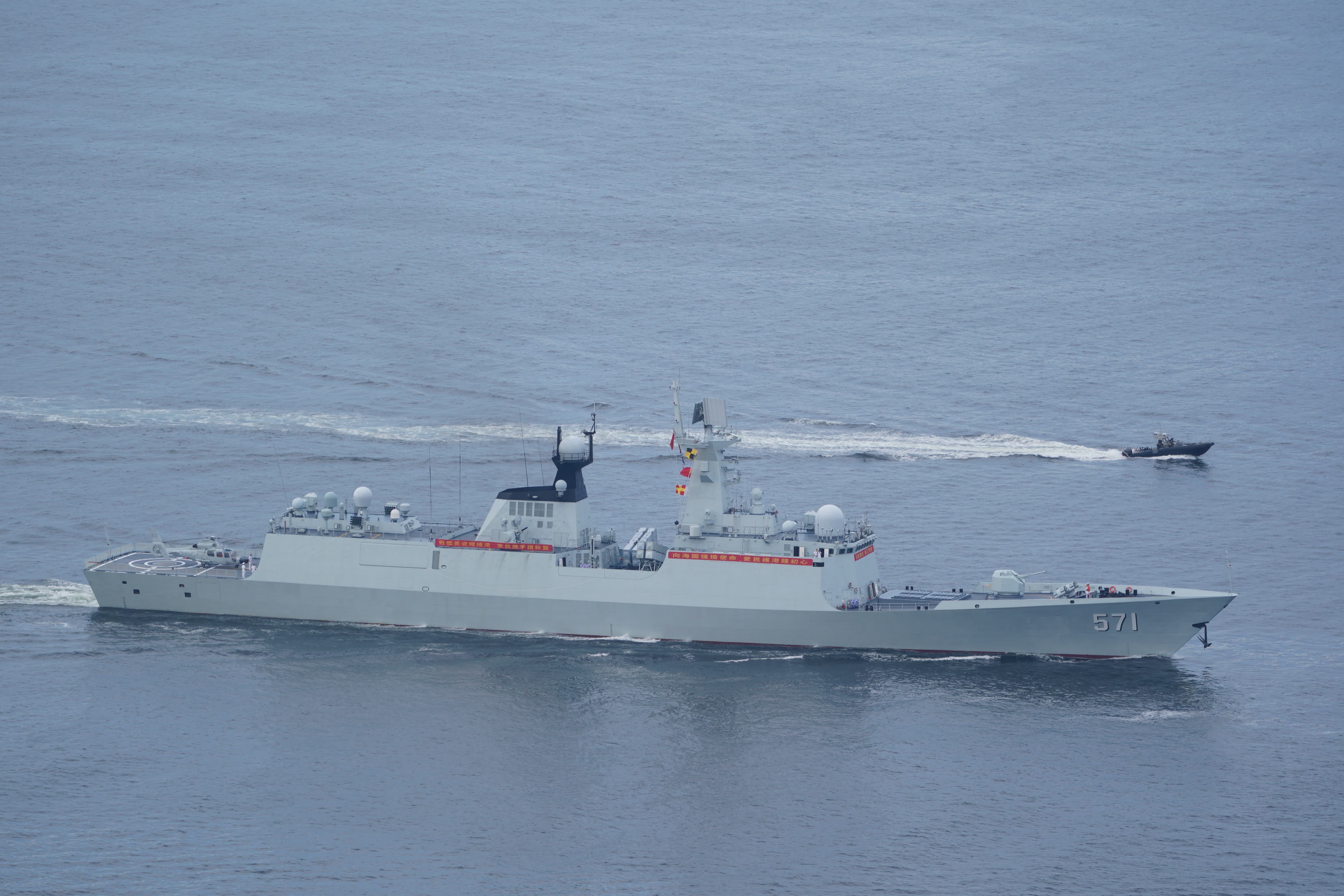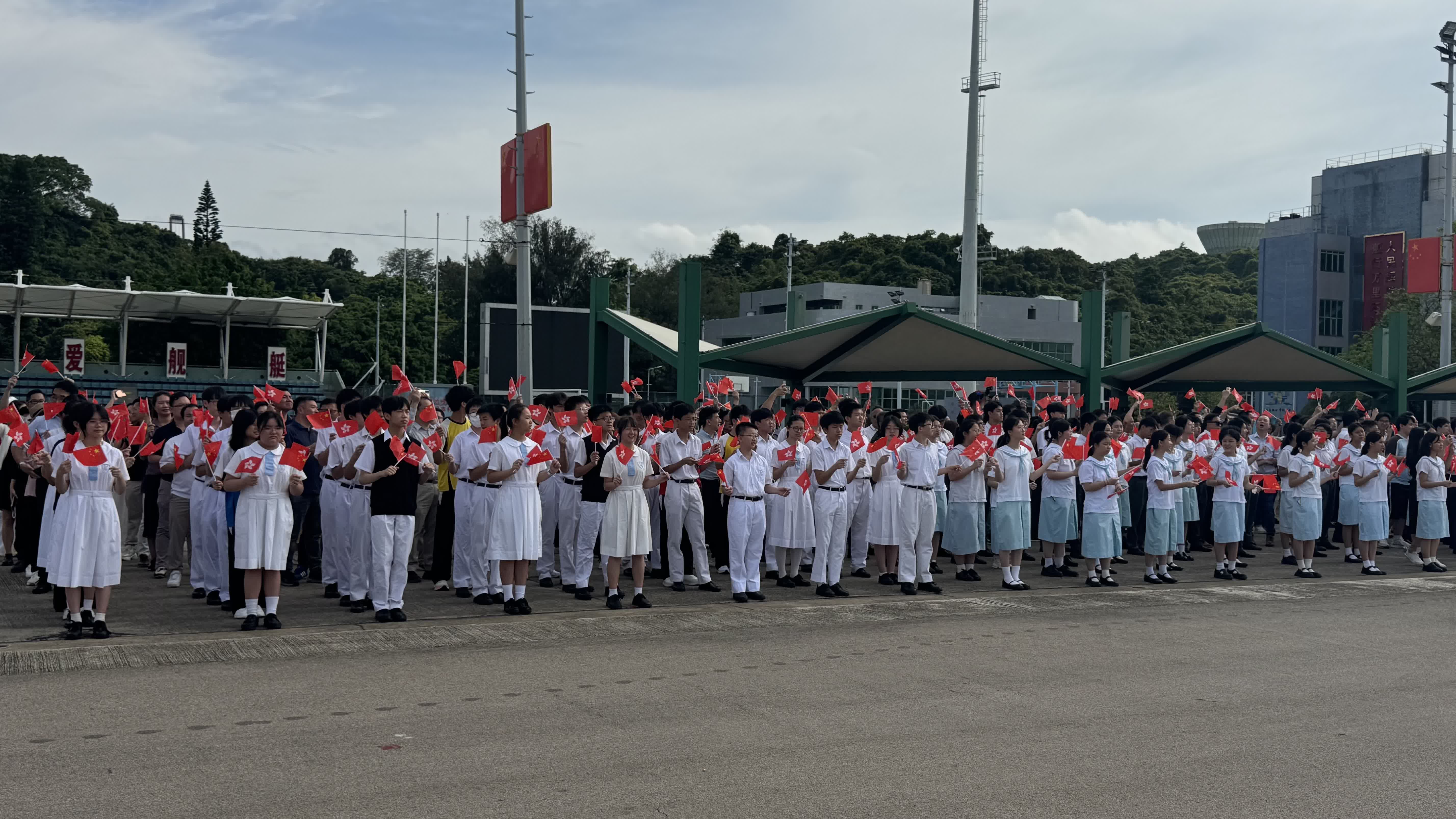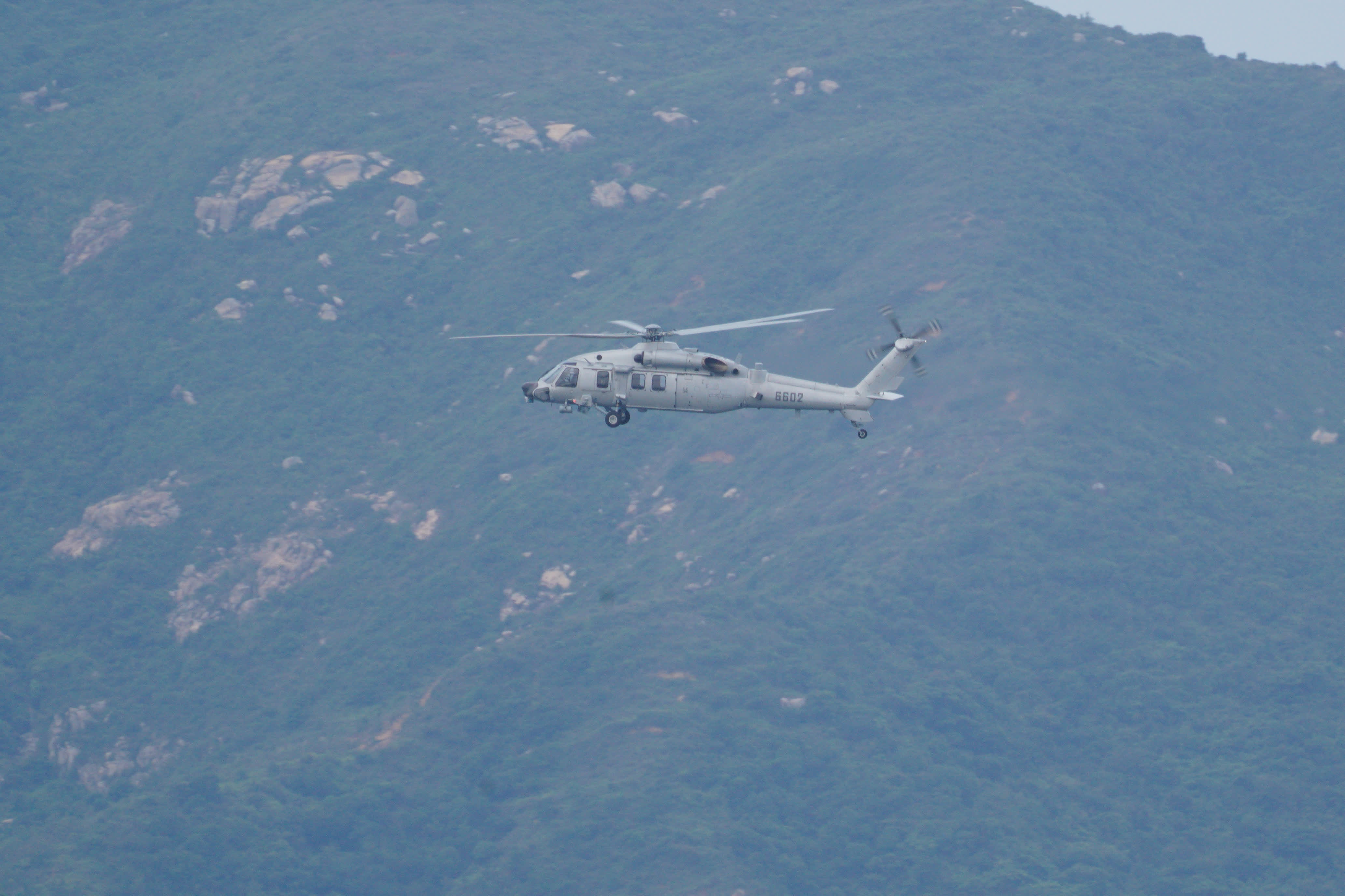 【07:45】導彈護衛艦運城艦掛有繁體字橫幅,上面寫有「深藍礪劍,香江同夢」;「向海圖強擔使命,愛民護港踐初心」;「戰艦英姿耀維港,軍民攜手譜新篇」。