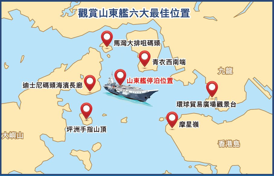 此前,大公文匯全媒體集團已發布青衣西南端、馬灣大排咀碼頭、摩星嶺等可遠眺山東艦的六處建議打卡地。這些地點視野相對最佳,且對公眾開放,可謂各有優勢。