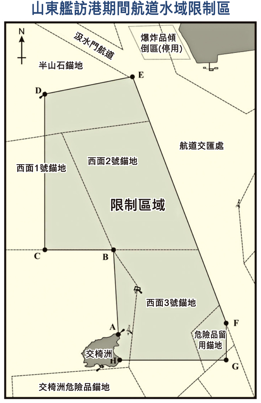 香港文匯報報道,因應國產航空母艦山東艦與導彈驅逐艦延安艦、湛江艦,以及導彈護衛艦運城艦組成的海軍艦艇編隊今日至本月7日來港,警方表示特區政府海事處昨日傍晚起至下周一(7日)將在西航道外附近水域設立船隻限制區,任何船隻未經授權不得進入限制區內。