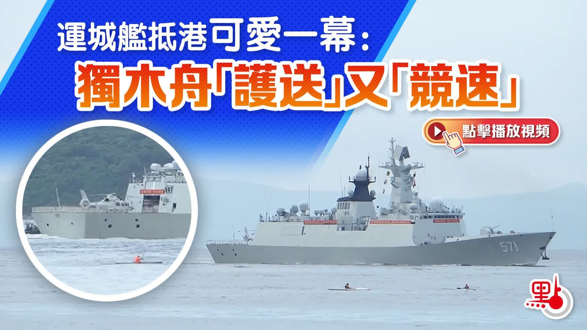 大公文匯全媒體報道,今早(3日)7時許,由航空母艦山東艦,導彈驅逐艦延安艦、湛江艦,導彈護衛艦運城艦組成的海軍艦艇編隊,經東博寮海峽駛向維港,來赴一場香江之約。在艦隊入港時,有划獨木舟晨練的市民在軍艦周圍「護送」,其中有人奮力划槳,試圖與舷號571的運城艦「一較高下」,場面逗趣。