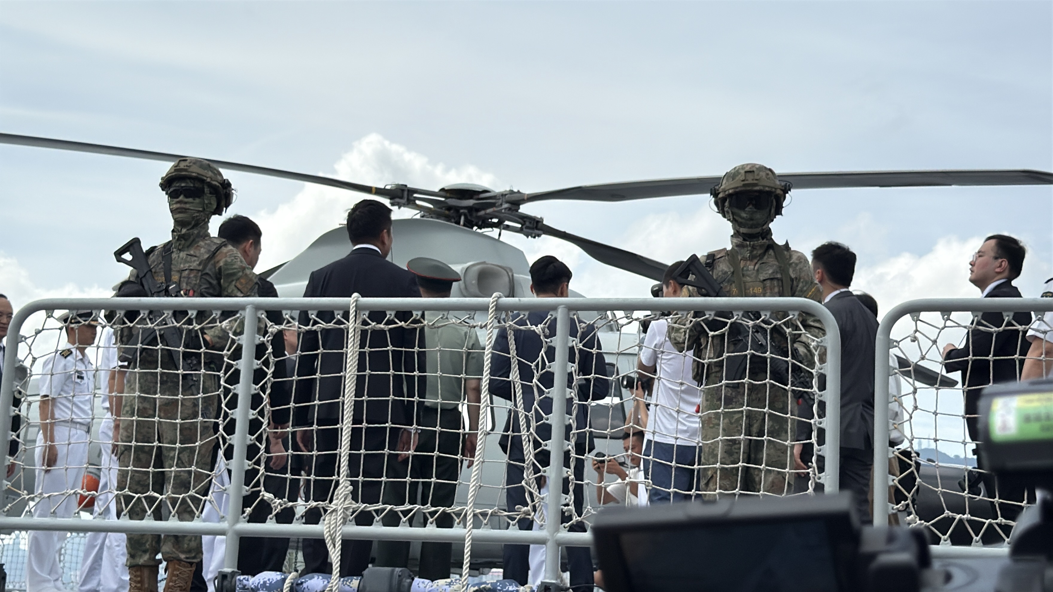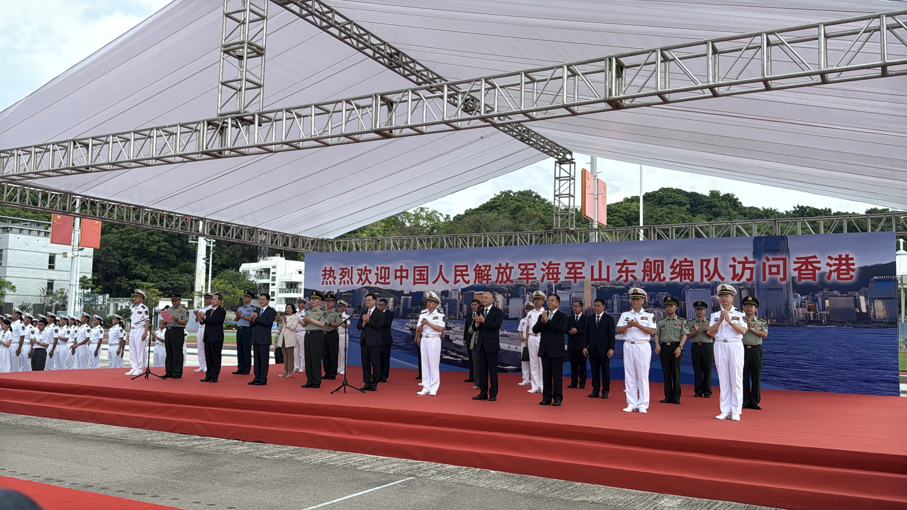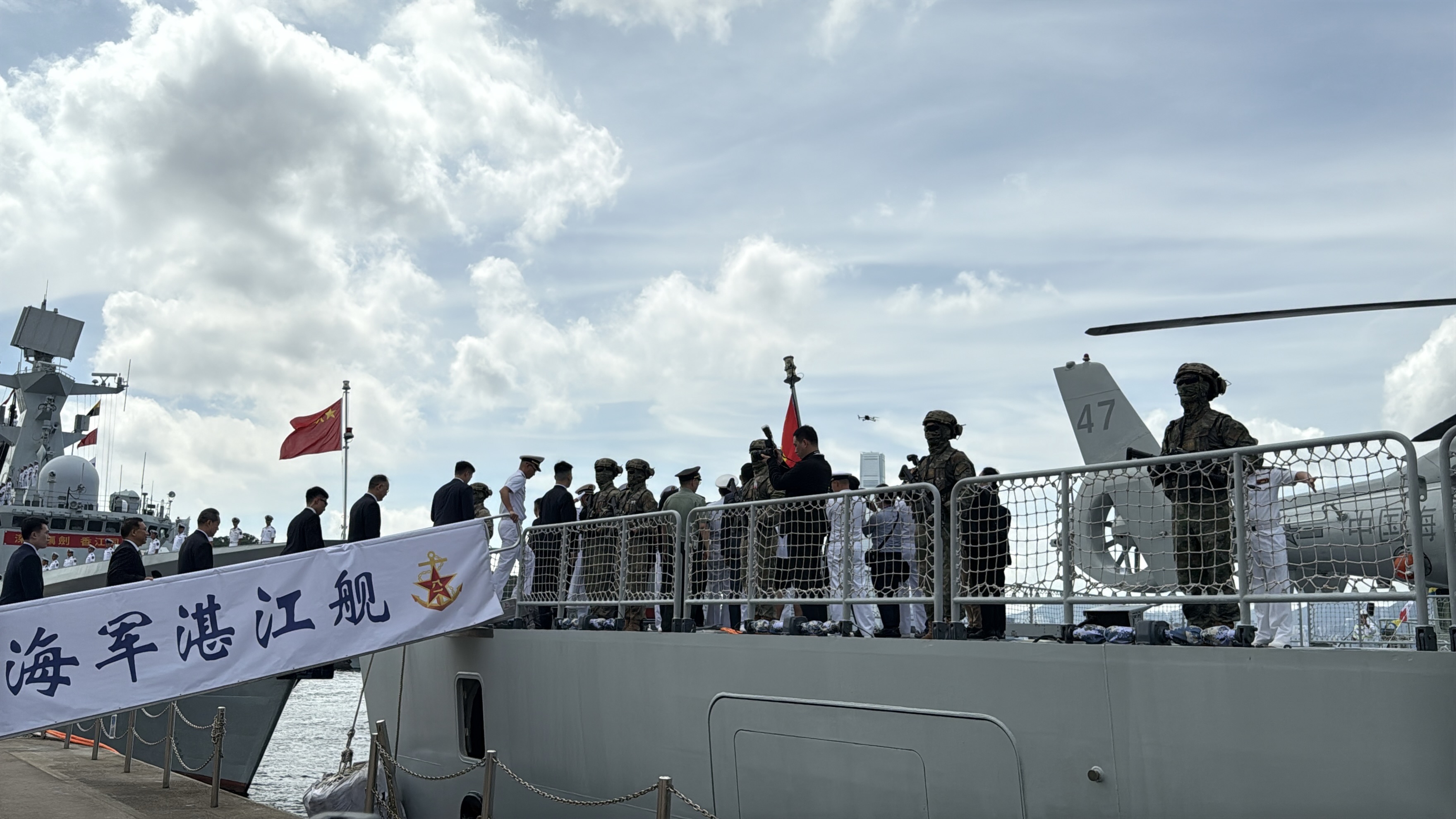 10時許,湛江艦放下舷梯,海軍和編隊有關領導及官兵代表踏上昂船洲軍營碼頭,與前來迎接的香港各界人士親切握手、相互問候。歡迎儀式在熱情友好的氛圍中開始,雄壯的國歌奏響,香港特區行政長官李家超致辭,代表香港特區政府和香港市民,對海軍艦艇編隊的到來表示熱烈歡迎。中央港澳辦、中央駐港機構、南部戰區、駐香港部隊相關負責人和代表出席儀式,並登上湛江艦、運城艦參觀。