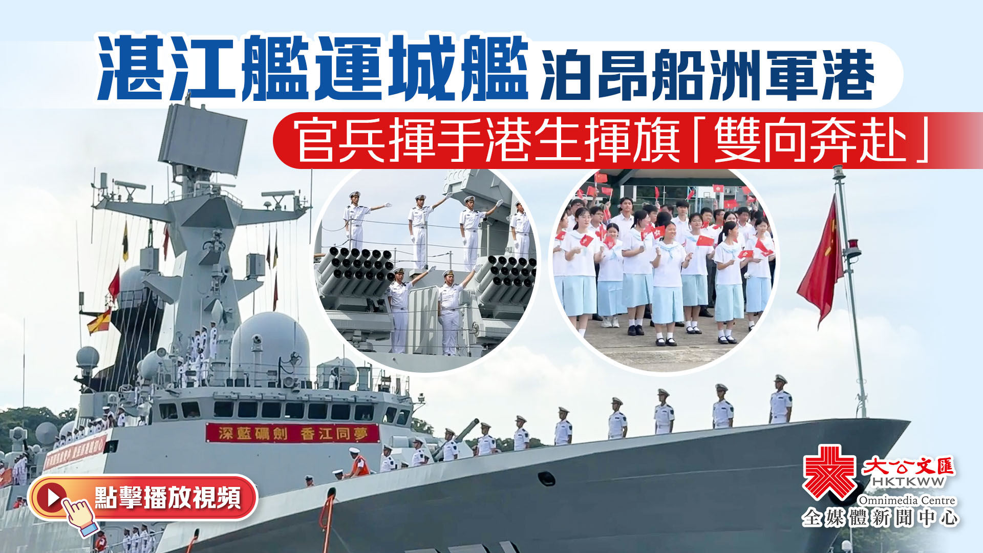 今(3日)早,山東艦航母編隊經東博寮海峽進入香港水域,湛江艦、運城艦停靠昂船洲軍營碼頭。艦上官兵向碼頭人群揮手致意,前來迎接的香港中小學生亦熱情揮舞國旗及區旗,歡迎「國之重器」訪港。