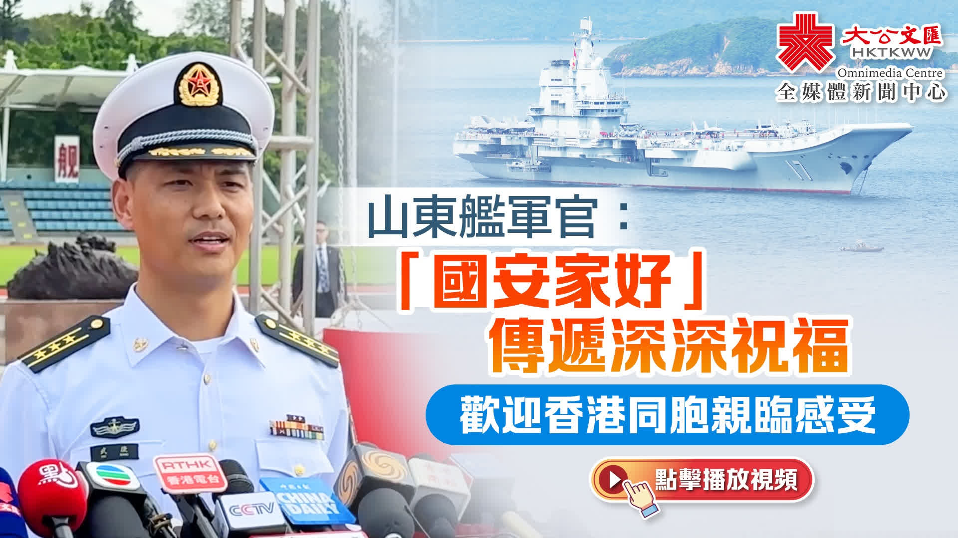 今早(7月3日),由航空母艦山東艦,導彈驅逐艦延安艦、湛江艦,導彈護衛艦運城艦組成的海軍艦艇編隊,經東博寮海峽進入香港水域,開啟一連五日訪港行程。山東艦航母編隊上校軍官武康接受大公文匯全媒體記者採訪時表示,很高興來到香港,途中在艦上看到了維港兩岸靚麗的風景和碼頭歡迎的人群,倍感激動與親切。