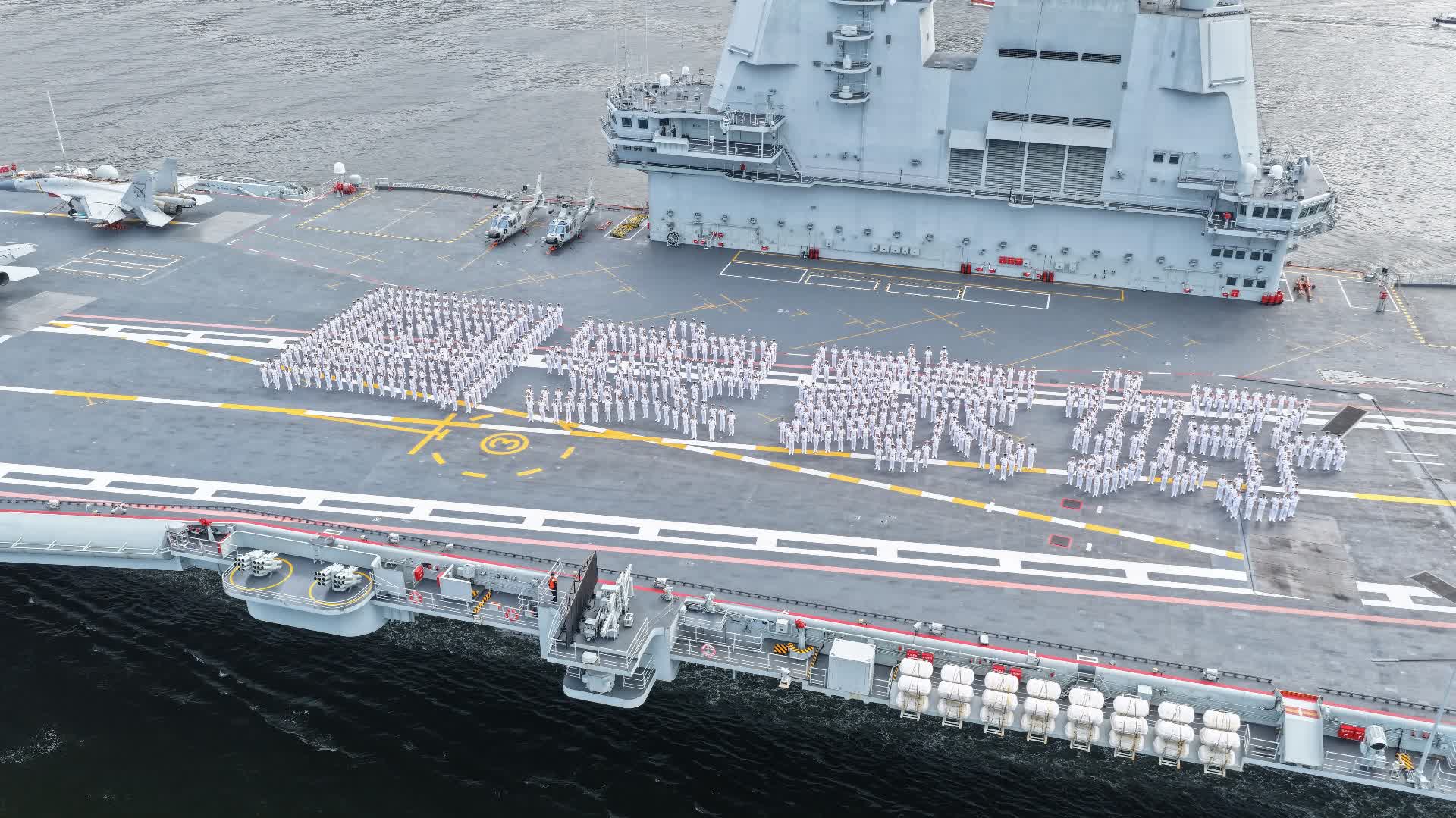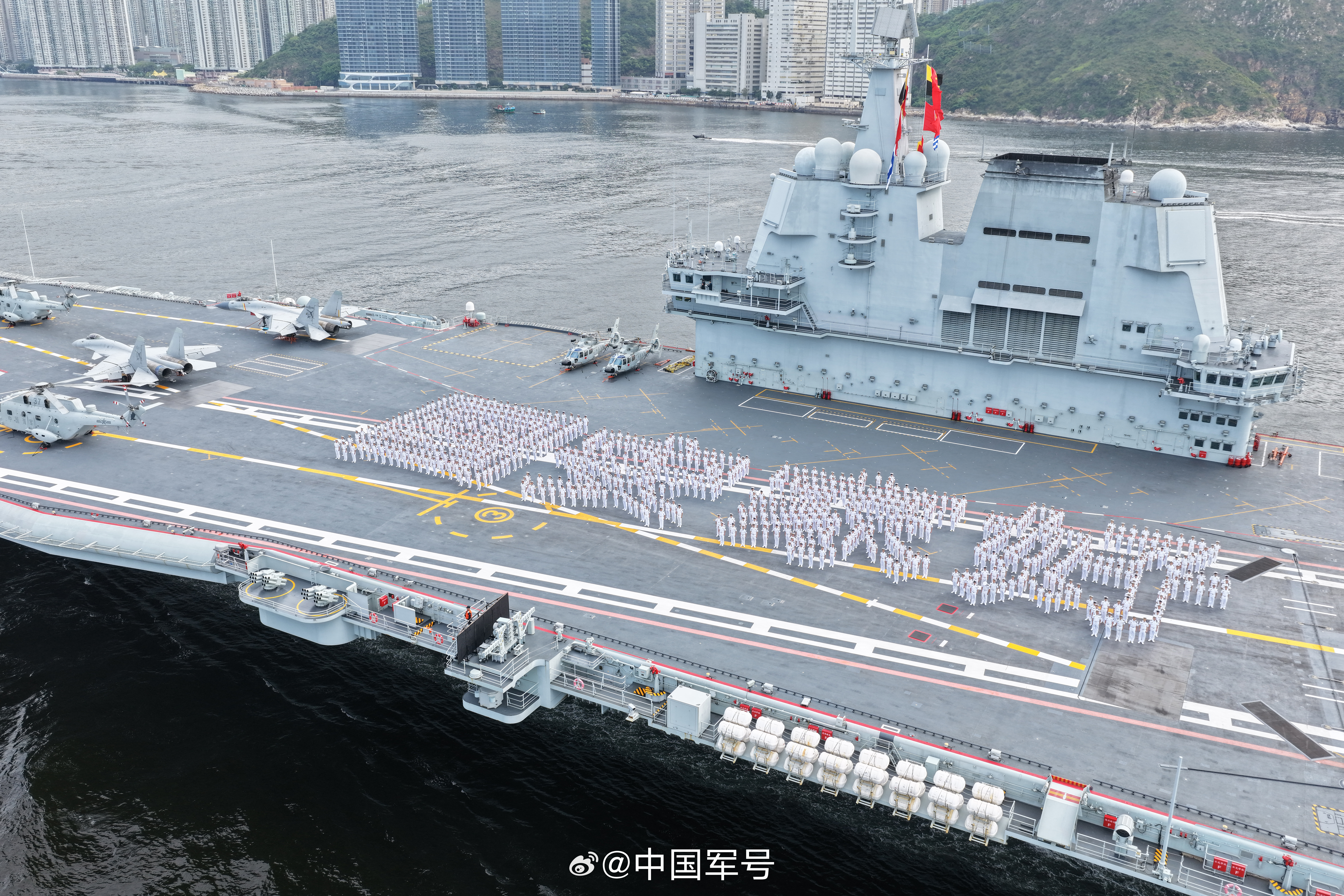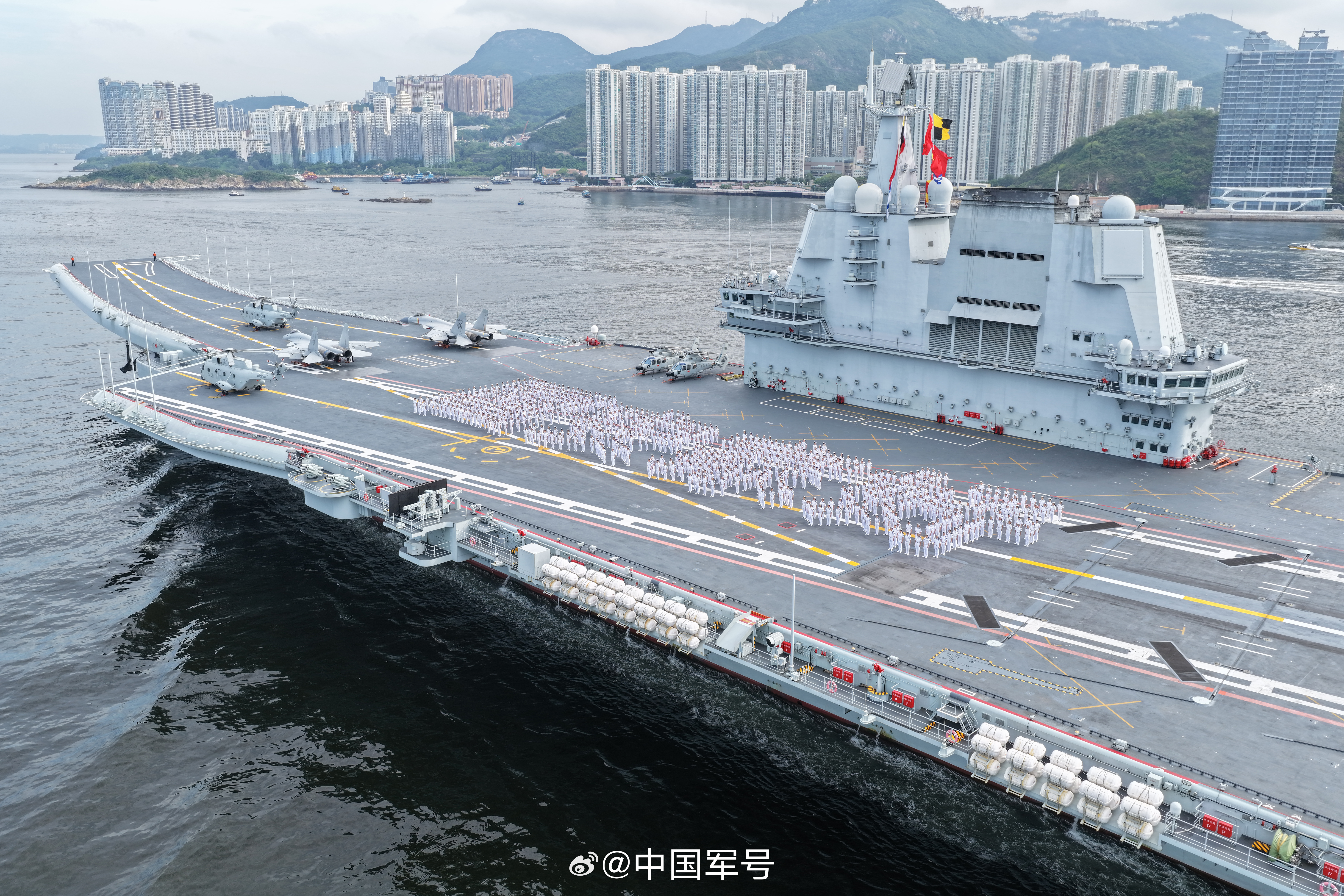大公文匯全媒體報道,我國第一艘國產航母山東艦同055型「萬噸大驅」延安艦、052D型「中華神盾」湛江艦及054A型主力護衛艦運城艦,今日(3日)起一連五日訪問香港。山東艦飛行甲板上,700餘名海軍官兵身着白色軍裝,列隊排出「國安家好」4個大字,表達愛國愛港的濃濃深情和對香港同胞的美好祝福!