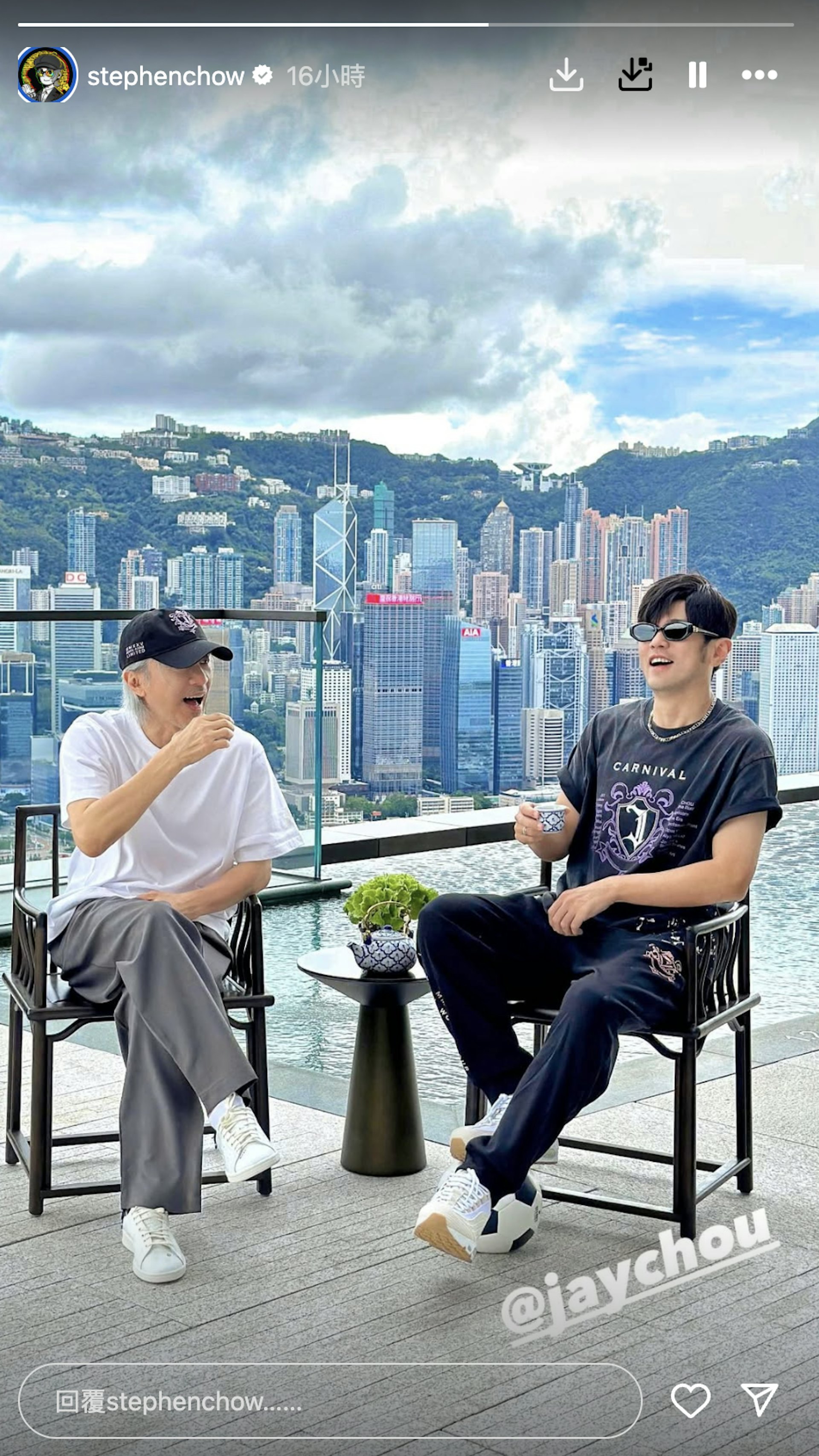 大公文匯全媒體報道,台灣天王周杰倫日前來港完成啟德演唱會後,秘密約見周星馳,兩人分別在IG大曬合照,引起網民熱議。兩人戴上太陽眼鏡一同嘆茶,背景是維港景色,其中周董更腳踏足球,疑似致敬周星馳經典作品《少林足球》。