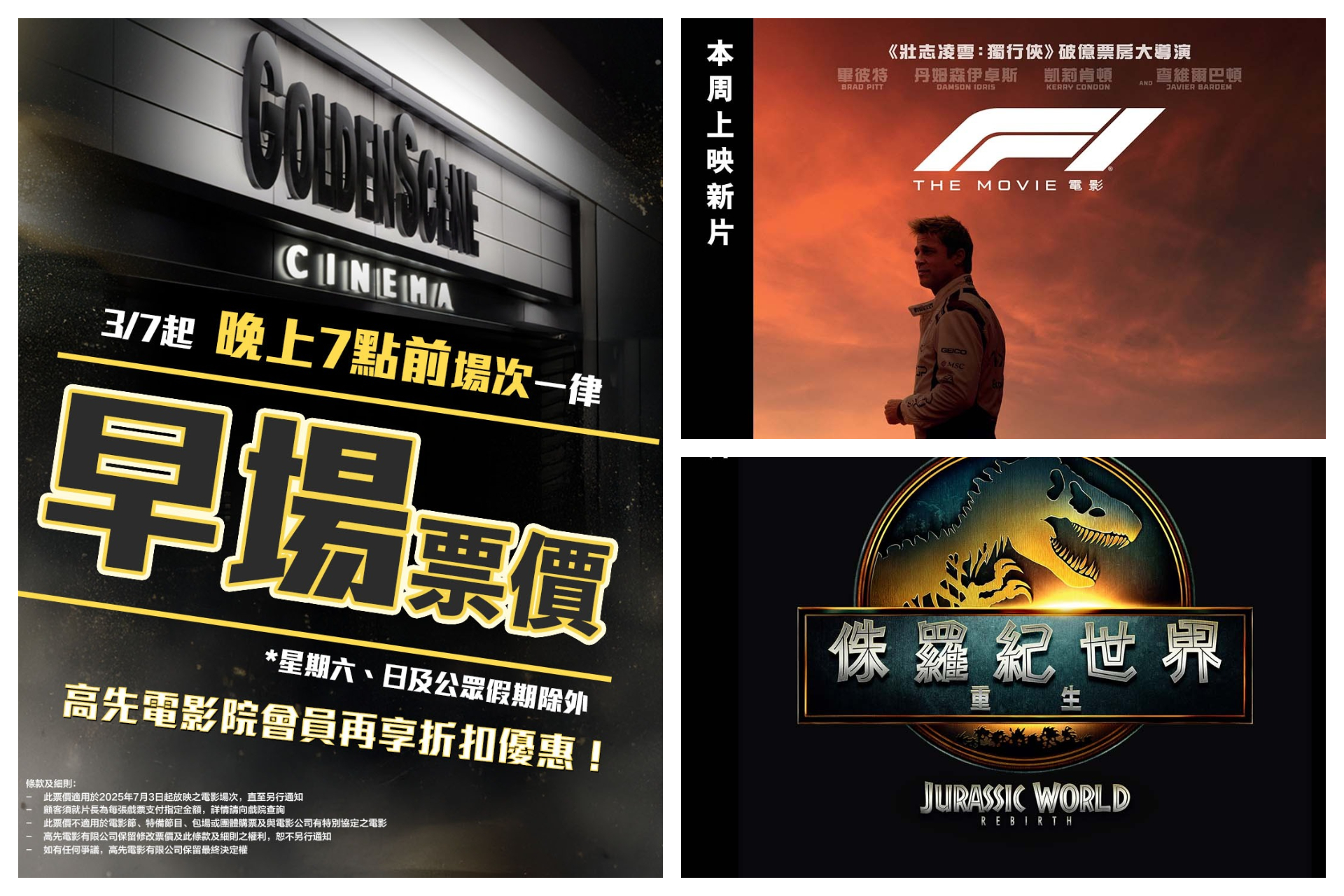 以近期熱映影片為例,由畢彼特主演的熱血賽車電影《F1 Movie》平日售價$115元,優惠後只需$65元就可睇到;《侏羅紀世界》最新篇章——《侏羅紀世界:重生》平日售價$100元,優惠後只需$50元;而迪士尼最新推出《史迪仔》真人電影、馬來西亞現實疊加魔幻題材電影《搖籃凡世》亦以低至$50元票價出售。