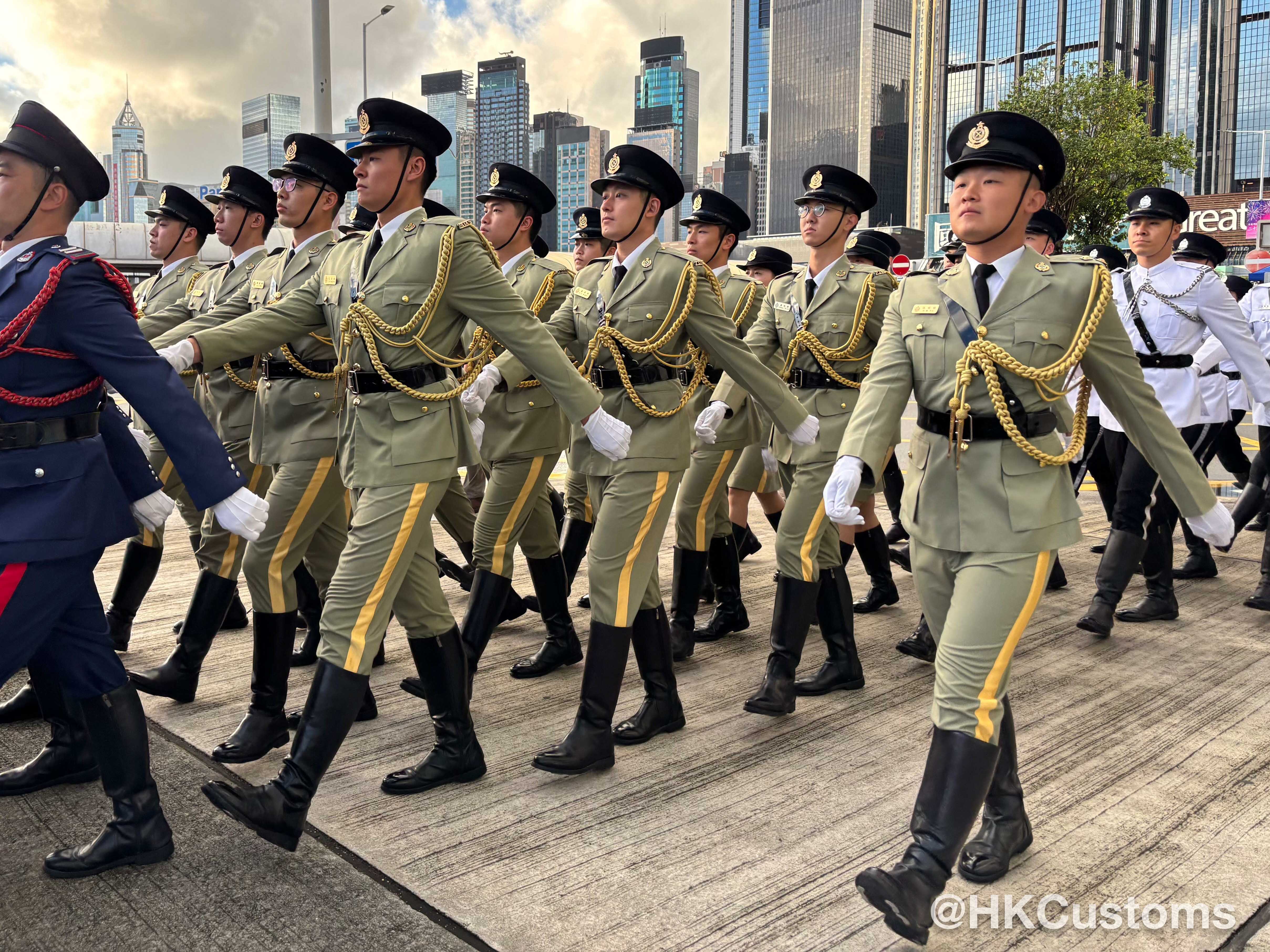 各紀律部隊儀仗隊與制服團隊以整齊劃一的中式步操昂然進場,鏗鏘有力的步伐不僅展現出專業風範,更象徵著香港社會的繁榮穩定與蓬勃朝氣。