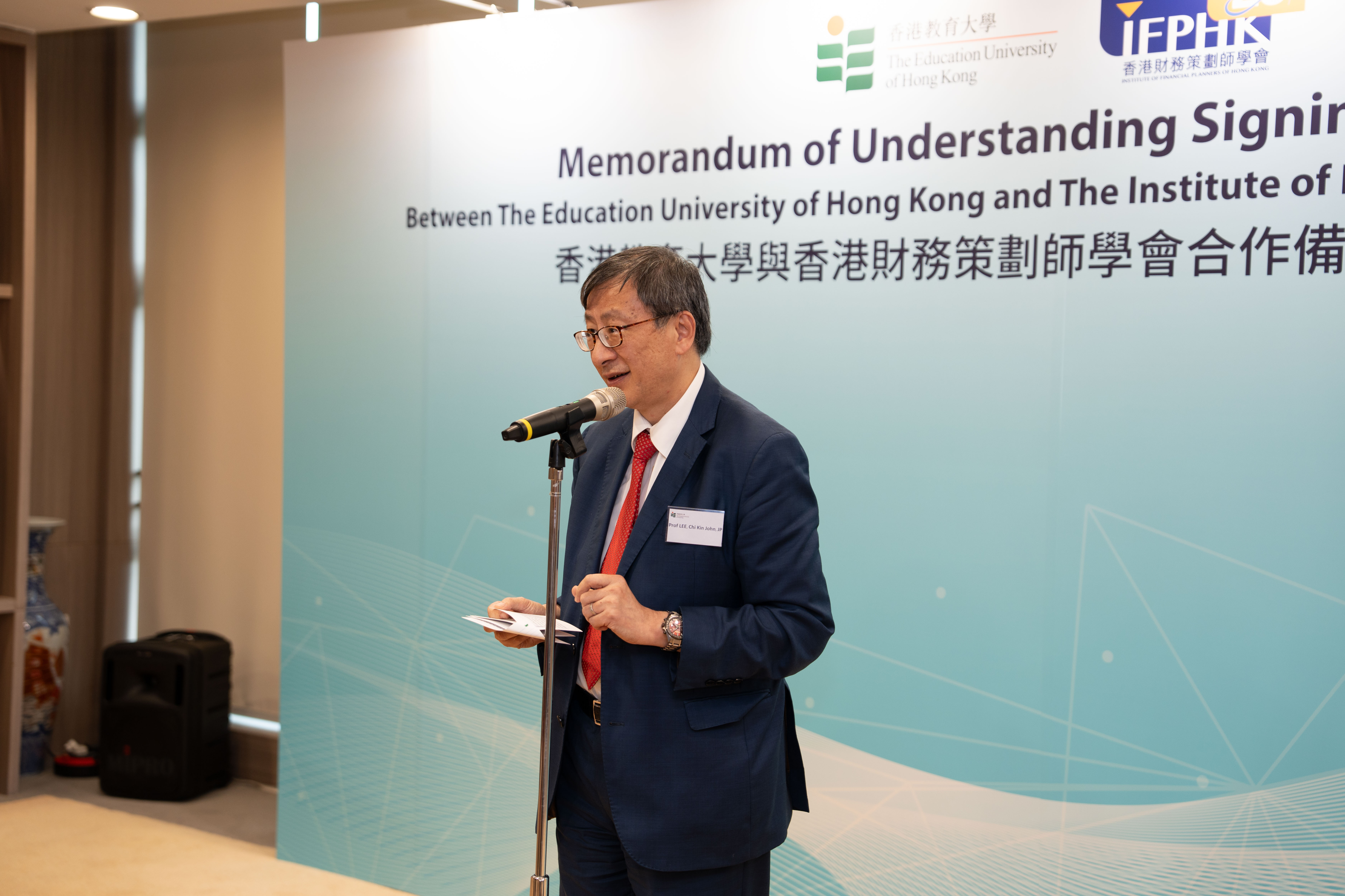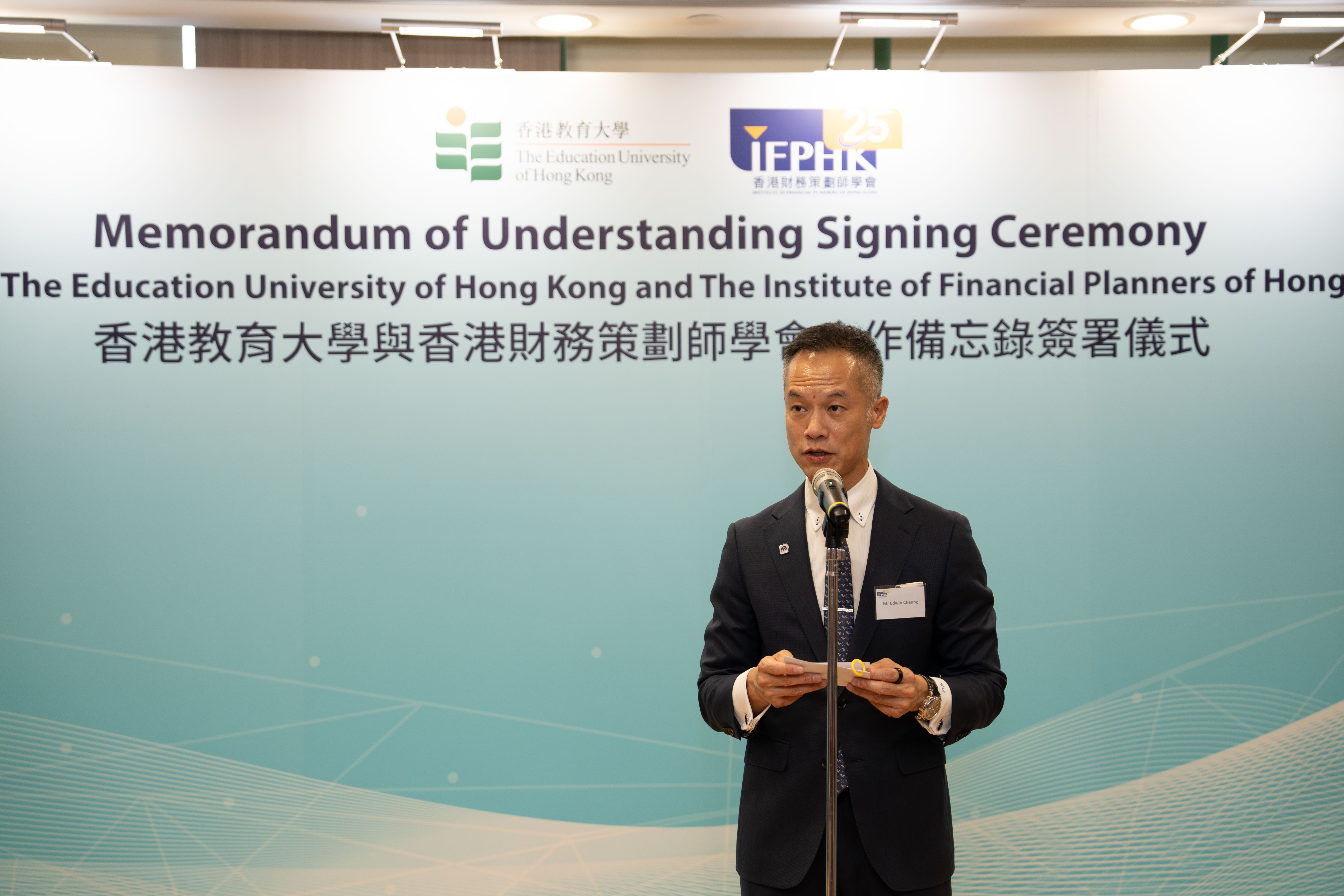 IFPHK主席張言銘先生於致辭時說:「適逢學會成立25周年,此次與教大的合作具有雙重意義。首先,此次合作具有學術銜接及實踐的意義,教大的『個人理財教育文學碩士』課程畢業生直接符合CFP資格認證教育要求,無疑為青年專業人才鋪設職業路徑。其次,此合作具有教育體系擴容的意義,教大即將開辦的『個人理財榮譽文學士』課程,進一步完善財務策劃人才培養梯隊。最後,我們特別感謝教大校長李子建教授的卓越領導,共同推動香港國際財富管理中心建設。」