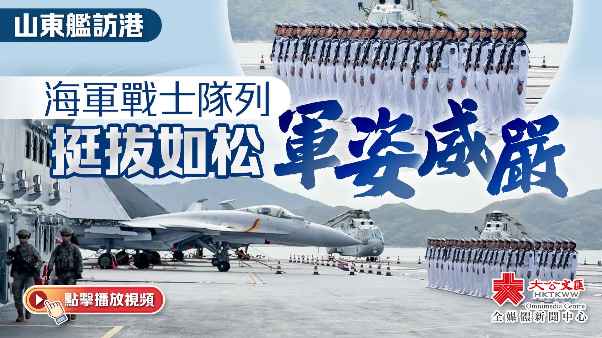 大公文匯全媒體記者在現場觀察到,山東艦飛行甲板上,海軍戰士隊列整齊有序。他們挺拔如松,軍姿威嚴,只有軍裝褲在風中飄動。