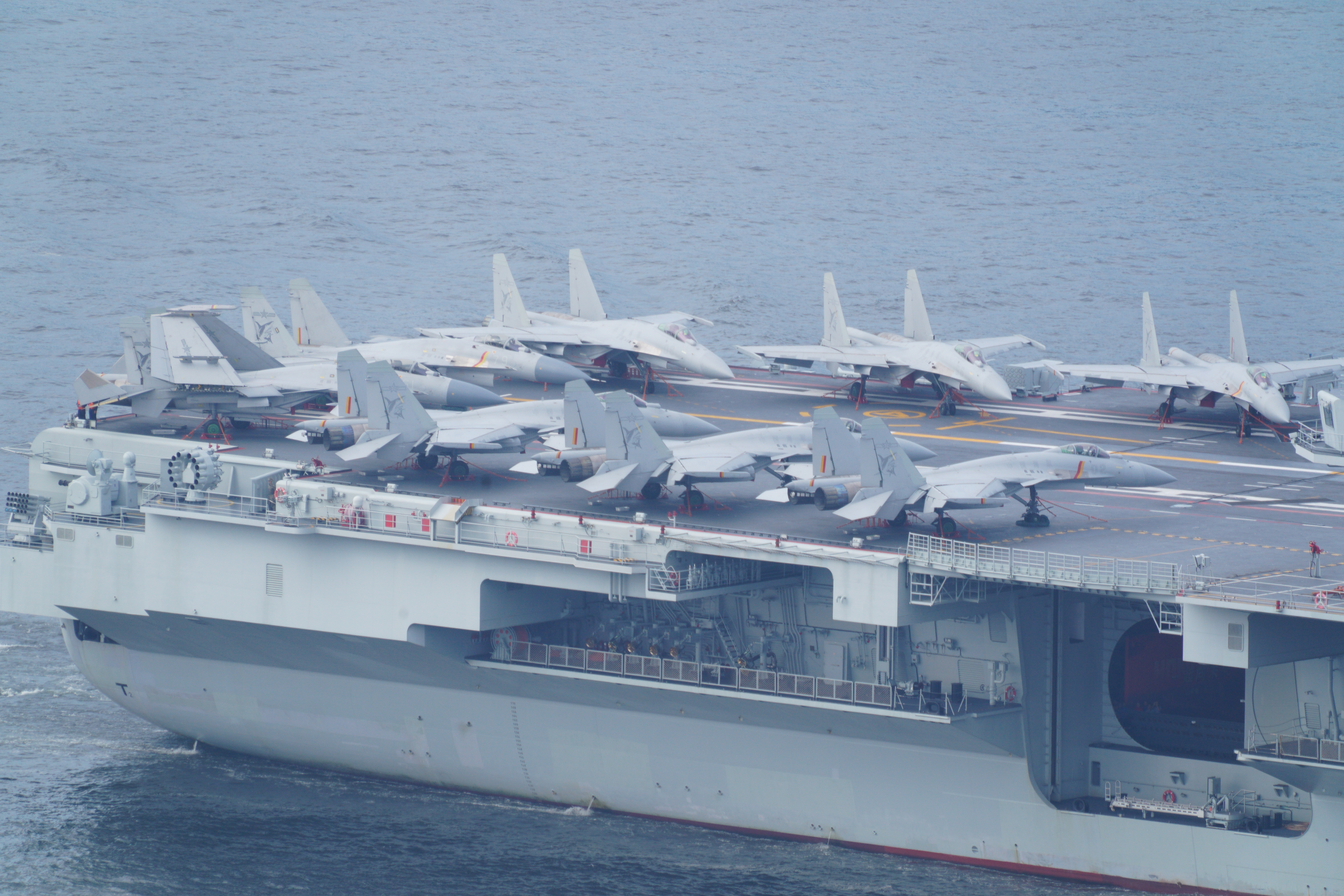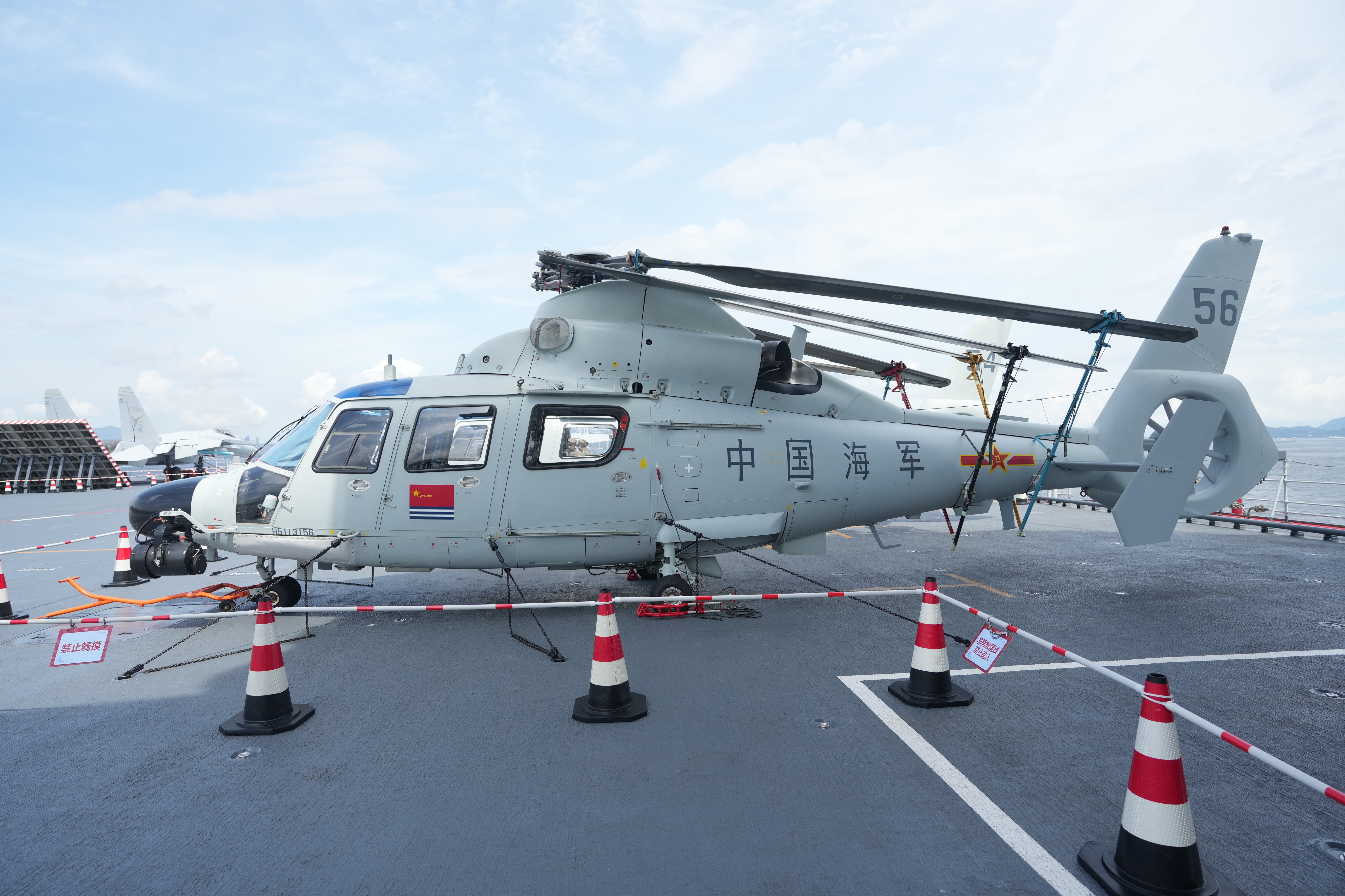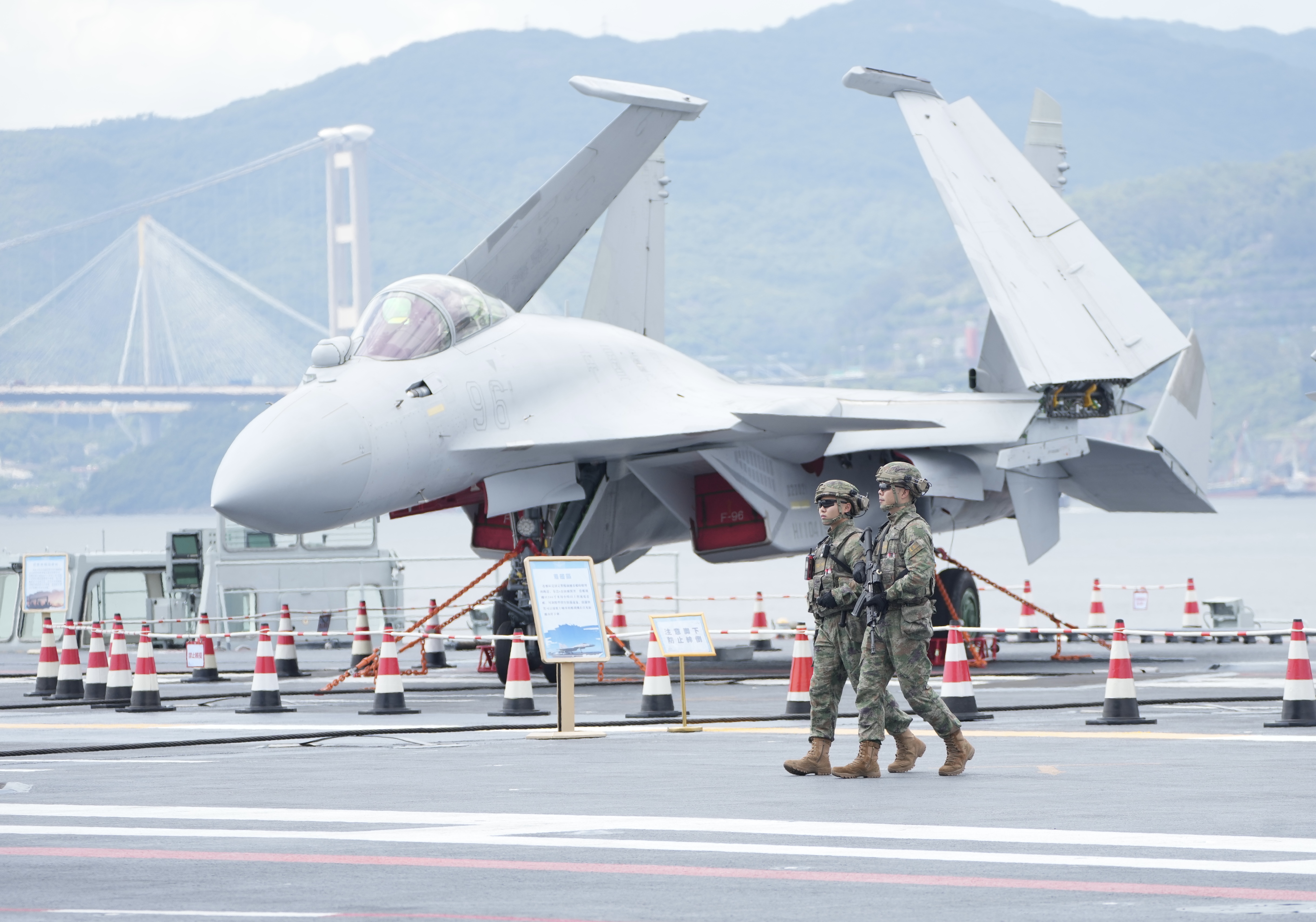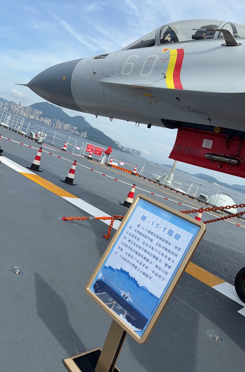 首先進入視野的就是備受矚目的殲-15、殲-15T展示區,兩者雖同屬中國海軍艦載戰鬥機序列,但在技術代際、外觀設計、作戰性能等方面存在顯著差異,殲-15T重點對起落架進行加固,還優化了武器系統,可以掛載多種新型導彈,雷達探測範圍更遠、功率更大,探測和打擊對抗能力顯著增強。有機會登艦近距離觀摩的市民不妨多多留意。