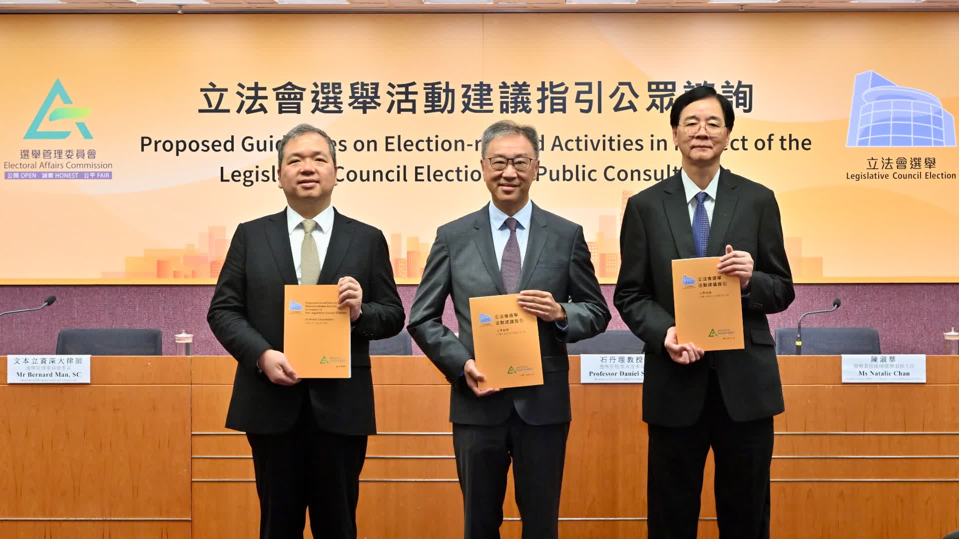 選管會主席陸啟康今日在記者會表示,制定選舉活動指引的目的,是要透過簡單語言,解釋現行選舉法例條文,以提醒候選人及其他相關人士選舉法例的規定和要求,並就法例未有涵蓋而與選舉有關的活動,以公平及平等的原則,訂立行為守則。建議指引可在選管會網站下載,或於選舉事務處辦事處、各區民政事務處民政諮詢中心和各主要及分區公共圖書館查閱。
